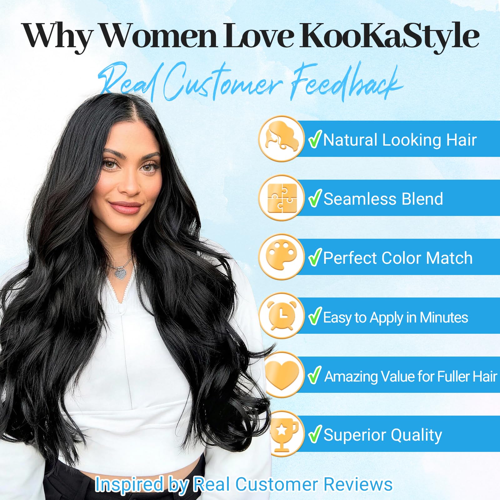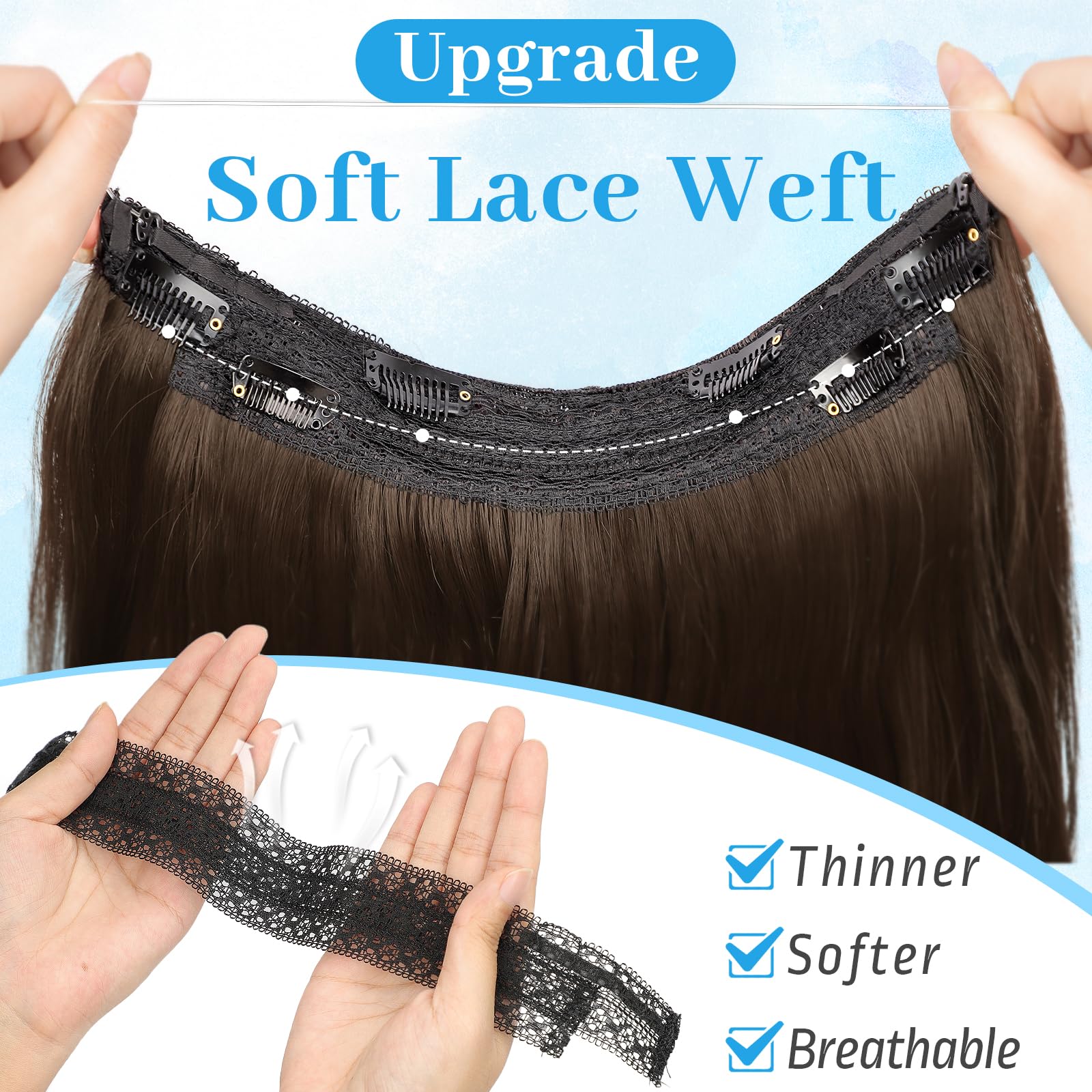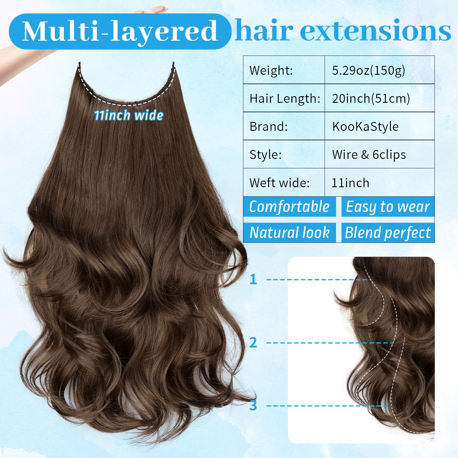【Get Layered Hair In Seconds】 Invisible wire hair extensions is the easiest and quickest tool for adding volume and length. Anyone can do it!KooKaStyle invisible wire hair extensions with new upgrade!Thinner&softer&Breathable double weft,lighter&fluffier Synthetic heat-resisting fiber,Make it perfectly blend with our hair and create a hair salon effect at home.