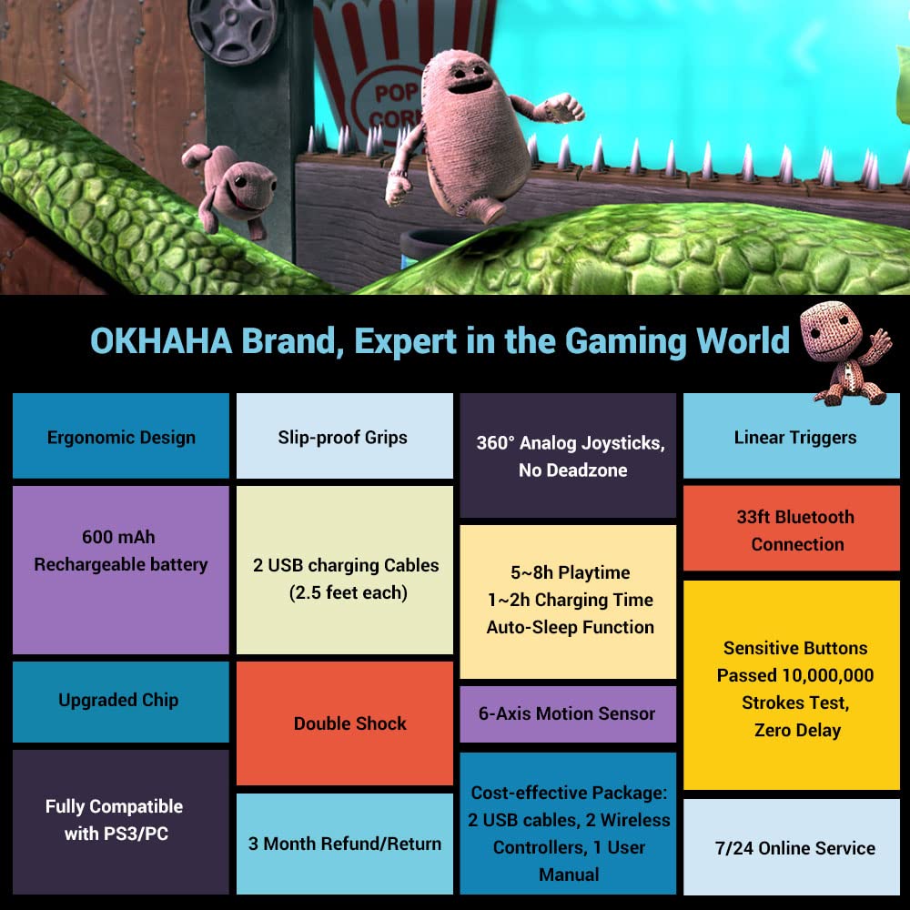 【Long Battery Life & Long Bluetooth Connection Distance】Remote for PS3 with a large battery capacity of 600mAh, providing 5~8h long playtime (auto-sleep function is provided for saving power).