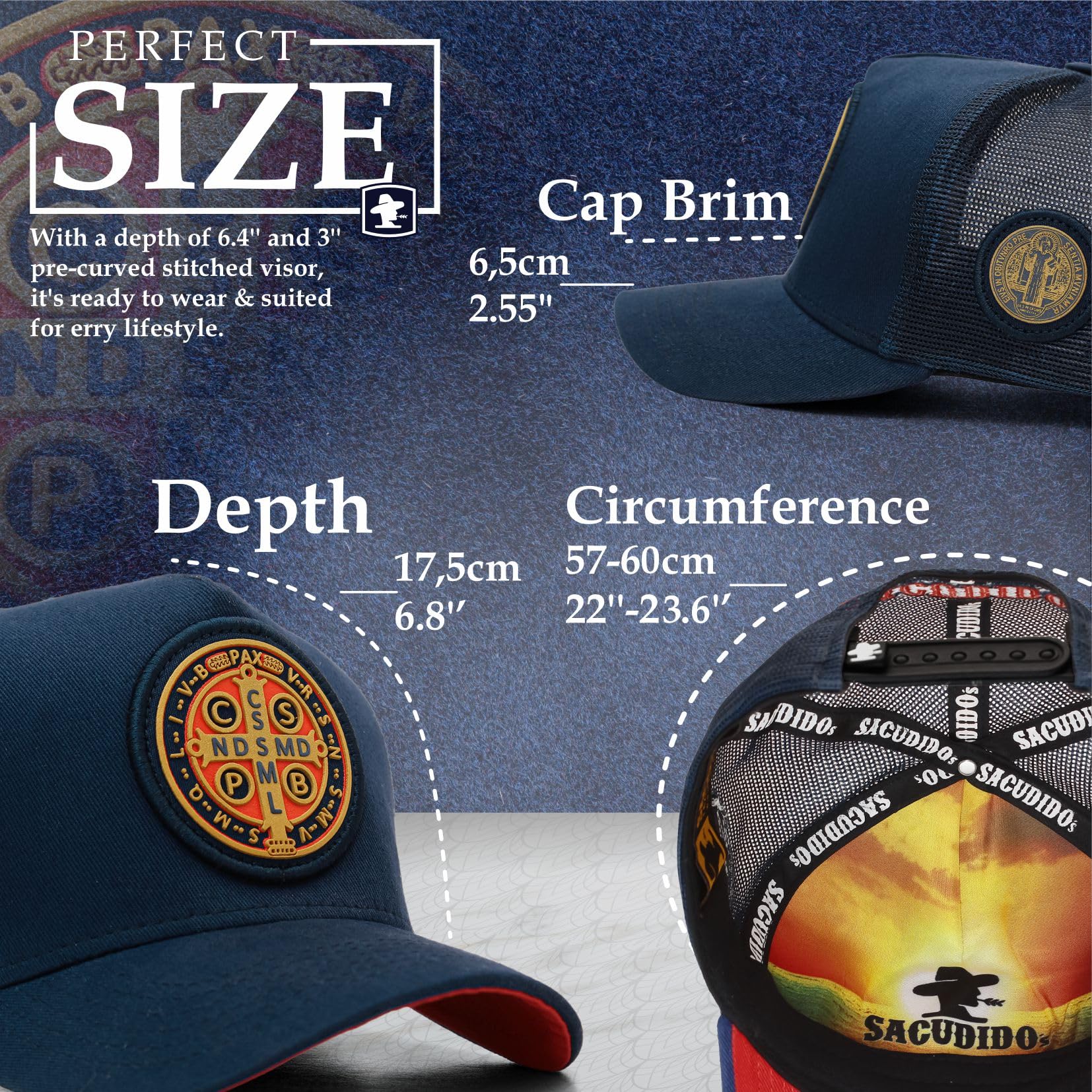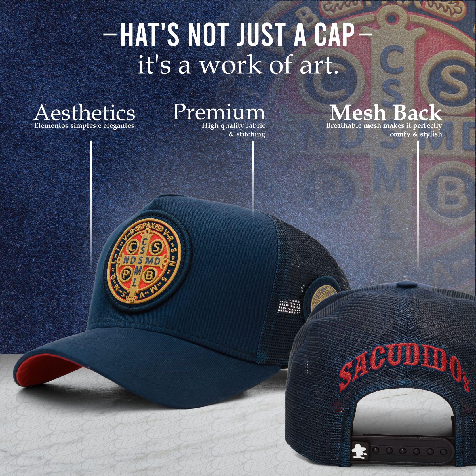 ABOUT THE PRODUCT: The Sacudido's cap featuring Saint Benedict for men and women is exceptionally comfortable and durable. Made with a premium blend of polyester mesh and suede fabric, it includes a laser-designed front pach, soft sweatband, custom internal lining, high-durability mesh, reinforced stitching, and an adjustable strap for a perfect fit.