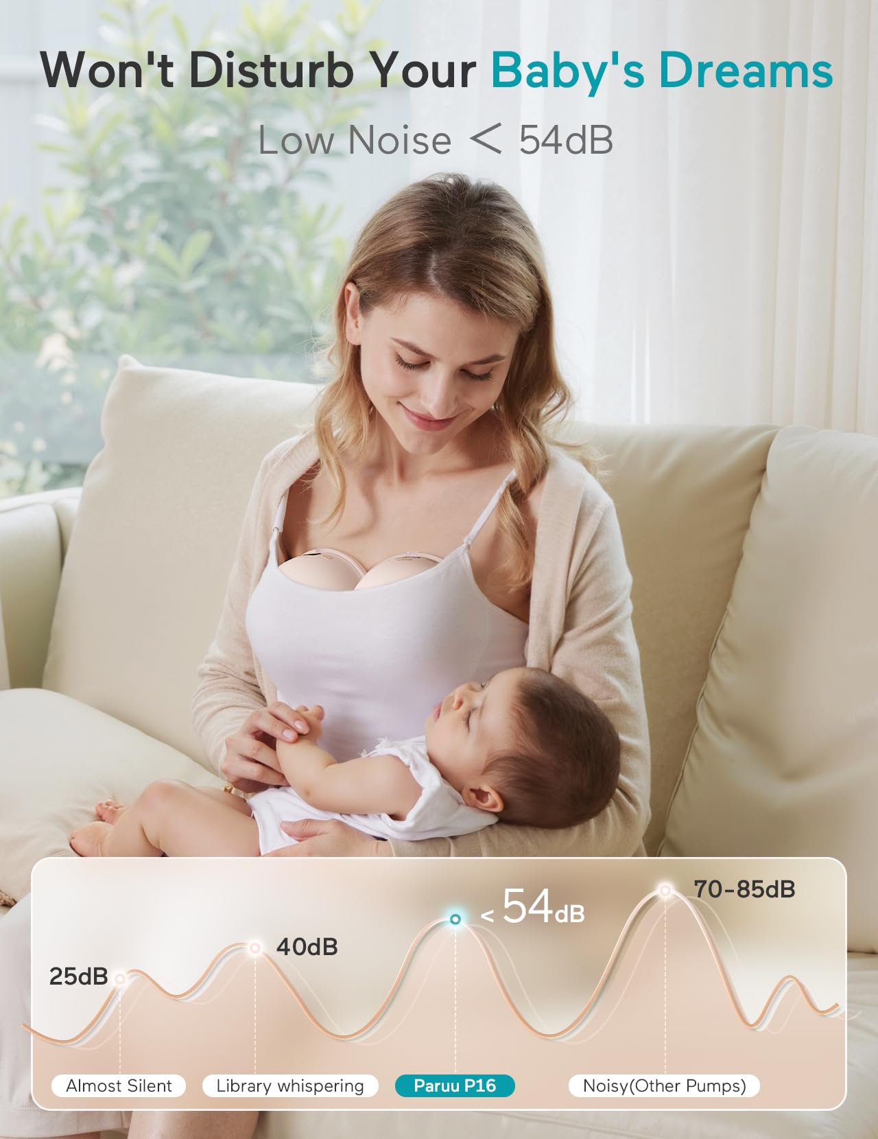Lighter & Hidden: Paruu P16 breast pump only 240g, Only 2/3 the size of a manual breast pump. It is a truly wearable breast pump, fits snugly around your bra and breasts, provides better hidden and comfort. Help busy mothers free hands, no occasion restrictions freedom to pump anytime, anywhere.