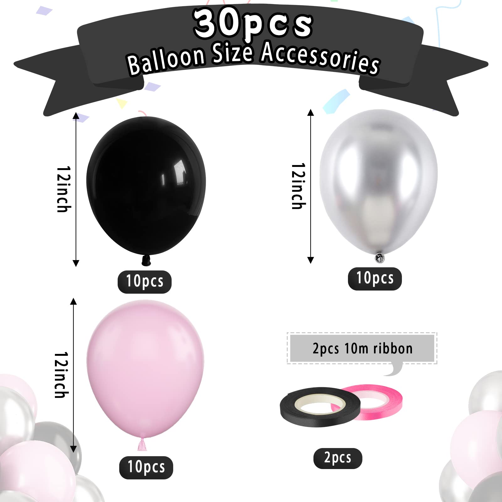 Mixed Balloons Set: The 12 inch pink and black balloons set includes 10pcs metallic silver balloons, 10pcs macaron pink balloons, 10pcs matte black balloons, 2 roll of ribbon. 32pcs in total. Vibrant colors give you a impressive party and make some unforgettable fond memories.