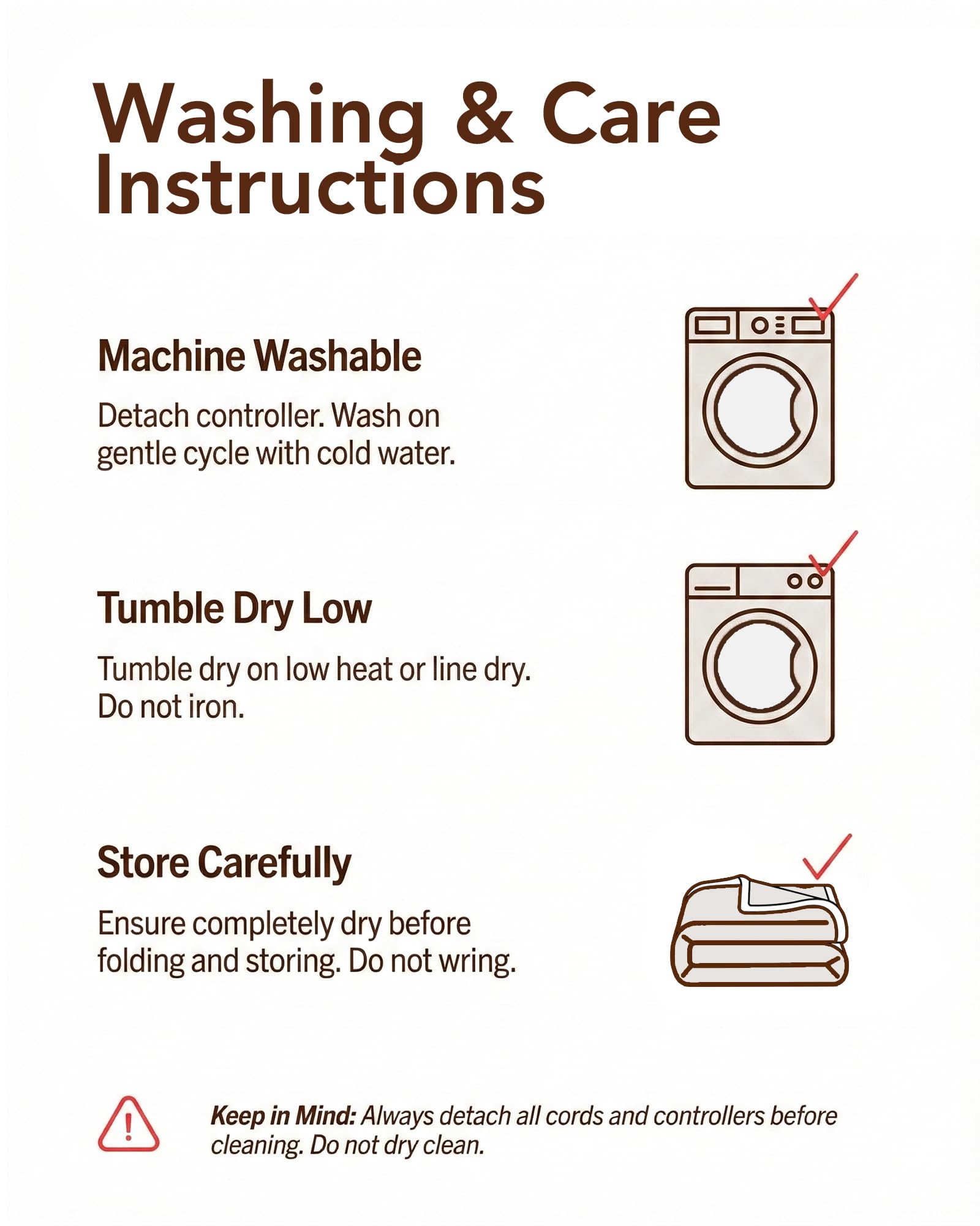 MACHINE WASHABLE: Homemate Heated blankets can be machine washed, but please read the instructions carefully before cleaning to avoid improper operation, which can avoid safety problems and prolong the service life of electric blankets.