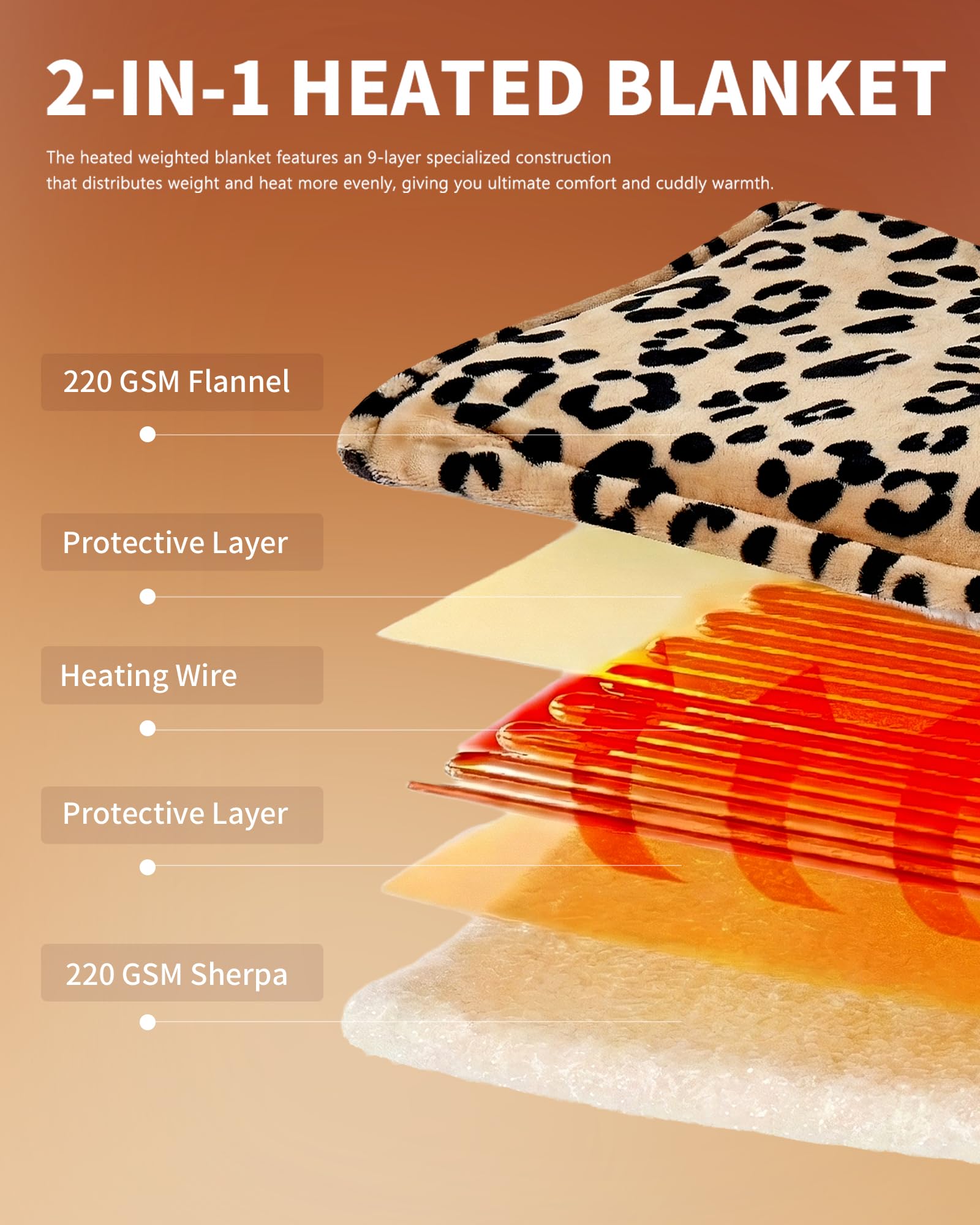 PREMIUM MATERIAL: 200gsm flannel + 200gsm sherpa.The fabric is very soft,thicker than normal blankets,and warmer than normal blankets even without electricity.The fabric is durable and does not shed.The diameter of the heating wire is 2.2 mm,and the existence of the heating wire is hardly felt during use,which is more comfortable.