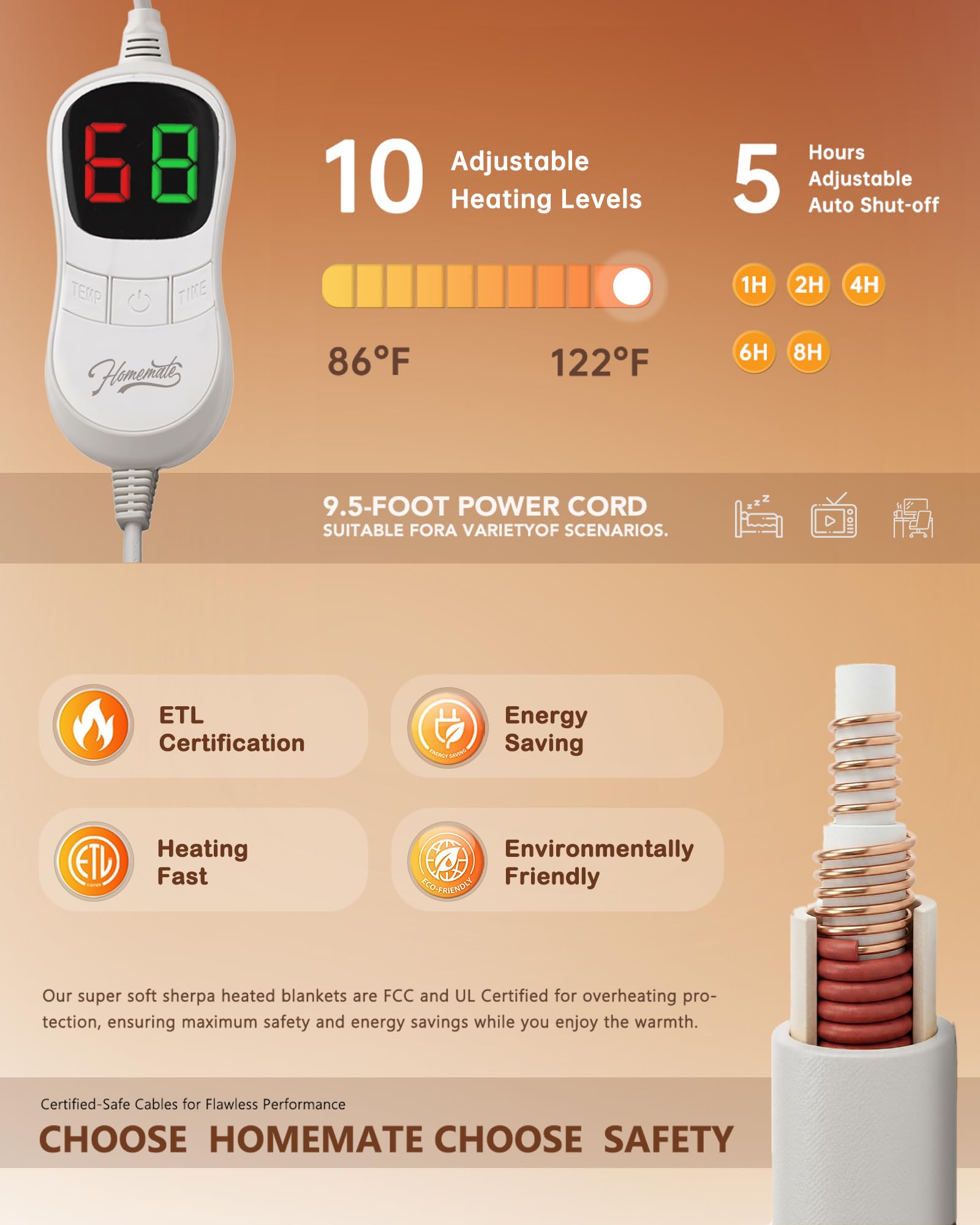 EASY TO USE: Homemate heated blanket have 10 heat levels,1/2/4/6/8 hours auto shut off.Temperature range is 86-122°F.Very convenient to use,even the elderly,the sick,and the disabled can use it easily.Power Cord is 16.7 feet,this long cord makes the use of the blanket more flexible,can be used on the bed,on the sofa,can be used in the study and office,very convenient.