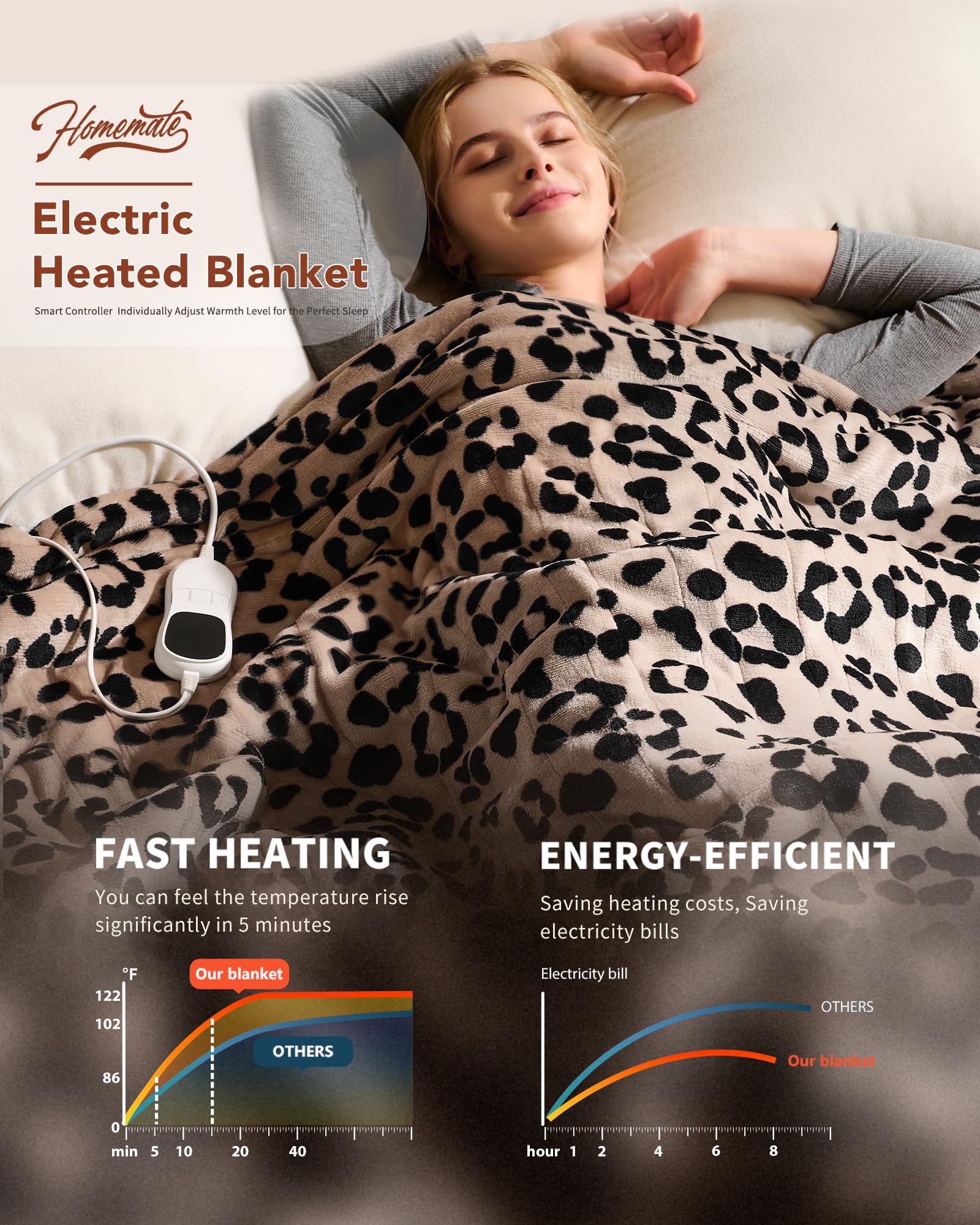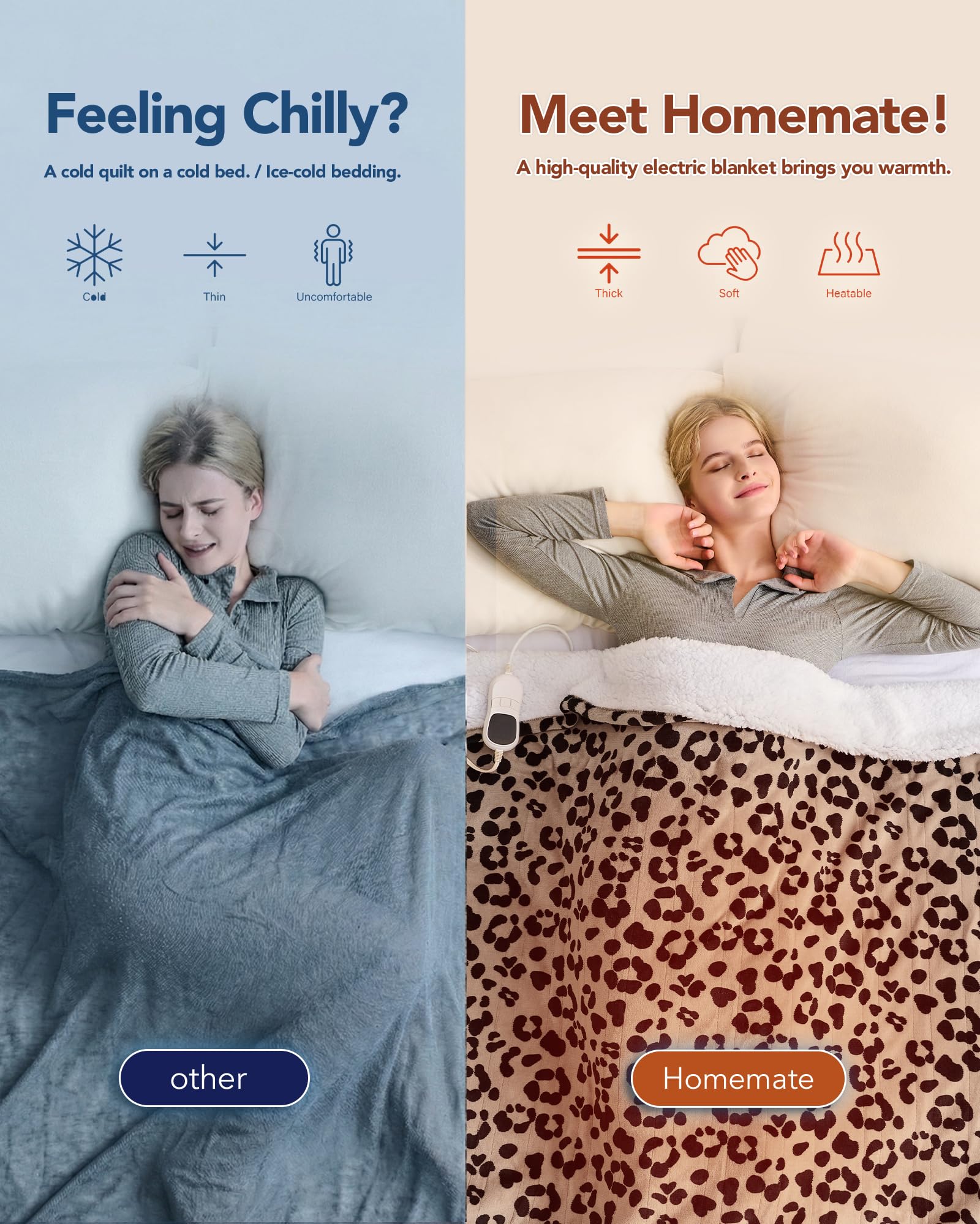 ENERGY SAVING: Homemate heated blanket use the intelligent temperature adjustment technology.When the temperature rises,the heated blanket will automatically adjust the temperature according to the surrounding environment,which can always provide users with a comfortable feeling and is conducive to energy saving.Compared with air conditioner,using Homemate heated blanket is more energy efficient,and you can save more heating costs in winter.