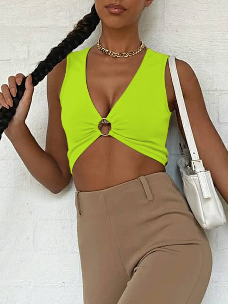 Design of the deep v neck and the silver ring center piece keeps the y2k top away from the ordinary. This cute tops can go well with jeans, shorts and high heels well