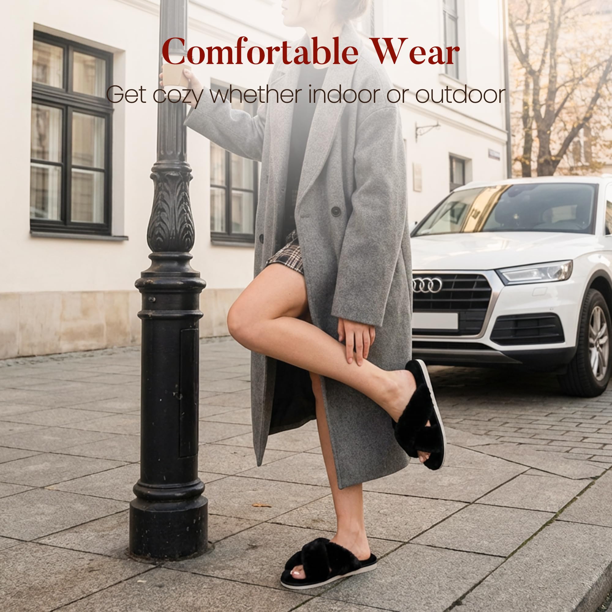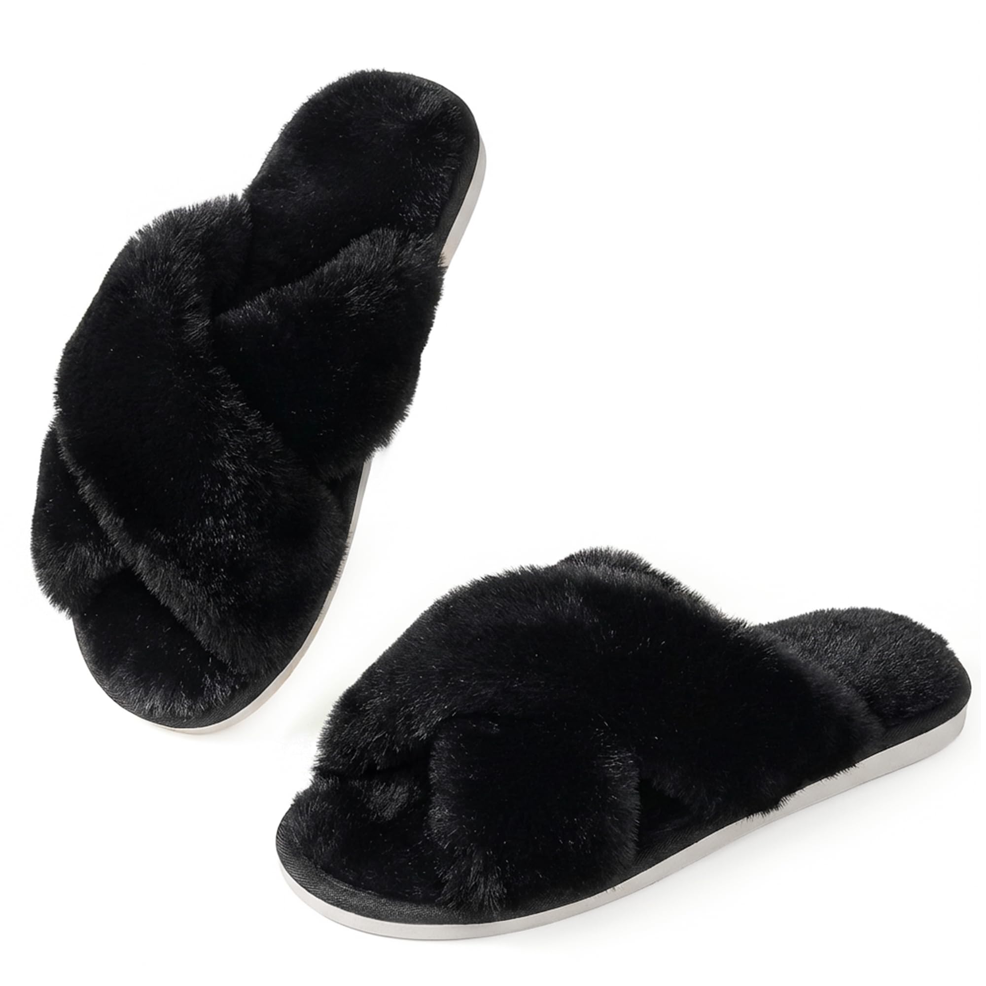 Chic Must-Have Slippers for Women: Ankis fuzzy slippers feature a trendy cross-band design that looks cute and stylish. The open-toe style makes them easy to slip on anytime. Soft plush faux fur keeps your feet cozy while staying breathable for all-day comfort at home