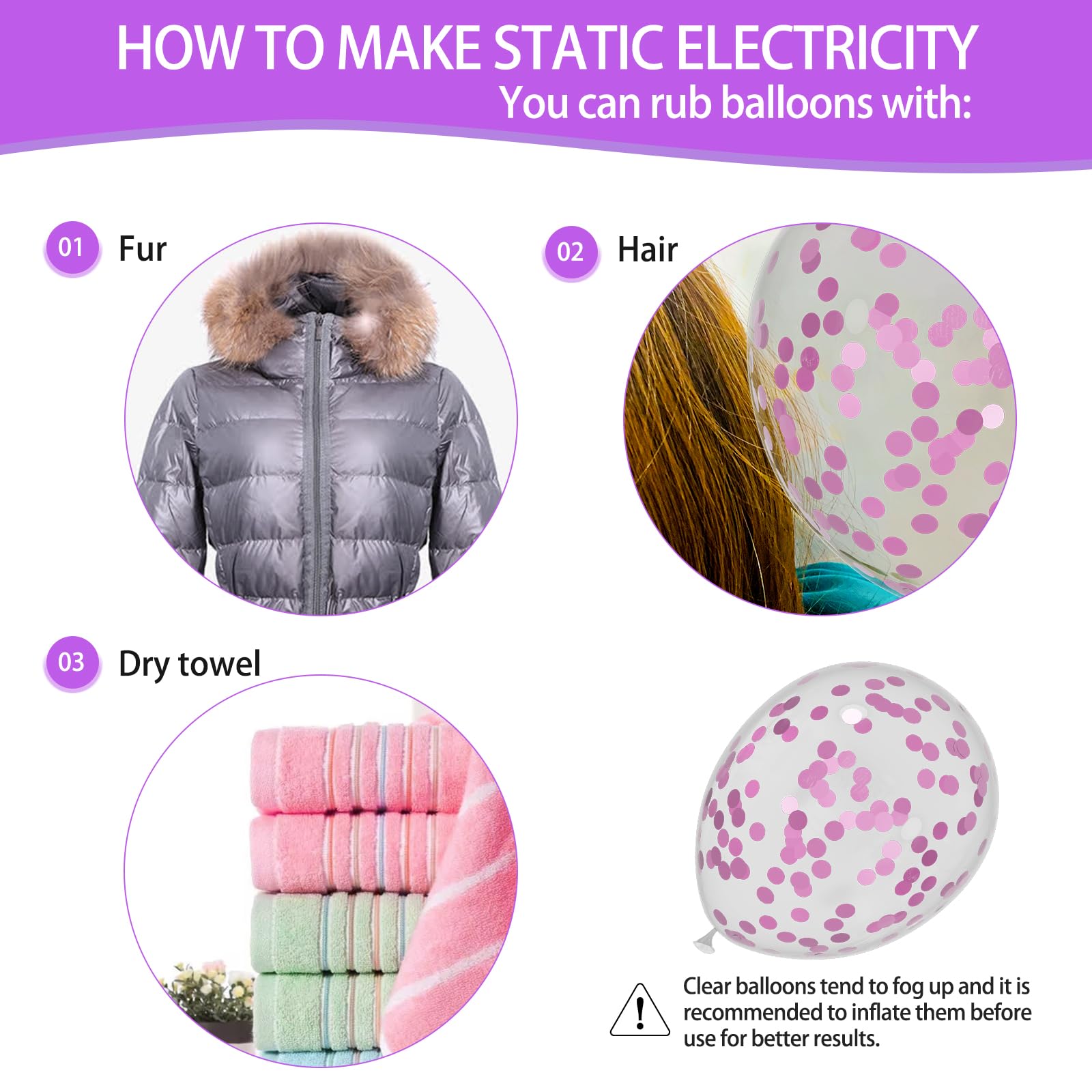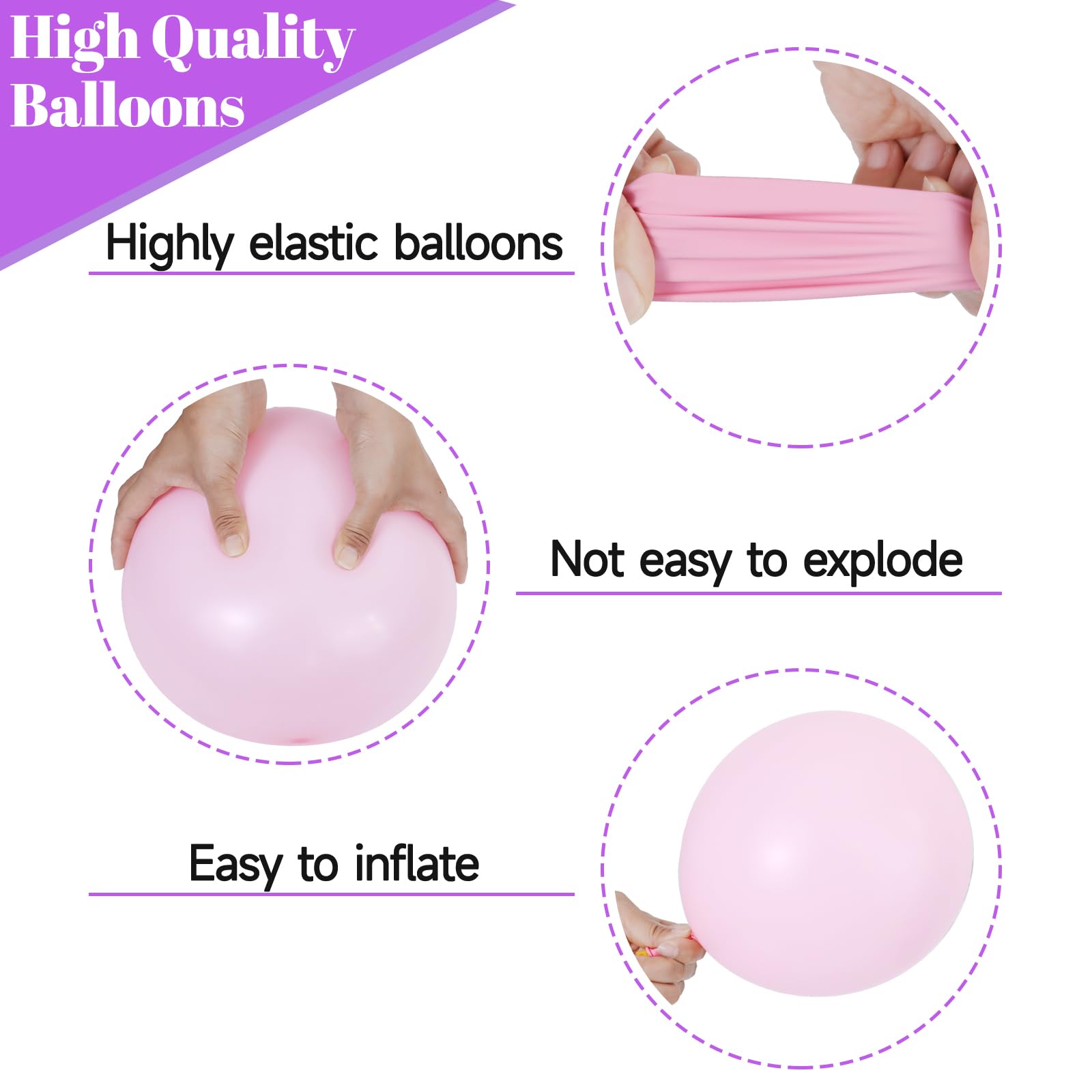 68 pieces of pink and purple balloons set is easy to create a dreamy scene. Contains 68 pieces of 12 inches latex balloons (including 16 pieces of macaron purple balloons, 16 pieces of macaron pink balloons, 8 pieces of metallic purple balloons, 8 pieces of metallic pink balloons, 10 pieces of purple confetti balloons, 10 pieces of pink confetti balloons, the additional ribbons in the package allows you to easily tie the balloons.