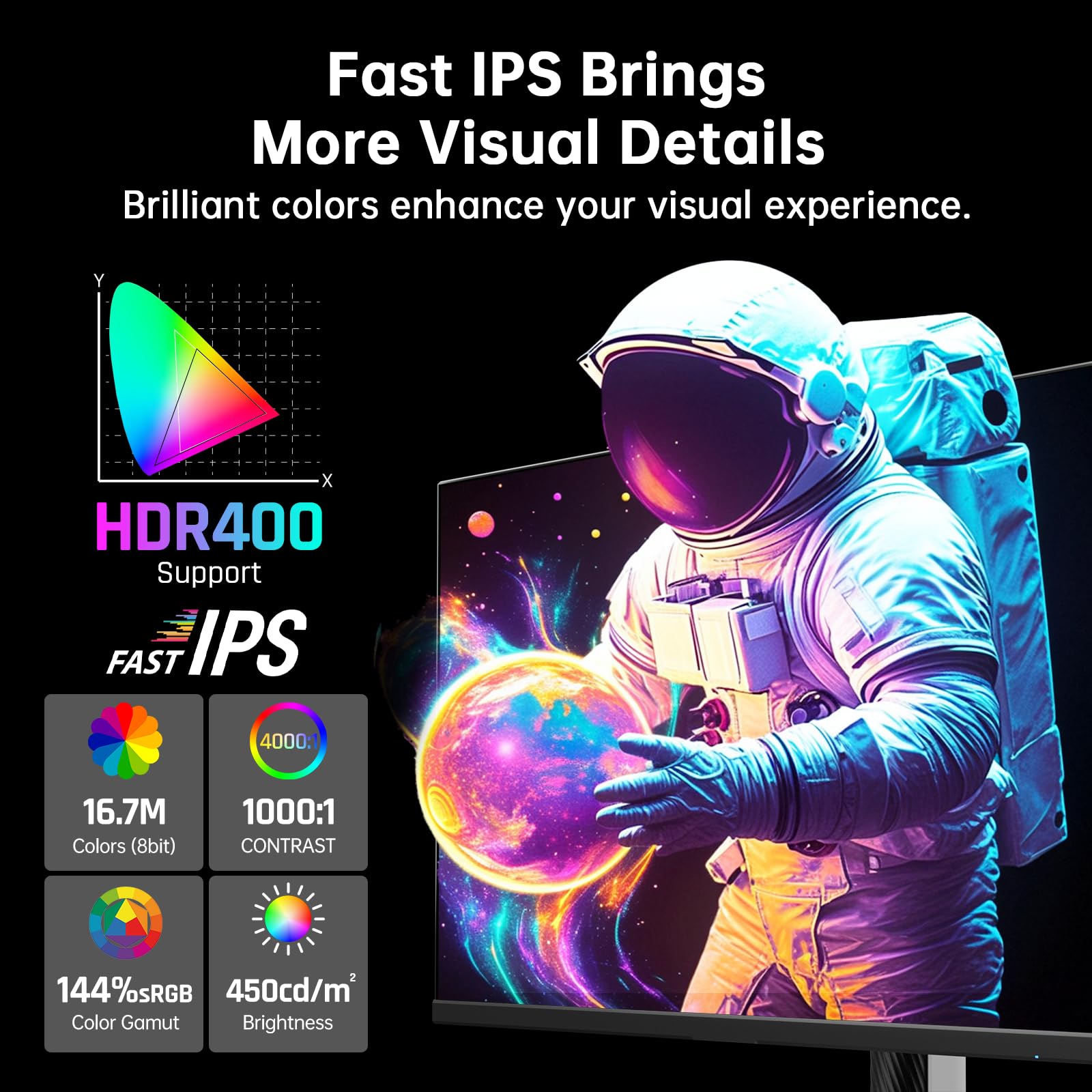 Vivid Color and Eye Care: The 27" white gaming monitor has Fast IPS panel, enjoy 144% sRGB color accuracy, you get consistent, vibrant colors across wide viewing angles. With 450cd/m² brightness and 1000:1 contrast ratio, visuals are clear and vivid. Flicker-free and a blue light filter reduce eye fatigue, allowing you to watch comfortably for hours, whether you're playing games, working, or watching movies.