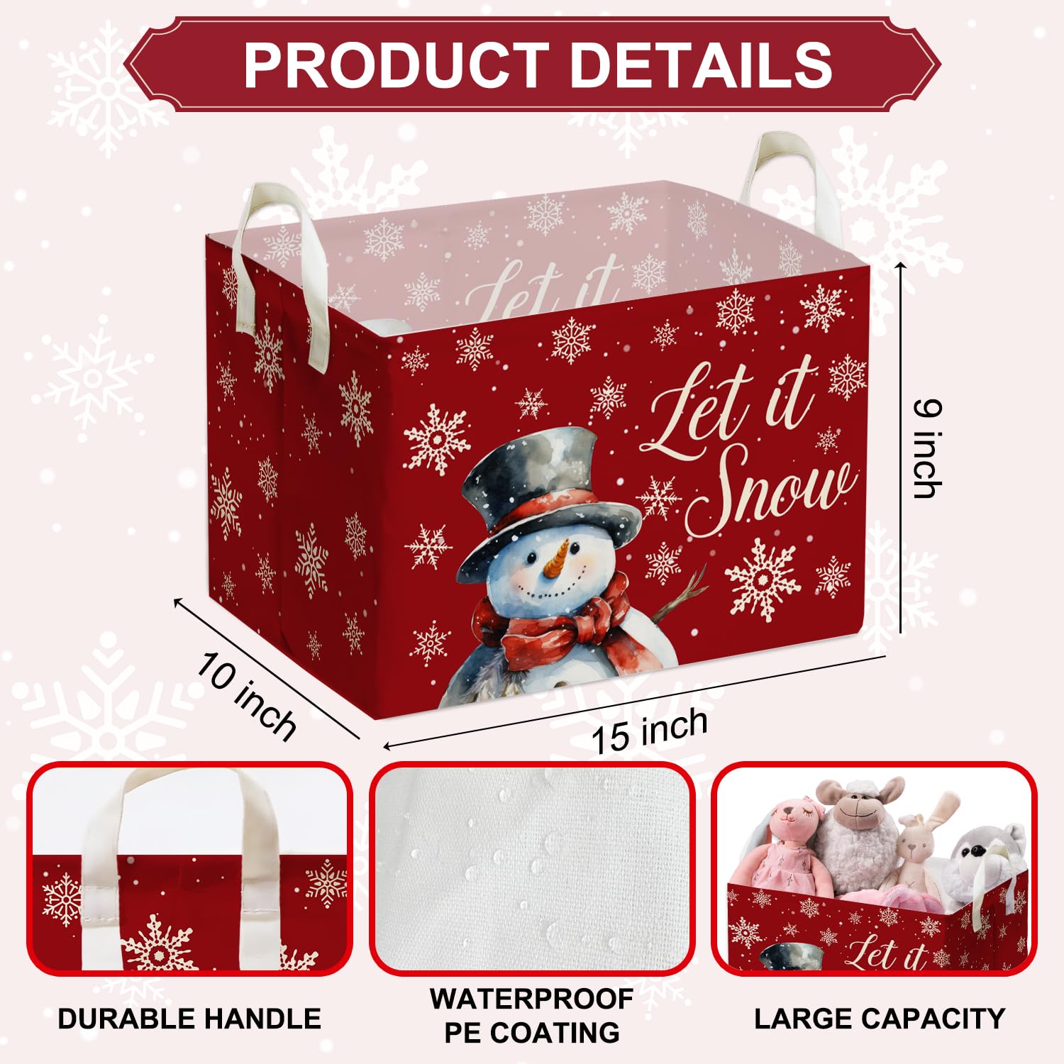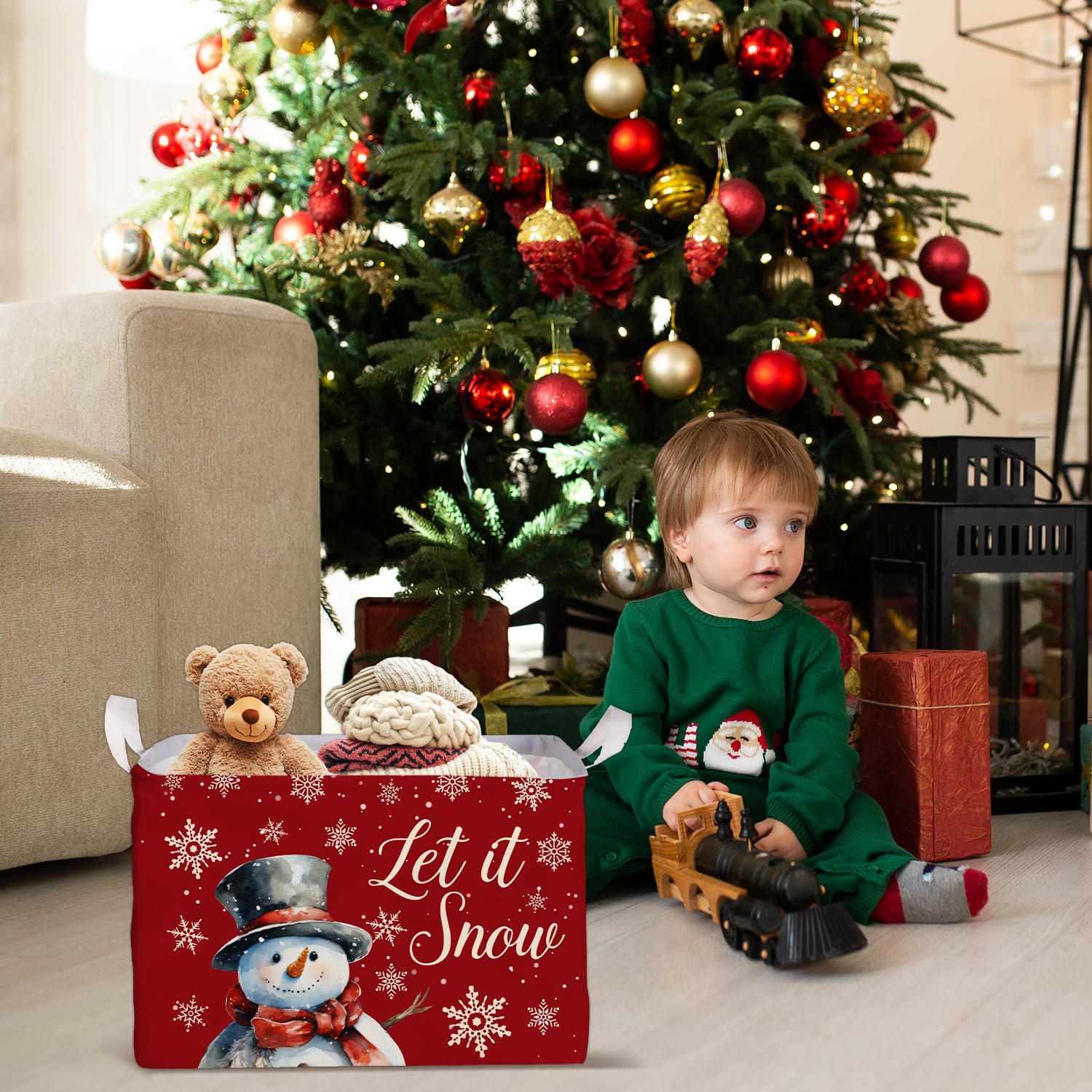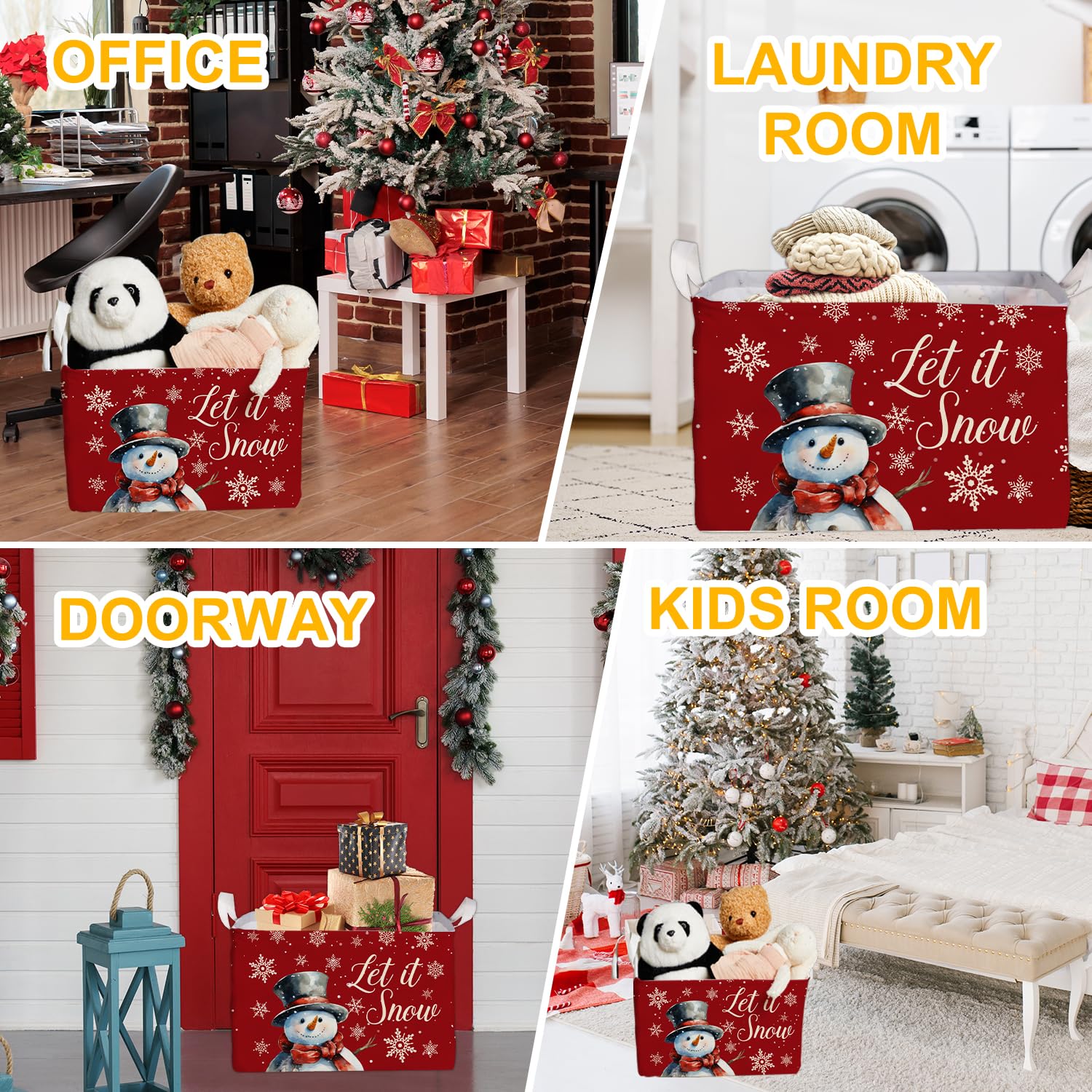 Spacious Size: This rectangular snowman basket 15 x 10 x 9 inches provides ample storage space for toys, books, clothing, gifts or holiday items, perfect for keeping your home organized during Christmas. Designed with side handles for easy carrying, it can be folded flat when not in use, saving space and convenient for storage all year round.