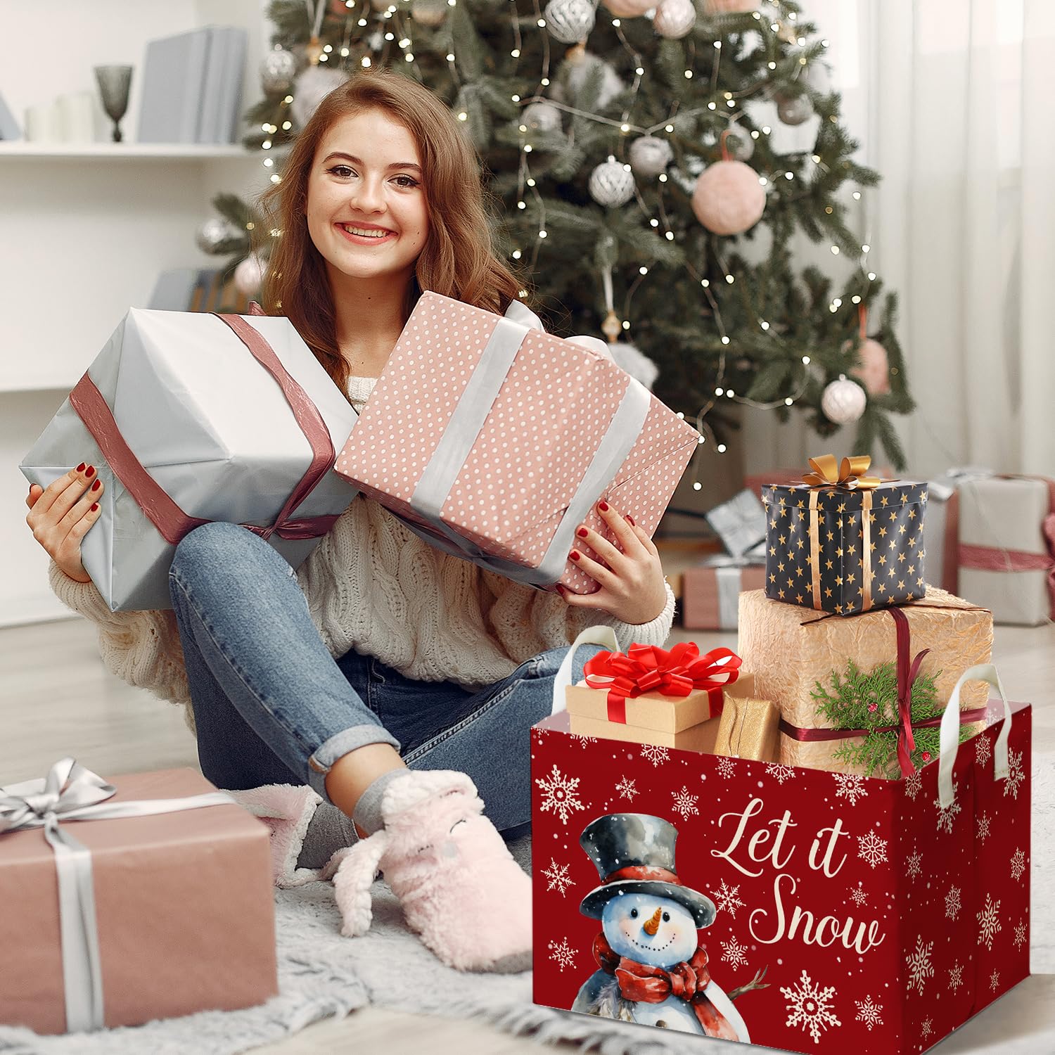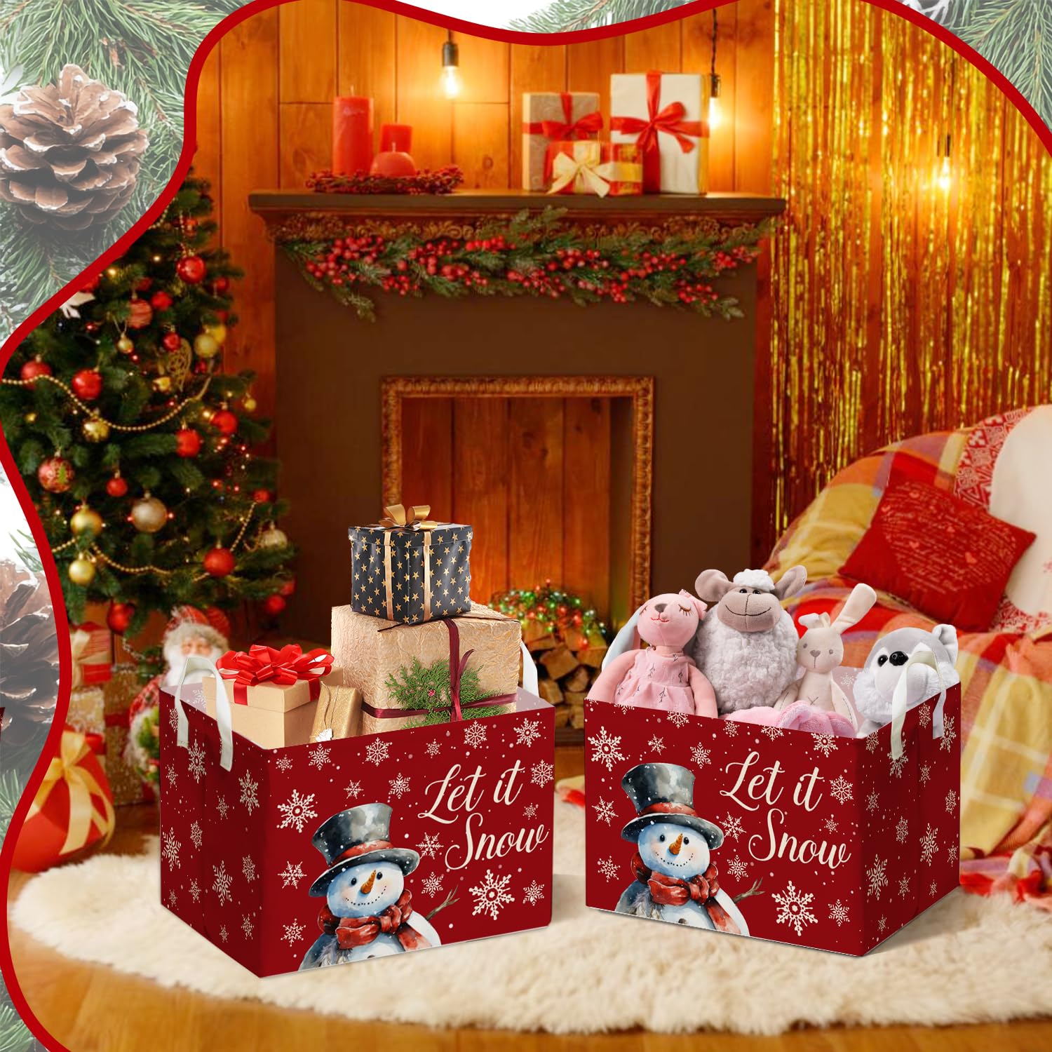 Important Tips: This festive storage basket is made of durable and waterproof fabric, and the storage basket is shipped in a folded way. Wrinkles may appear during long distance transportation, but they will gradually disappear after being filled or standing upright for a period of time.