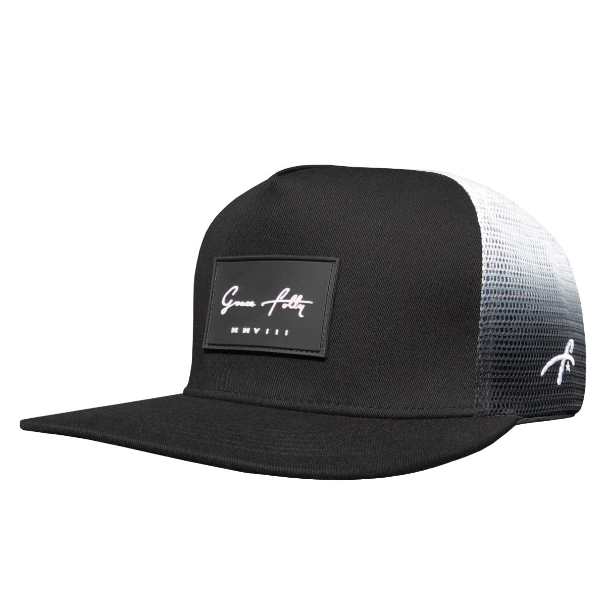 SMOOTH TRUCKER- This Black Fade Grace Folly flat bill trucker hat is sure to impress! Structured 5 panel trucker cap with mesh back and adjustable snapback. Be the envy of your friends in this old school trucker.
