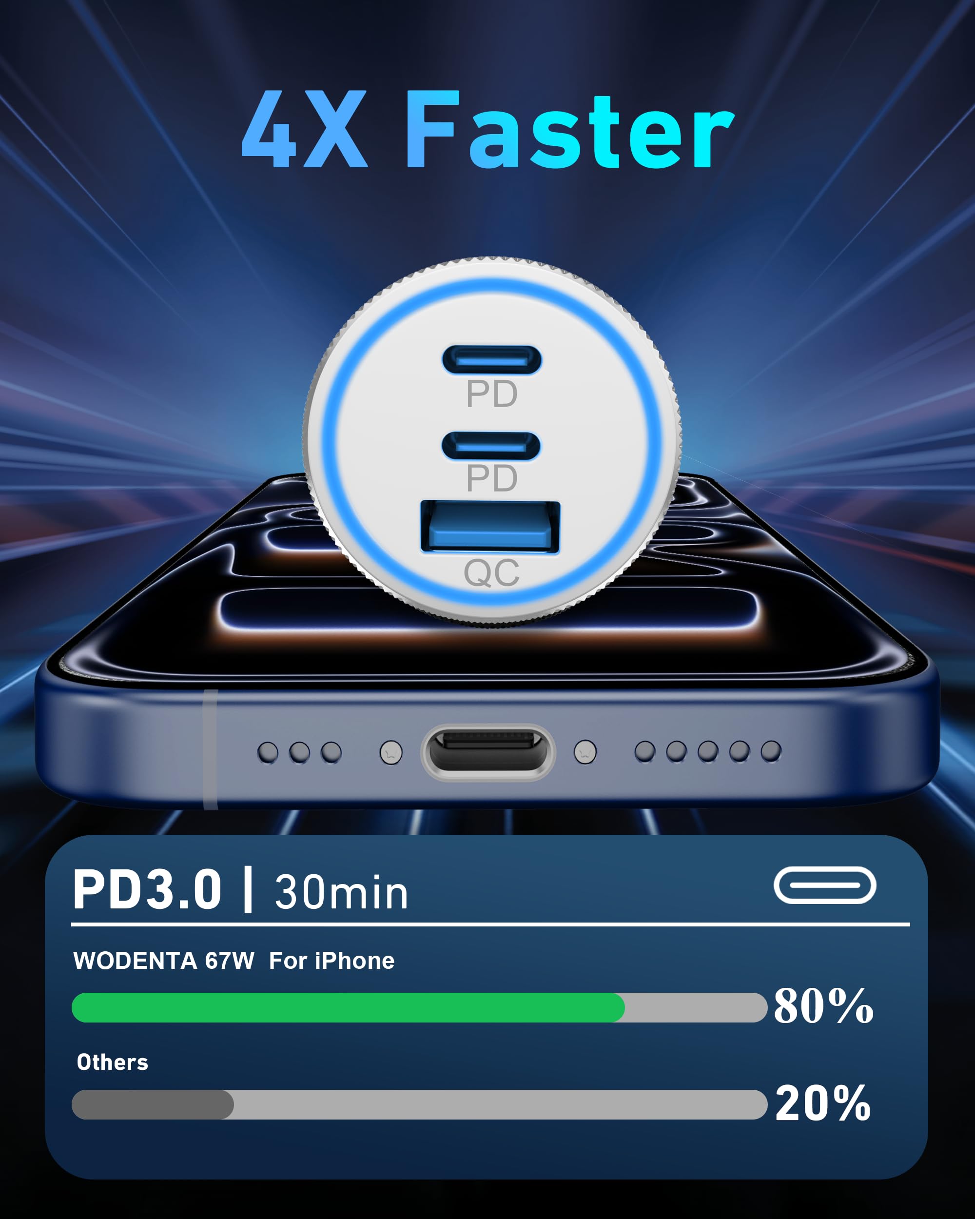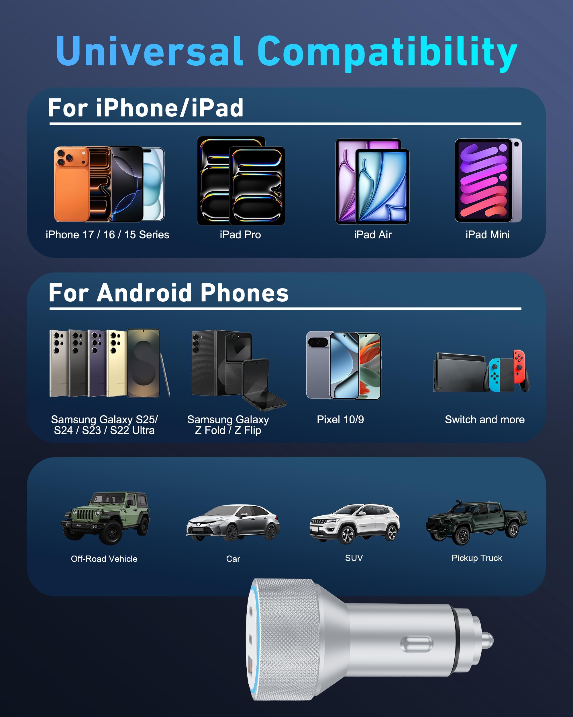 67W Super Fast Charging: USB C super fast car charger with all-new upgrade 67W can charge for iPhone 17/16/15 series up to 80% and iPad up to 60% at 30 minutes. Type C car charger adapter also fast charge for Galaxy S25/S24/S23 series up to 60% in just 20 minutes