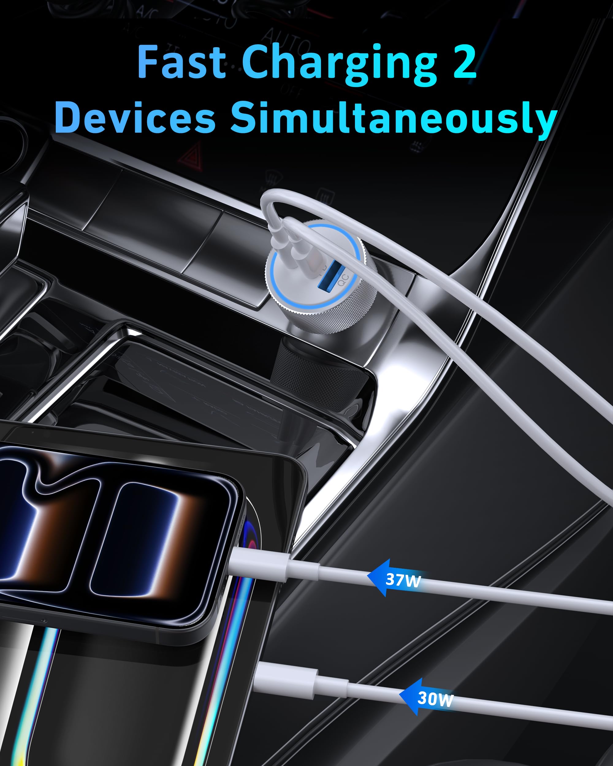 3-Port Simultaneous Charging: USB C car phone charger equipped with two USB-C ports and one USB-A port, it can charge up to 3 devices simultaneous, with a total output of 67W. The car charger supports PD 37W (Max) and QC 30W (Max) high output, can fast charge all prevailing phones and electronic devices