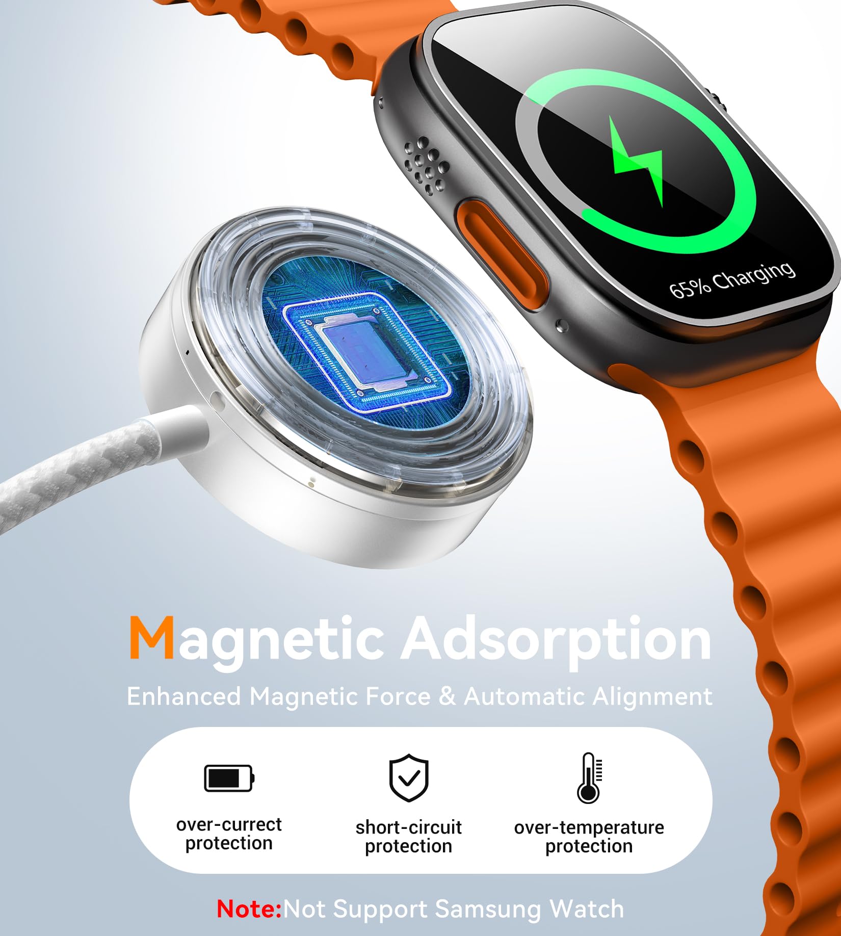 【Magnetic iWatch Charger】With auto-alignment magnetic technology, this charger effortlessly snaps into place, ensuring a secure and efficient charge as it automatically aligns with the back of your Apple Watch.(please note: for optimal charging, avoid using an Apple Watch protective case)