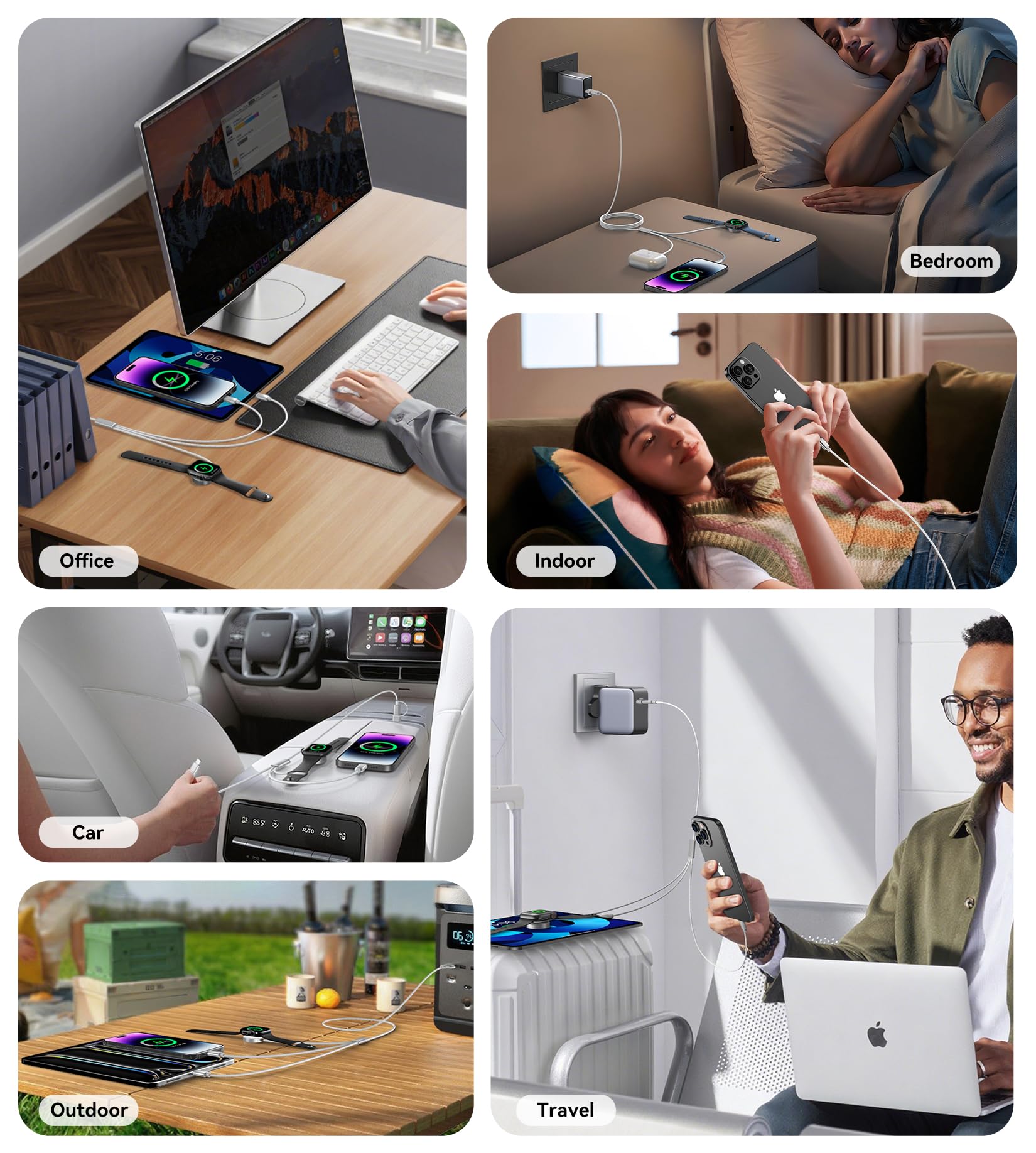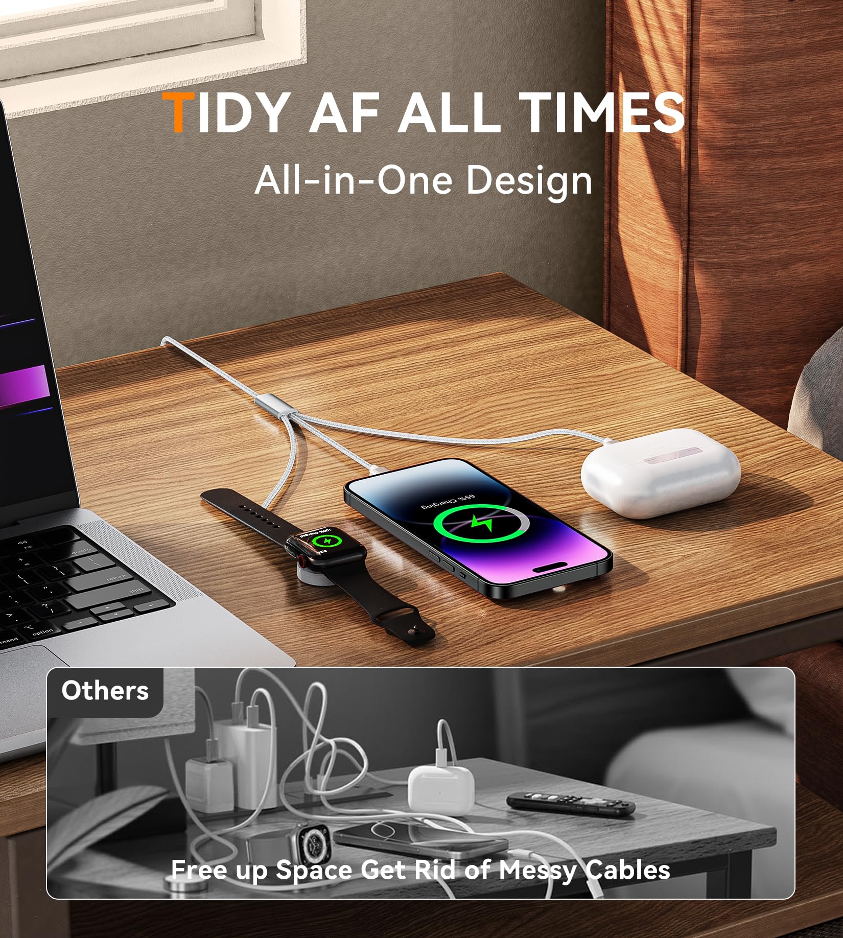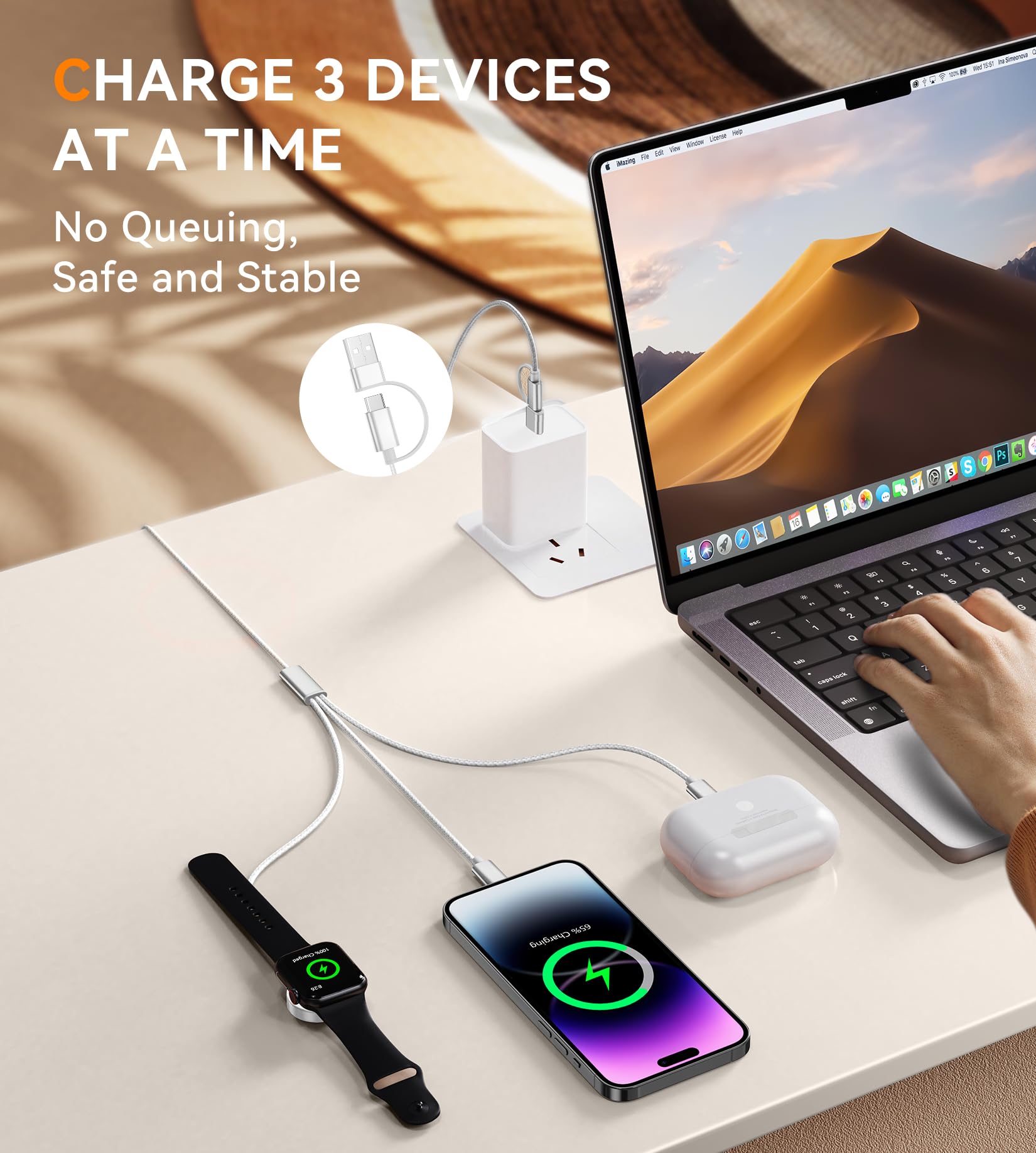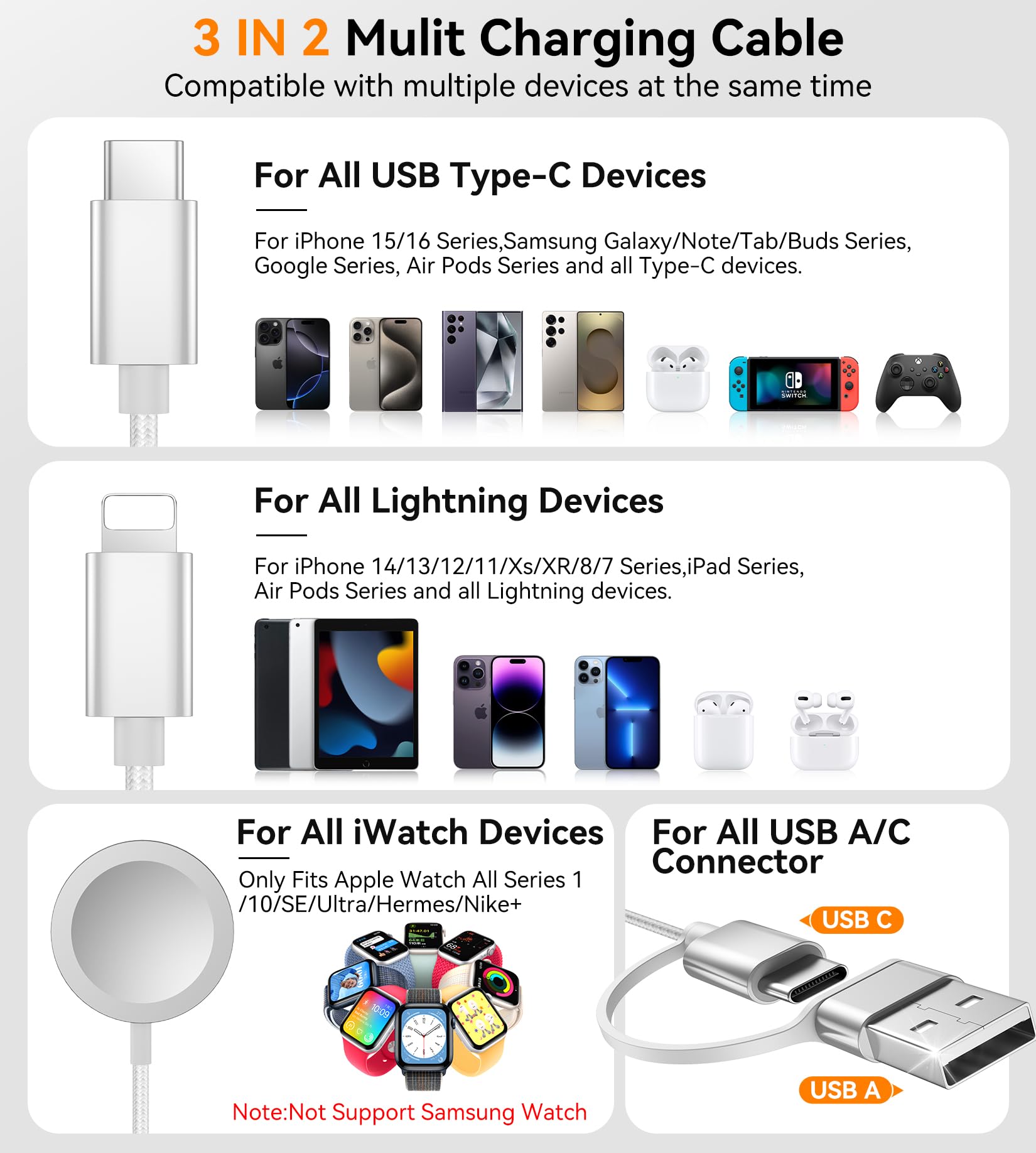 【2-Pack & 3-in-2 Multi Charging Cable】 3-in-2 multi charging cable provide 6 charging modes (USB-C/A for Apple Watch charger, Lightning, and Type-C),which compatible with all iWatch Ultra series 11/10/9/SE/8/7/6/5/4/3/2/1, compatible with iPhone 12-17/iPad (Lightning/USB-C).A portable travel charger for multiple devices,designed for simultaneous charging of multiple devices