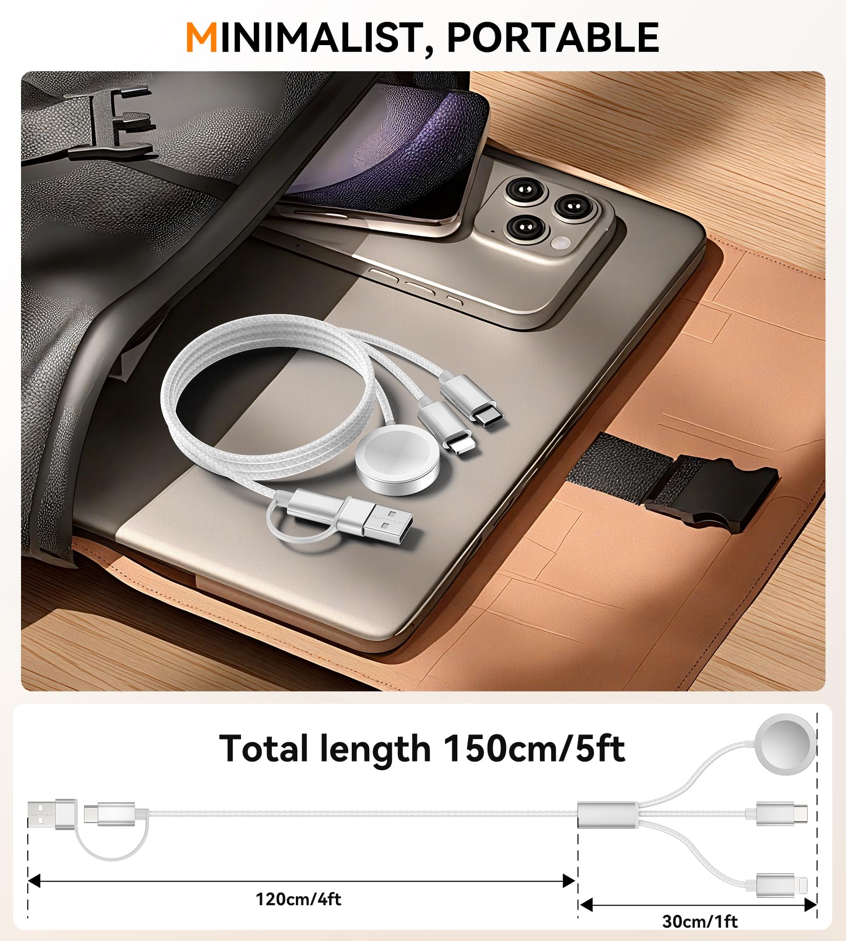 【Travel Essentials & 5FT Length】The 5ft 3-in-2 USB-C cable is a travel essential. Use this portable charging cable compatible with Apple Watch and iPhone devices on flights, in cars, or with power banks–suitable for home, office, and travel accessories