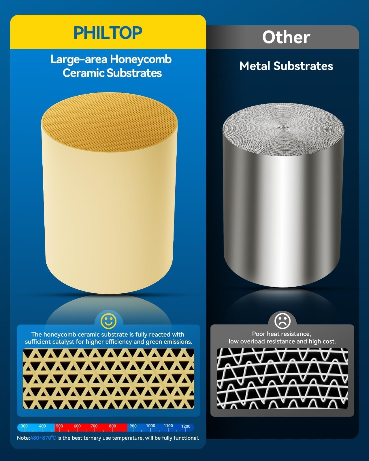 [STAINLESS STEEL OUT SHELL] --- The high flow catalytic converters with heavy-duty stainless steel construction feature maximum durability. Firmly welded connections can withstand high temper and pressures for longer service life.