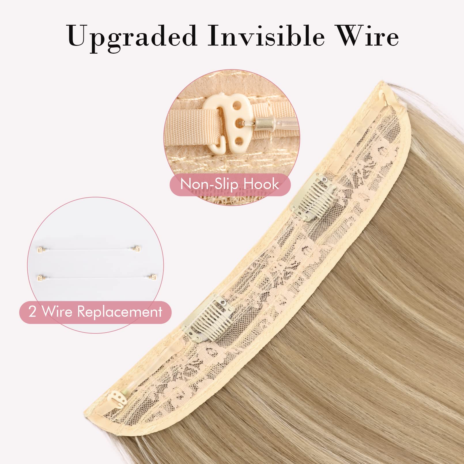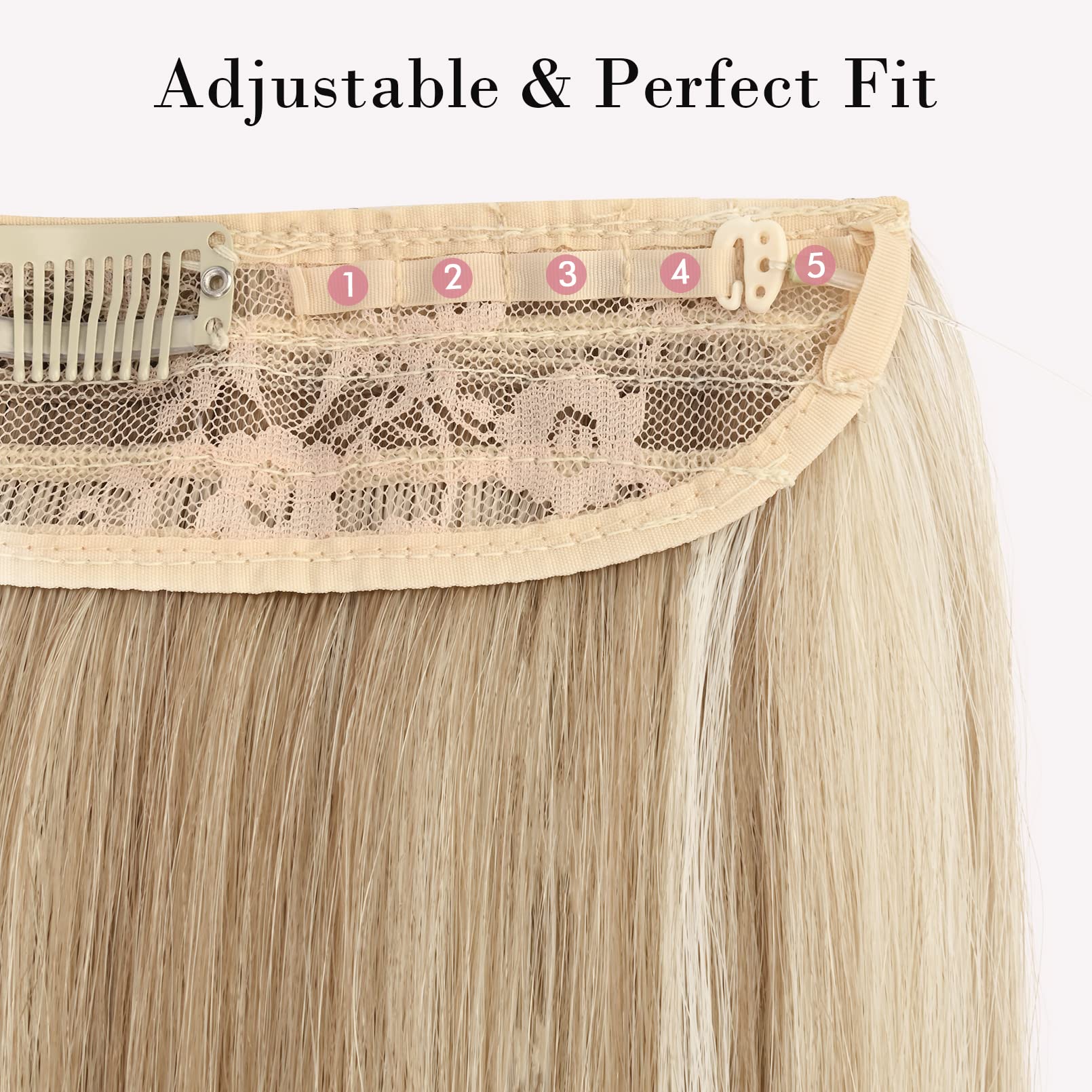 Adjustable Size to Get Perfect Fit: 1.Put the plastic hook into 5 different notches. 2. Total 2PCS wire in different length 8/9inch(1PC attached on hair and 1PC wire replacement)