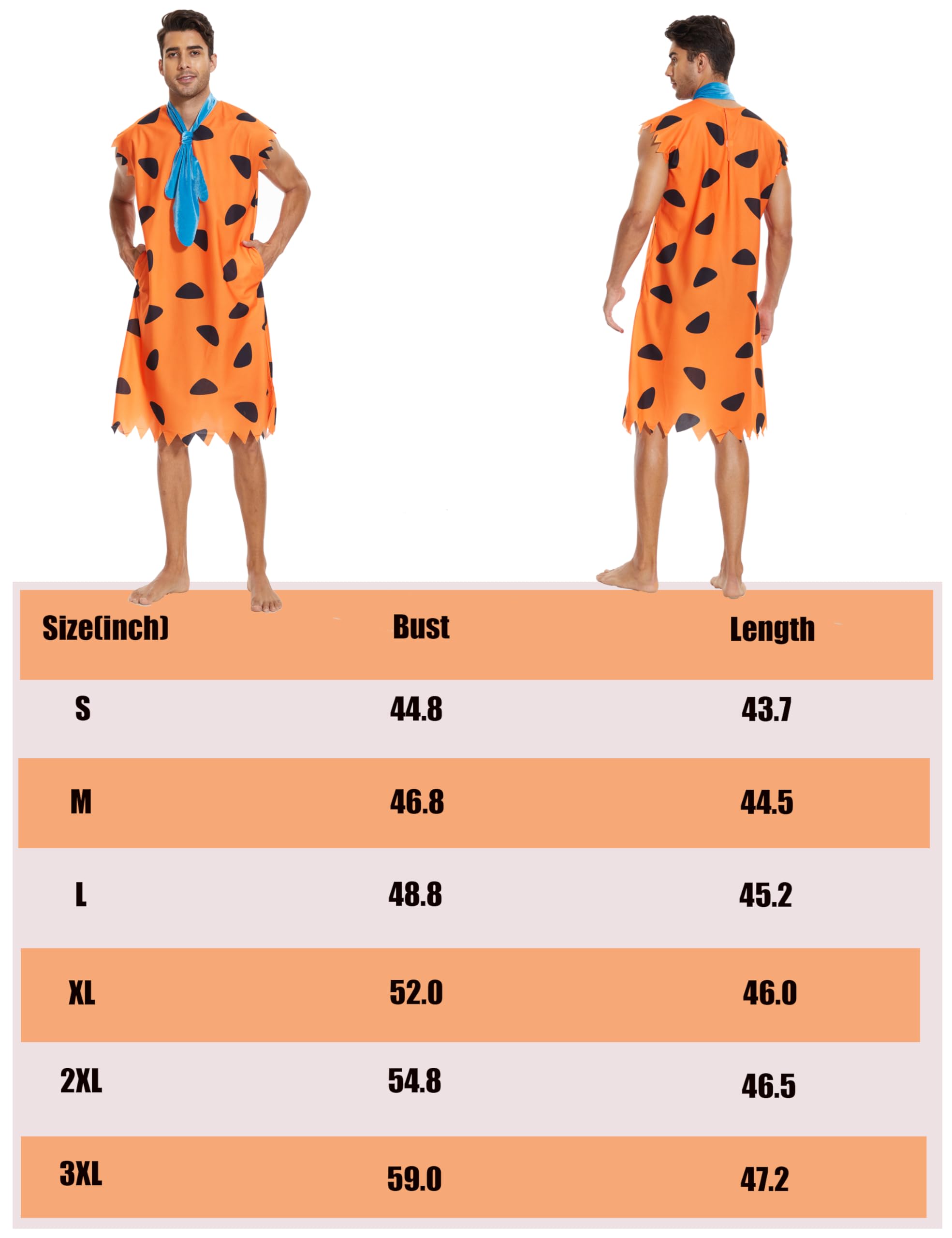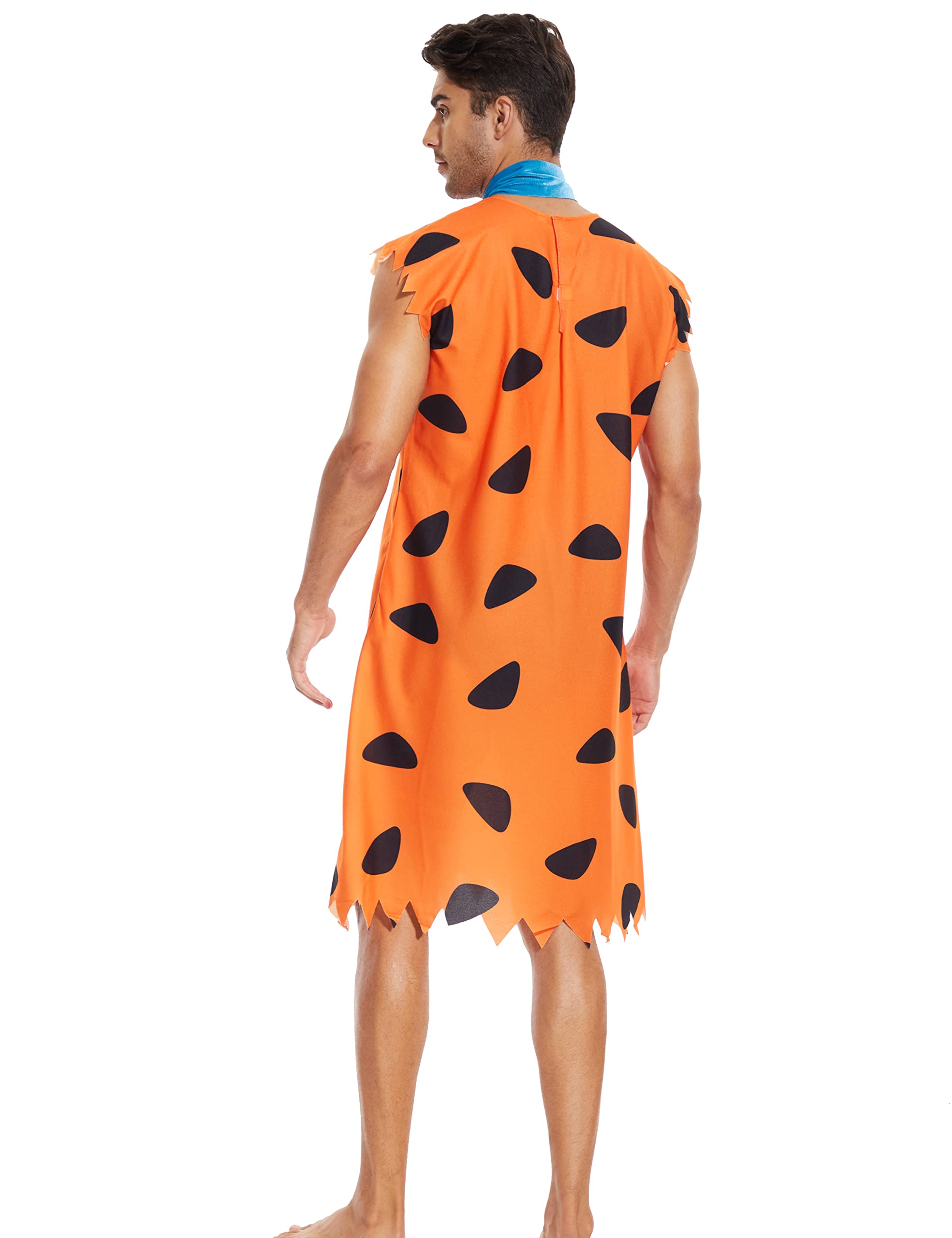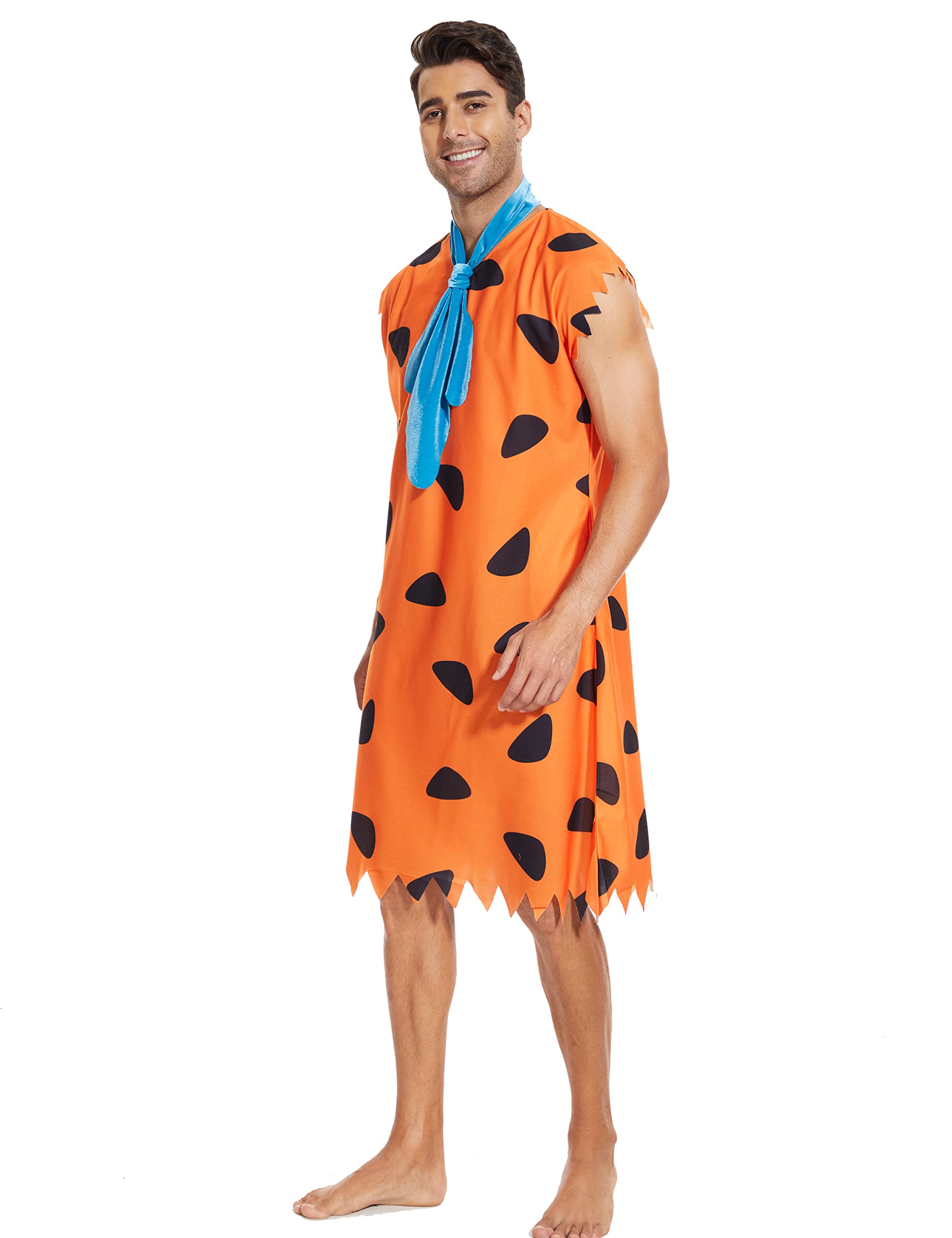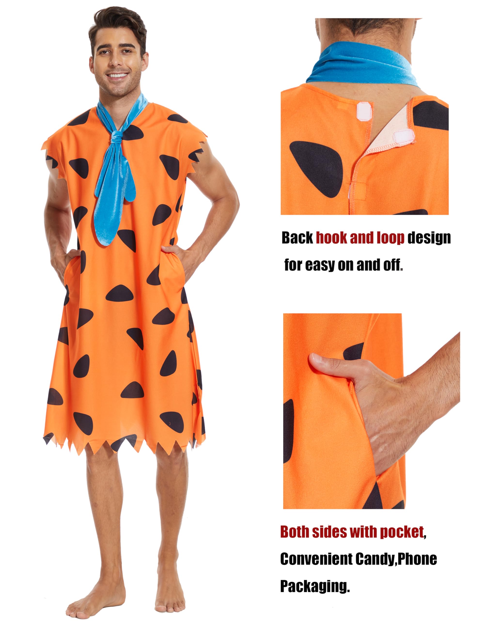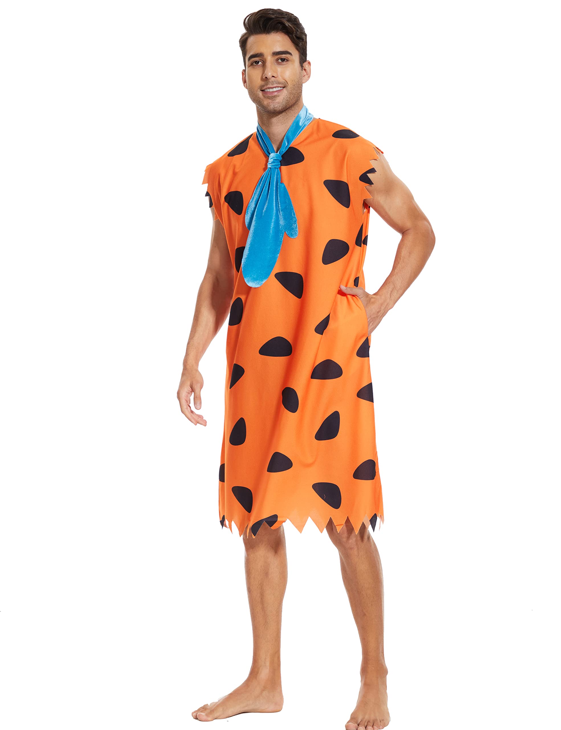 🧡:Bring the classic cartoon Fred caveman to life in the iconic vibrant orange costume with jagged edge sleeves.The mens features the iconic orange print, roomy pockets,and a tie.