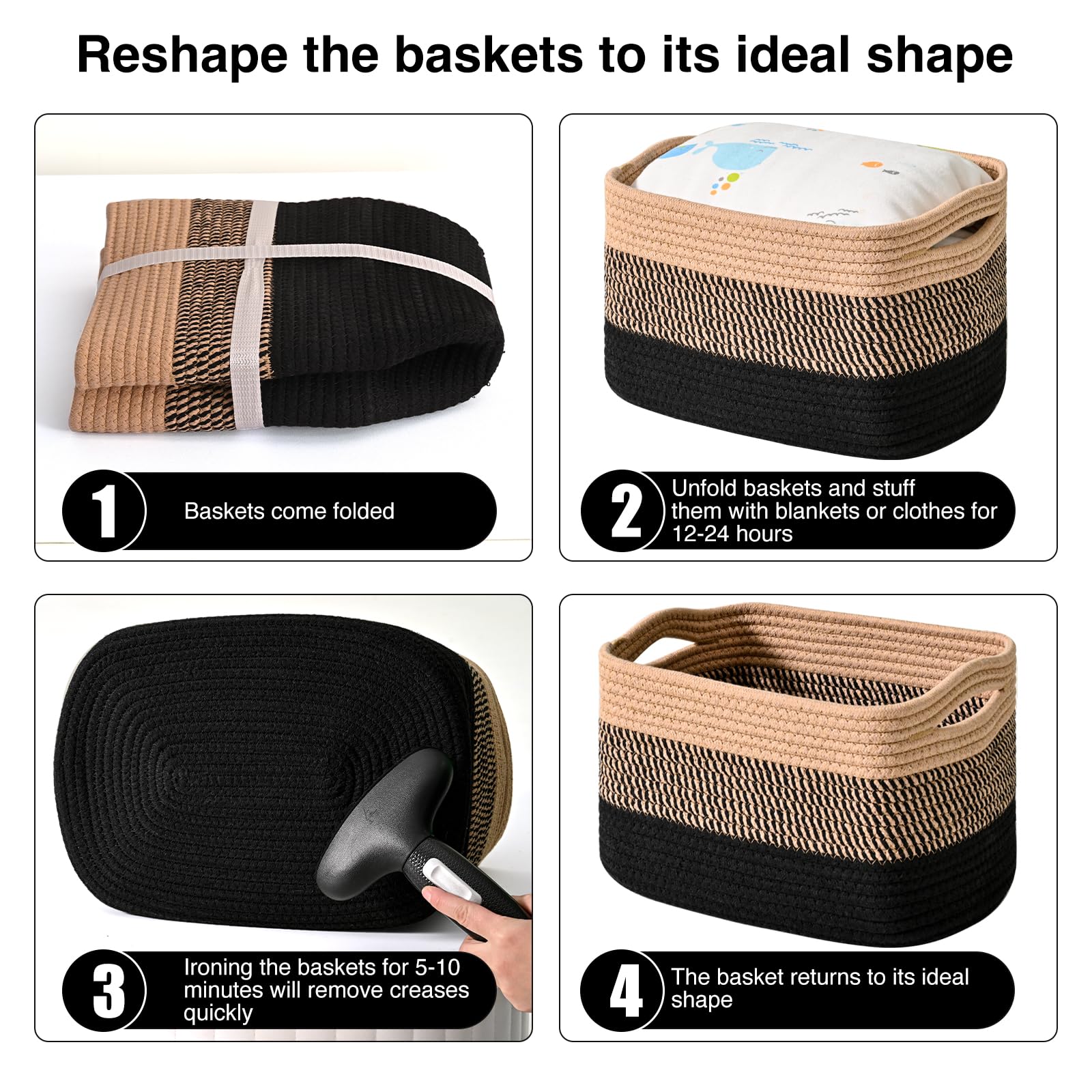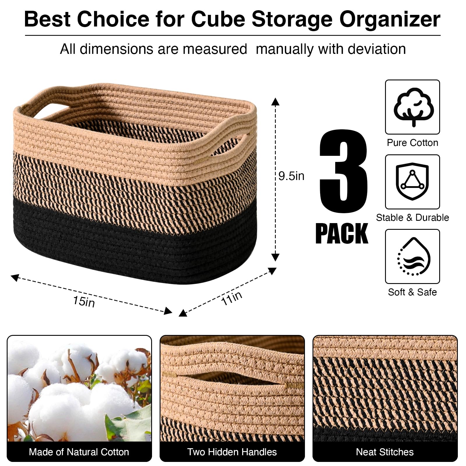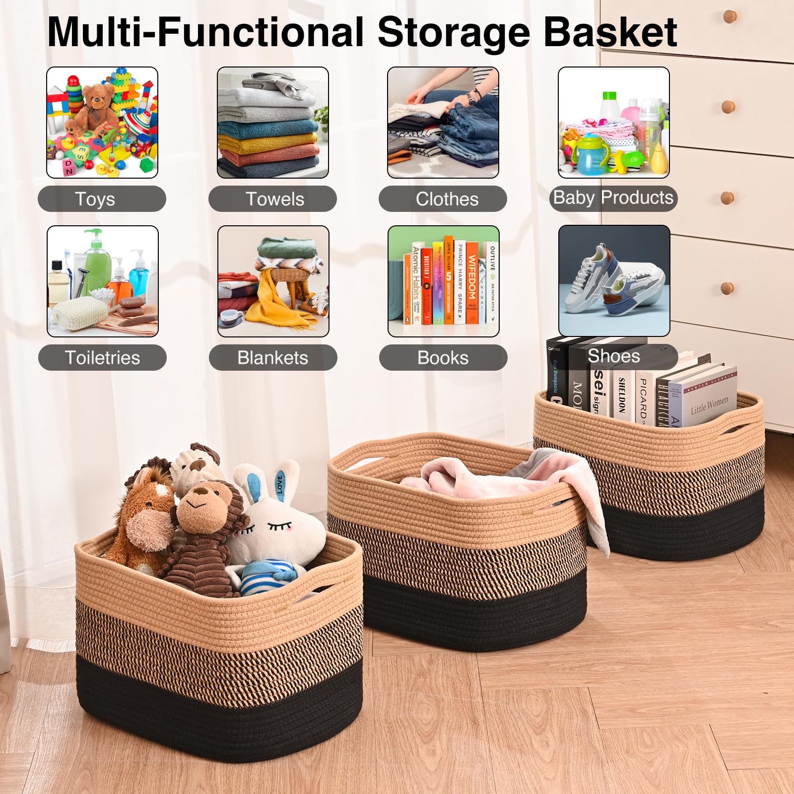 Multi-functional Design: These 15"x11"x9.5" decorative baskets are the perfect solution to tackle everyday clutter. Our woven baskets for storage accommodate various items such as clothes, toys, books, Towels, and cosmetics, helping you maintain a tidy and organized living space
