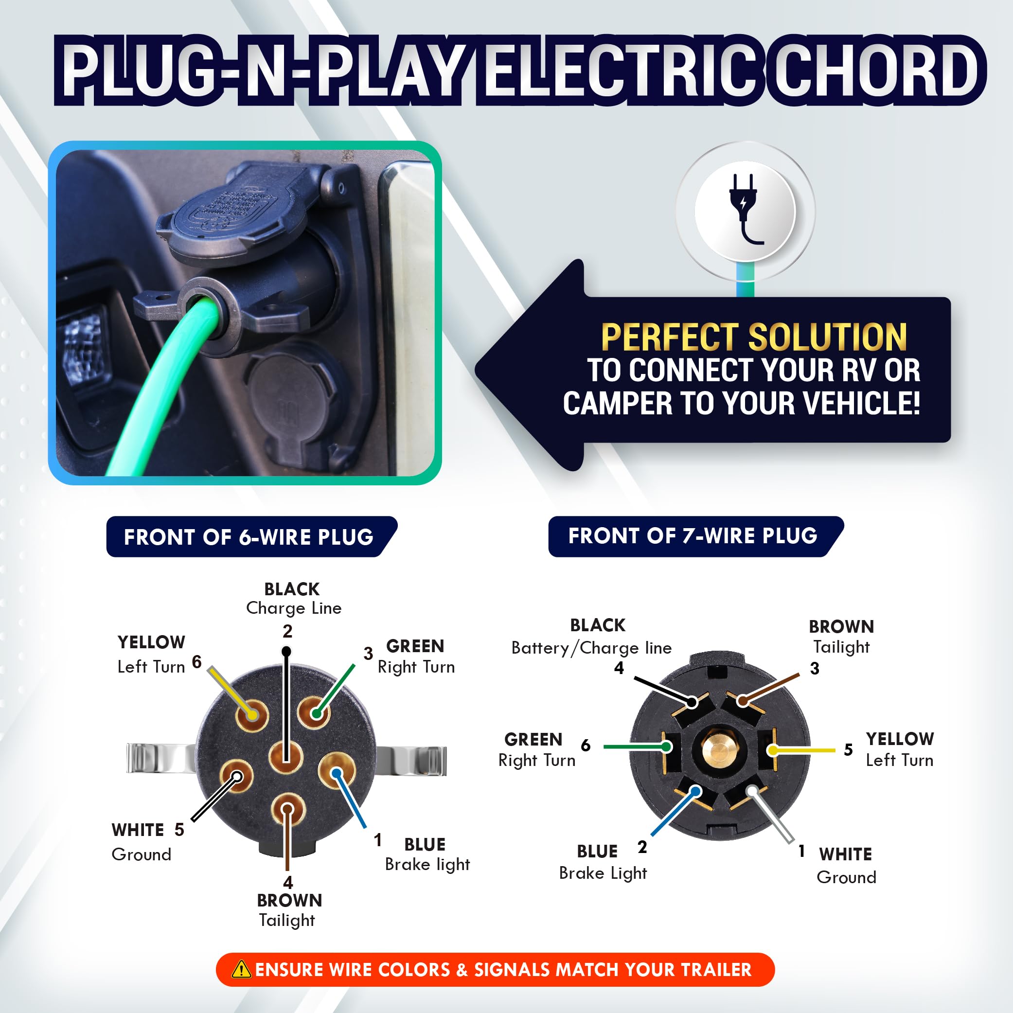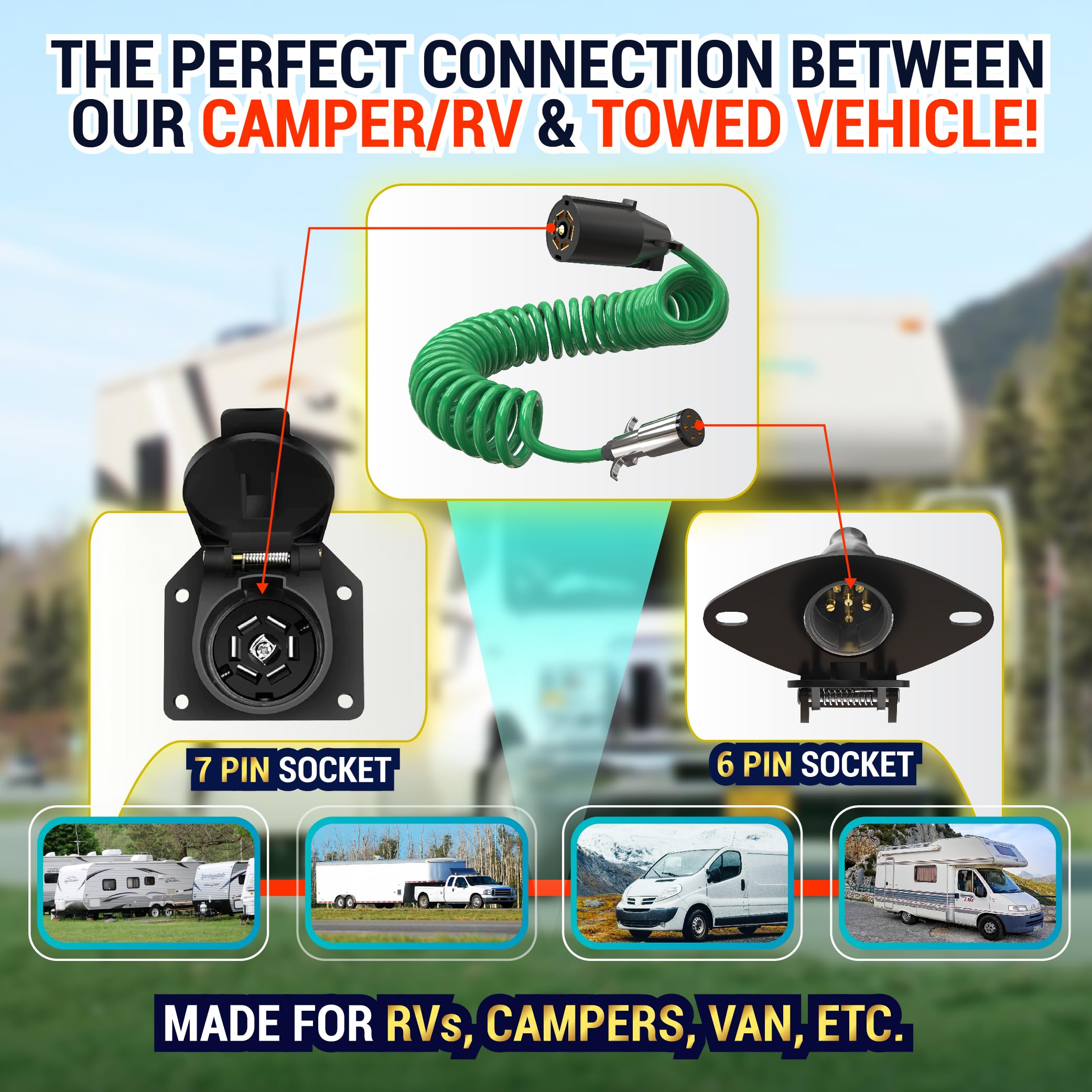 ✅ CORROSION-RESISTANT & ERGONIC PLUGS - The HARD PLASTIC 7-PIN PLUG and ALL METAL 6-PIN PLUG are the PERFECT SOLUTION to CONNECT all LIHGTING SIGNALS from your MOTORHOME/RV/TRUCK to your TOWED VEHICLE. PRE-INSTALLED & STANDALONE PLUGS makes TOWING a BREEZE. Say GOODBYE to WIRING UP plugs yourself!