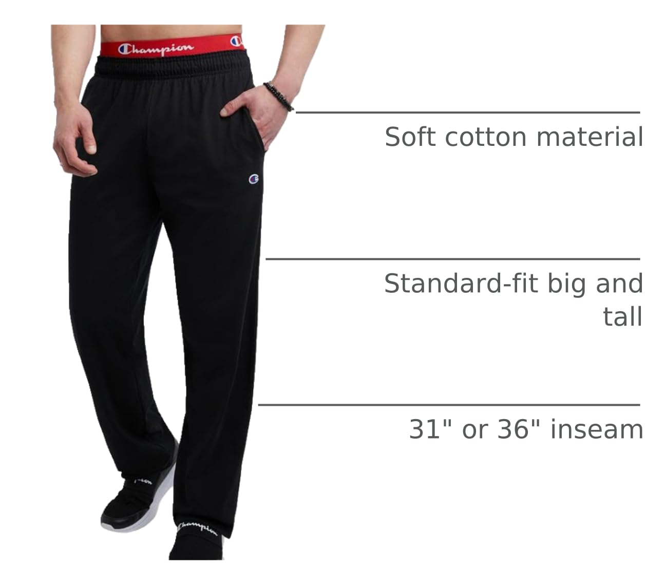 Description CLASSIC CHAMPION STYLE. These menβs open-hem lounge pants deliver ultimate lightweight comfort and are as soft as your favorite jersey knit t-shirt. Made for everyday at-home wear, their minimalist design features a stretch waistband with drawcord closure for a customizable fit. Convenient side pockets are the perfect place to store your phone, wallet, and more, while the open hem completes the laid-back look. These menβs lounge pants are finished with a Champion C logo patch at the left hip and are ready to be paired with your favorite tee or hoodie for an effortlessly cool 'fit.