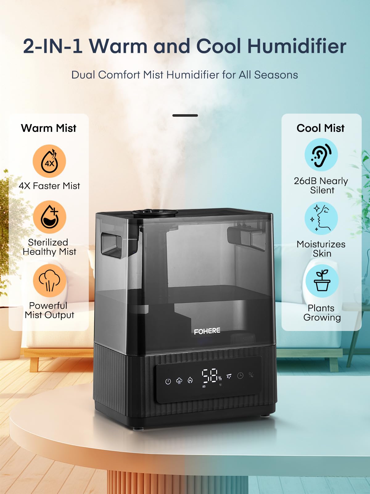 Warm & Cool Humidifier for All Seasons: The humidifier is perfect for various settings and needs. Whether you have a newborn baby who requires a gentle and comforting environment, or you are nurturing indoor plants that thrive in a humid atmosphere. The Cool and Warm Humidifier offers customizable humidity control, adjustable from 30%-80%, providing comprehensive care for your family