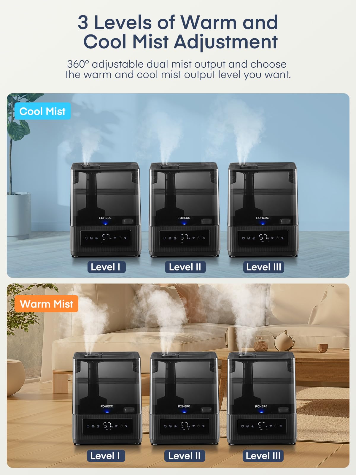 Dual Mist Humidifier: The Mist Humidifier offers adjustable warm and cool mist modes with three levels, allowing customized humidity settings for bedrooms, living spaces, baby rooms, and nurseries. It features a sterilized warm mist reaching up to 133°F for healthier hydration, and it includes many safety measures like PTC ceramic heating, NTC high-temperature protection, automatic shutdown when the tank is empty, and a panel light reminder for safe use