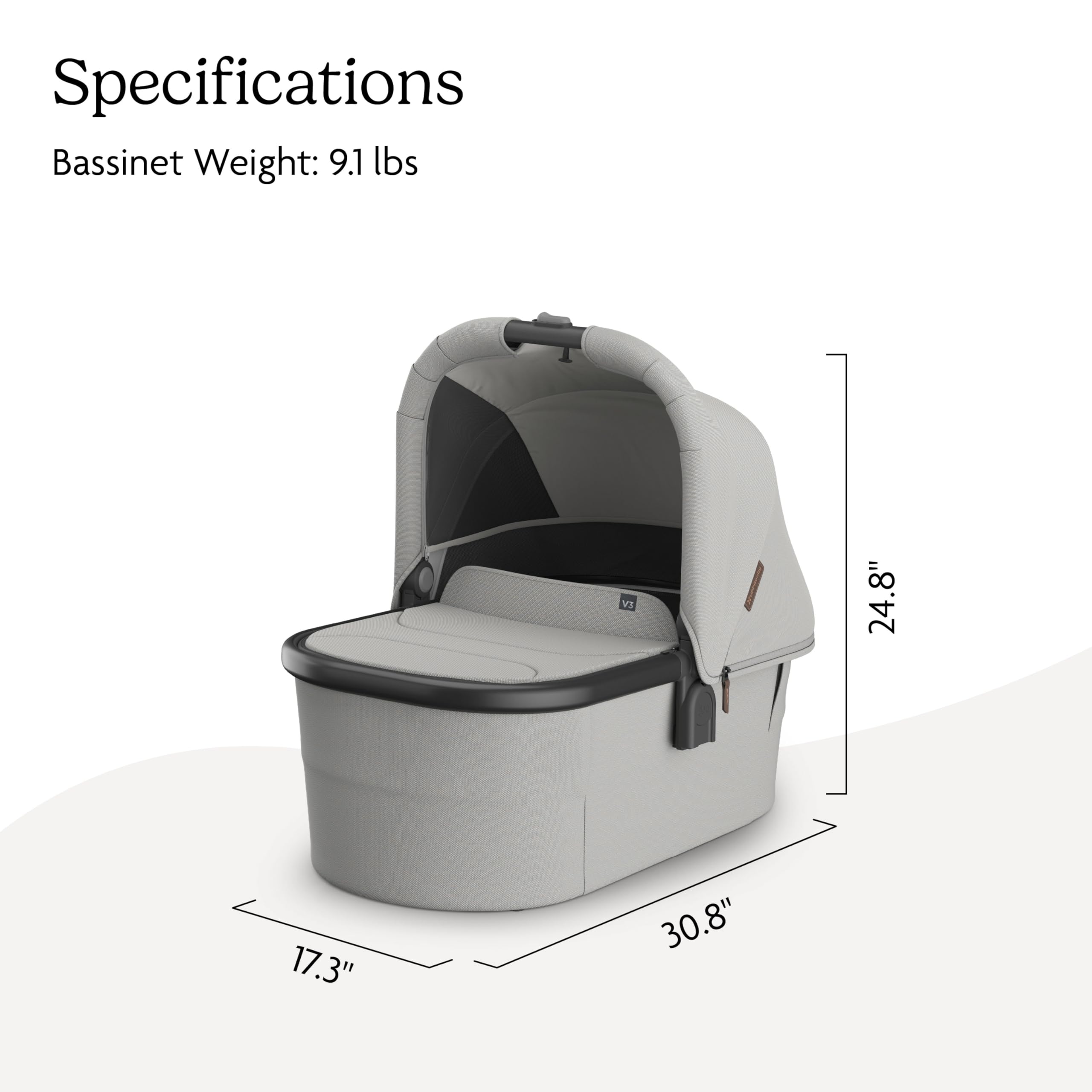 Transform your Vista, Cruz, or Ridge into a safe and stylish pram ideal for your newborn. Whether for naps on the go or overnight sleeping, our Bassinet allows your baby to lie completely flat. The Bassinet V3 has enhanced features including greater ventilation, easy access to baby, and a breathable mattress for safe sleep. - Extendable, UPF 50+ sunshade and mesh panels for air flow - Carry handle with an effortless one-hand stroller release for easy on-and-off attachment - Zip-out, water-repellent inner liner and boot cover are easy to remove and clean - Direct attachment to stroller with indicators for extra security - Included Bug Shield to protect from outdoor elements - Fits directly onto Bassinet Stand Accessory - GREENGUARD Gold certified to support healthier air quality & low chemical emissions + What is Included - Bassinet - Bassinet Bug Shield - Mattress - Mattress Cover.