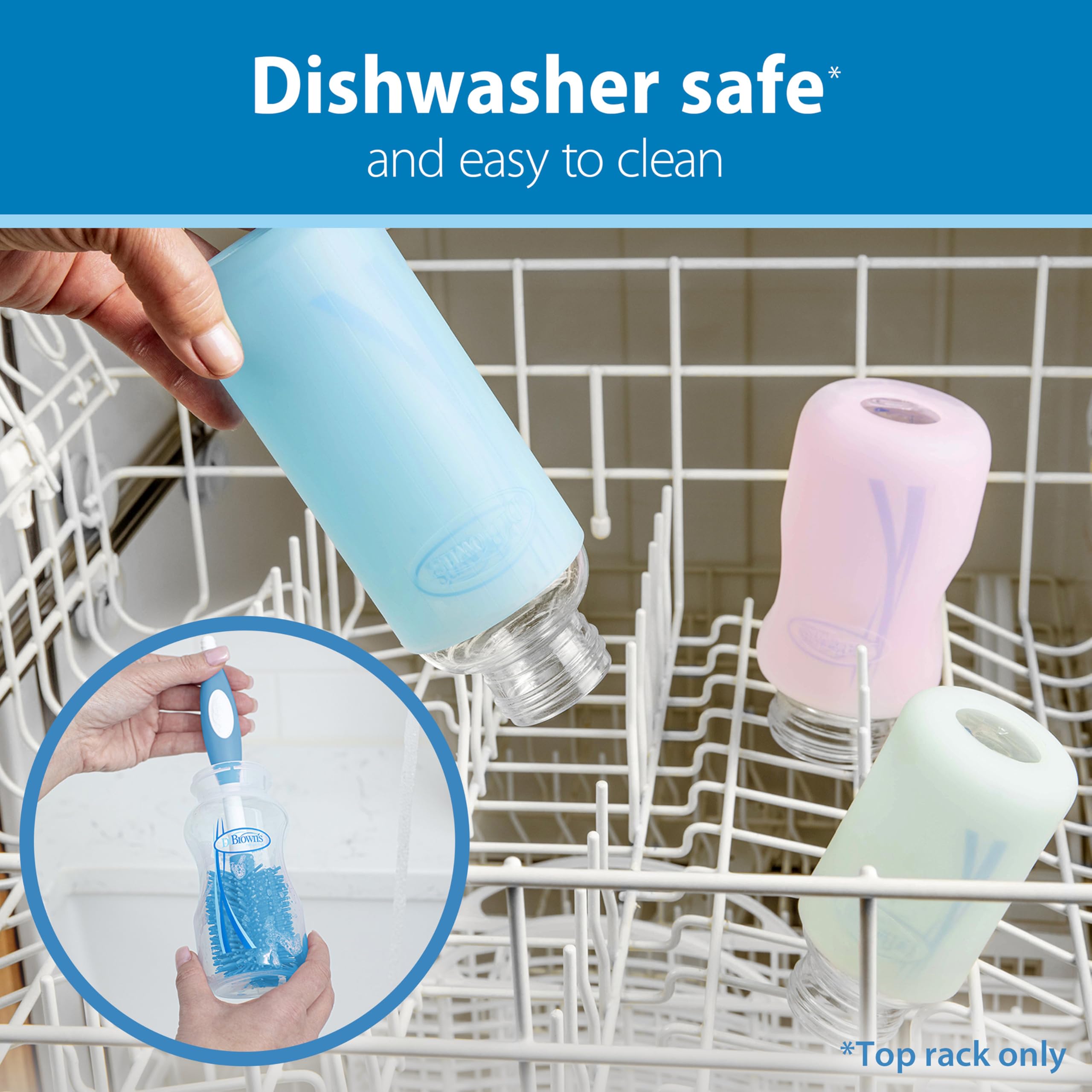 DISHWASHER SAFE. Safe for use in dishwasher (top rack only), electric and microwave sterilizers or boiling water. BPA Free.