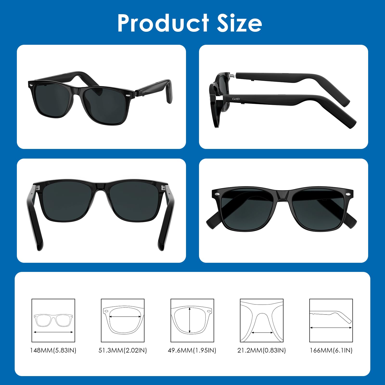 【Music & Call Glasses】: The GetD AI glasses are equipped with two 115mAh batteries. A full charge offers 15 days of standby and 11 hours listen music, 9 hours calling (at 50% volume). Charging 10 mins, 1 hour use; over-voltage and overload protection, magnetic charging and integrated design ensure IP54 water resistant