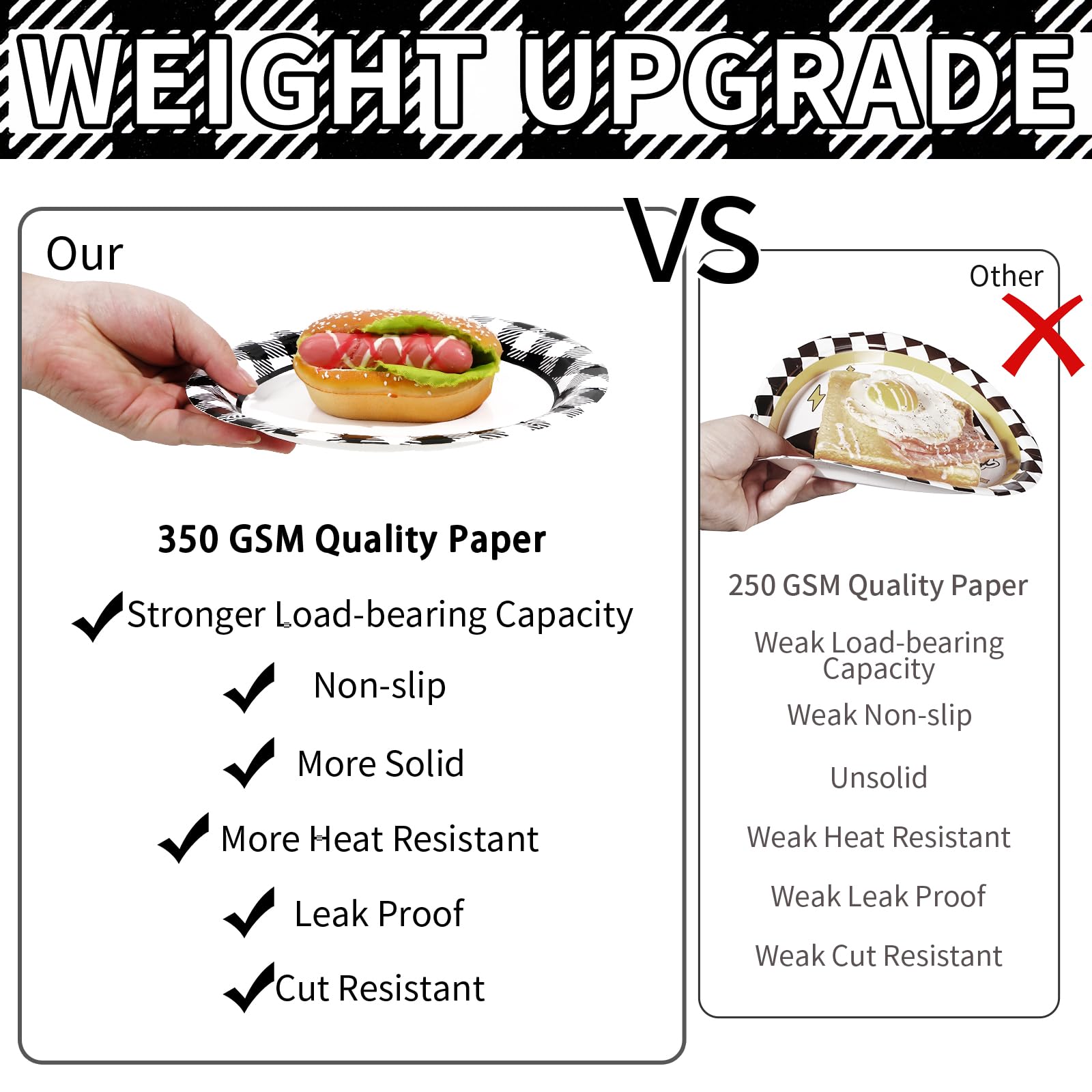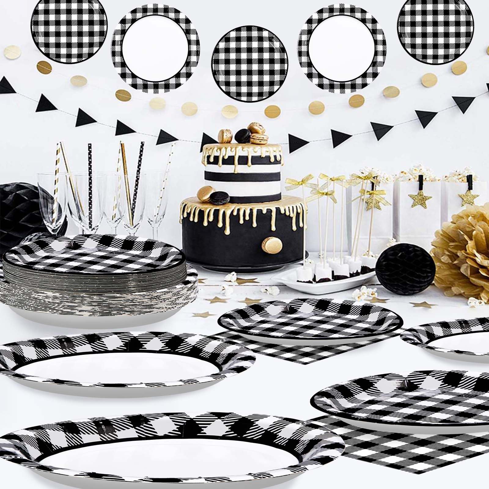 Upgraded Material: Our black and white paper plates and napkins are made of high quality thick paper, not easy to bend or tear. Gingham plates are upgraded to 350g, more sturdy and durable; napkins are 2 ply, softer and thicker. Reliable black and white party plates ensure you enjoy your party smoothly and hassle-free (Tip: Do not microwave the plates)