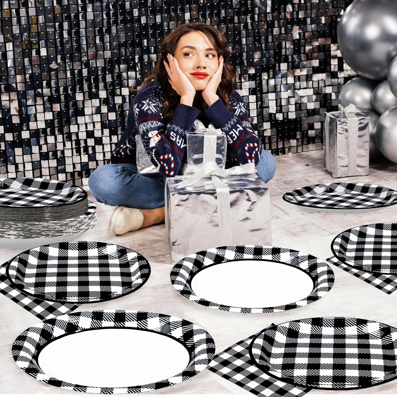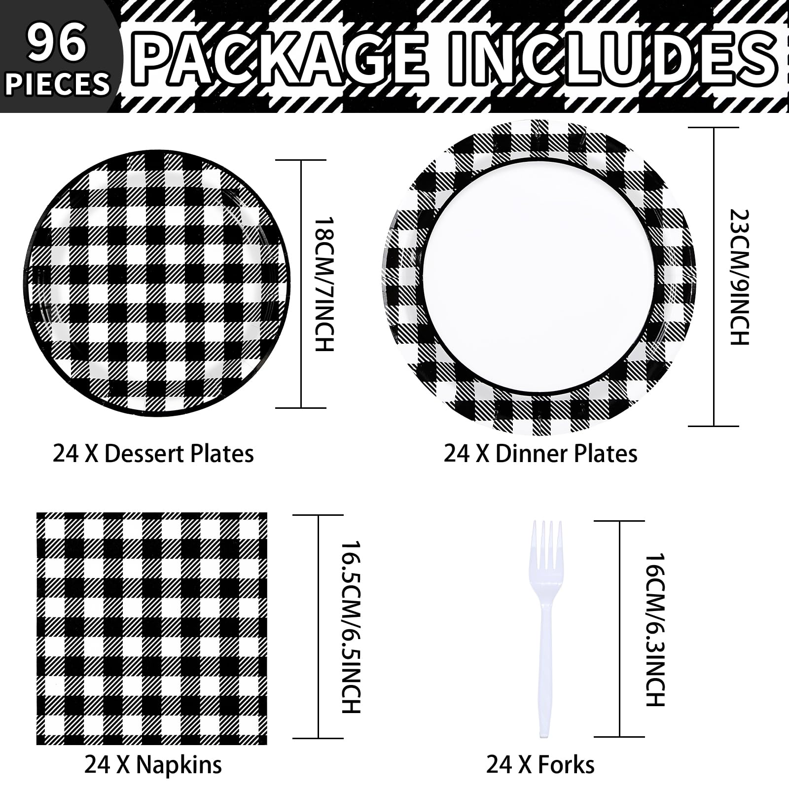 Ample Quantity: You will get 96 pcs black and white gingham flatware set, including 24 9" plaid paper plates, 24 7" checkered plates, 24 gingham napkins and 24 black white two-color forks, which can easily accommodate up to 24 guests, enough to satisfy your BBQ gathering or picnic