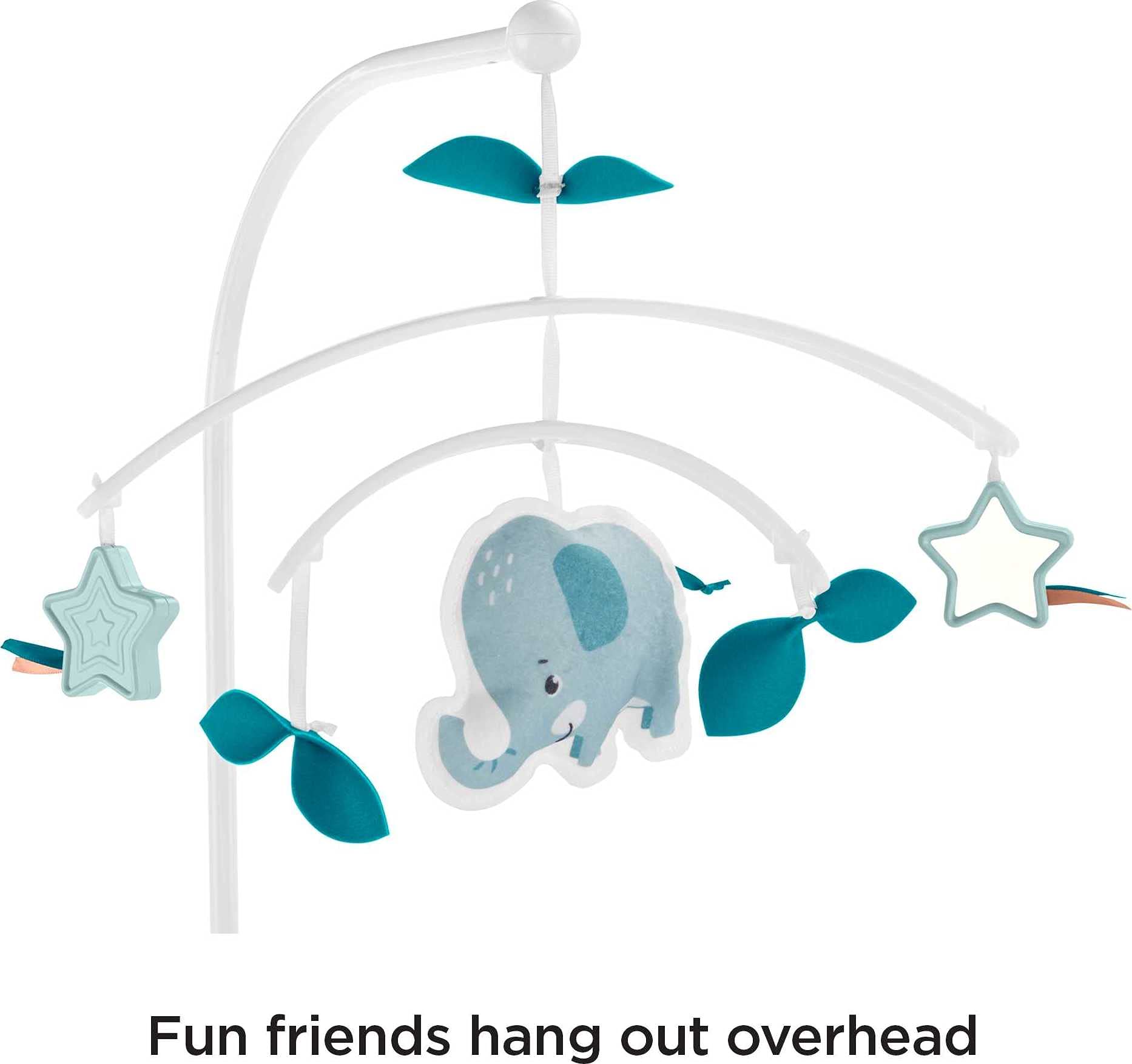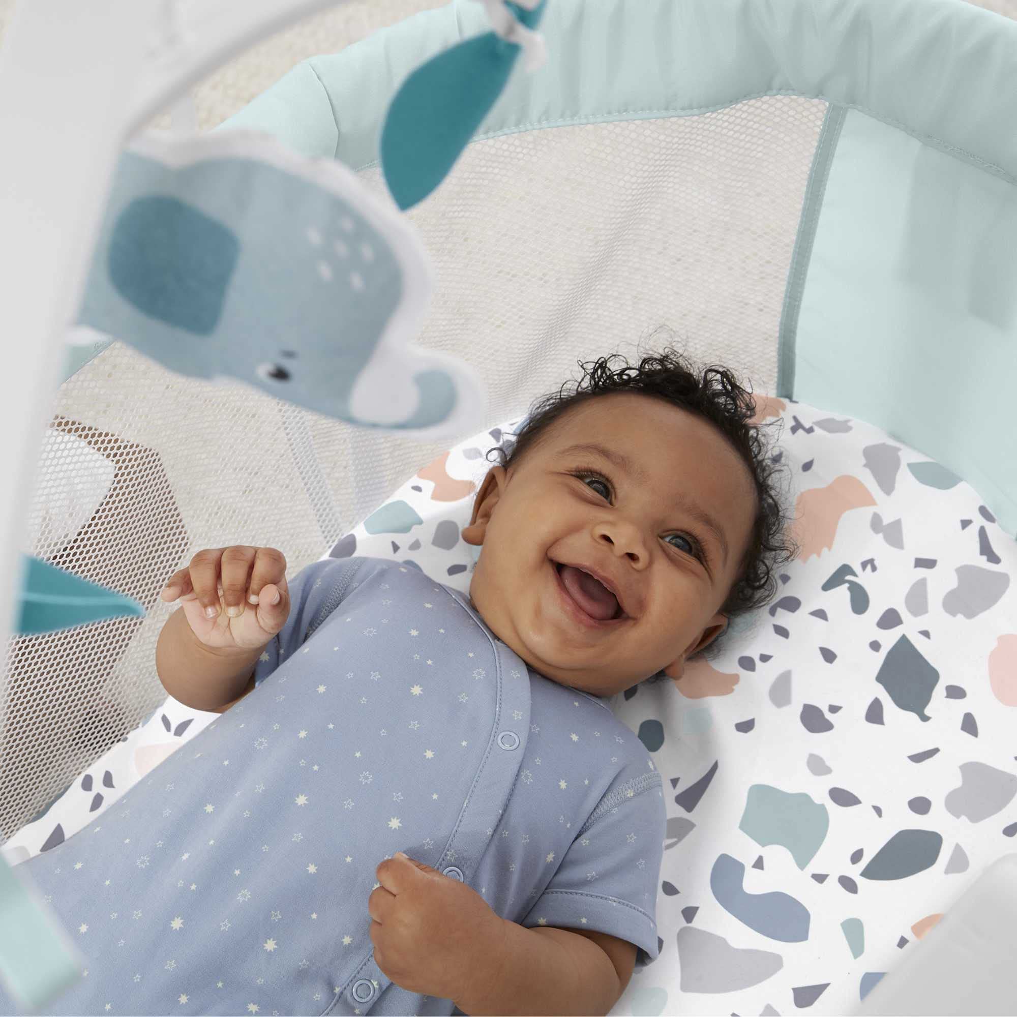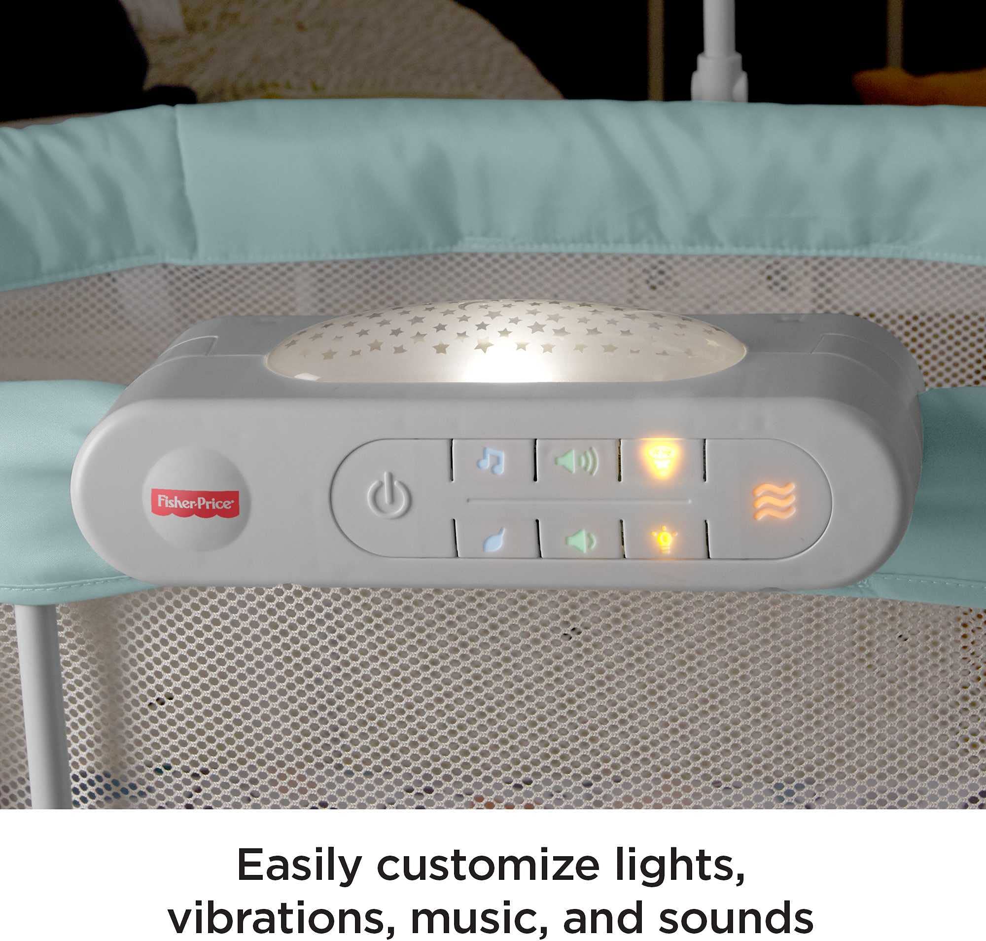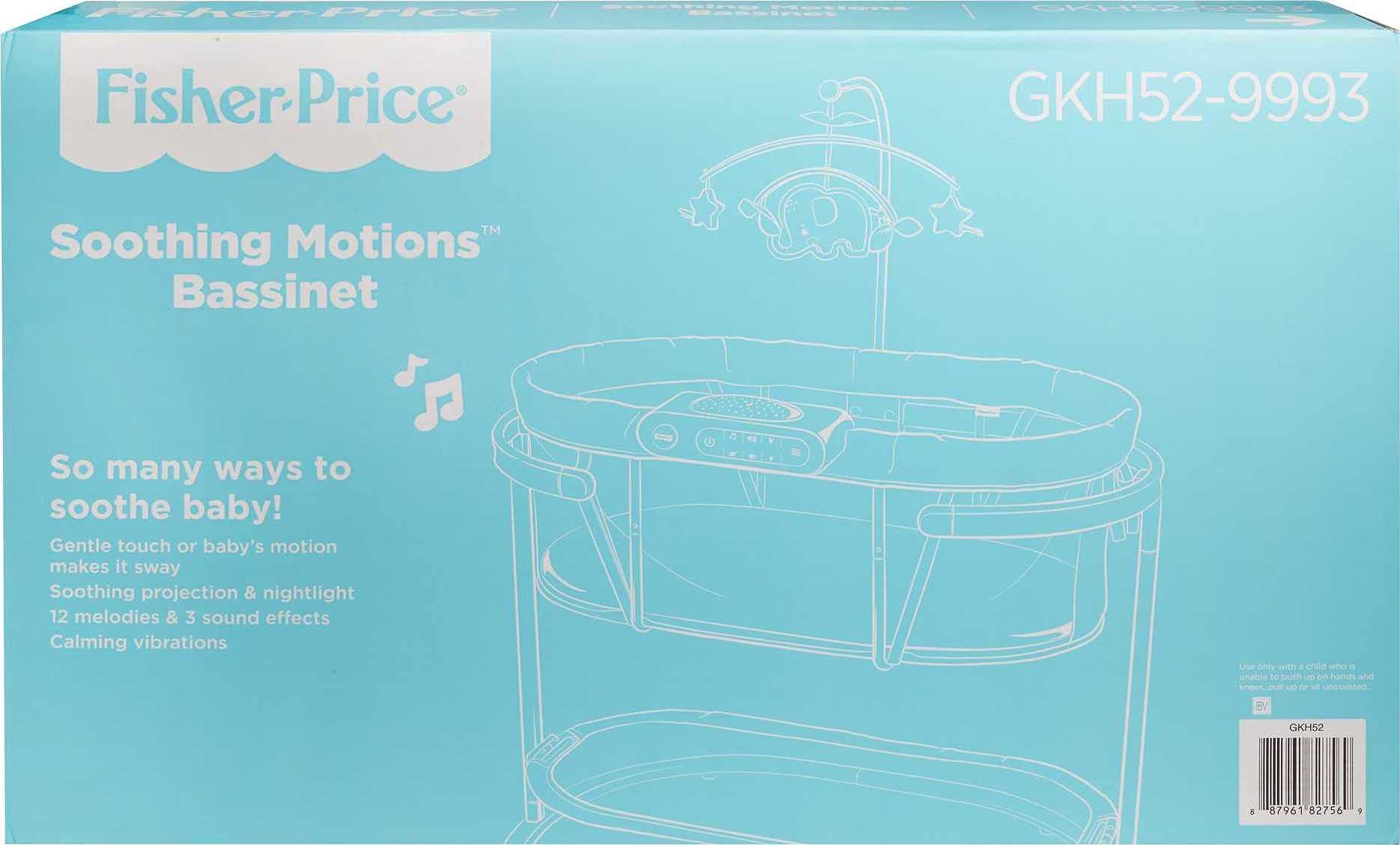 The Soothing Motions Bassinet from Fisher-Price has everything to help your baby drift off to sleep in comfort. Your baby's natural movements (or a gentle push from you) gets the bassinet softly swaying, along with the overhead toys on the mobile. Customize the soothing to best fit your little snoozer with dual-mode lighting, including soothing light projection, soft music and nature sounds, and calming vibrations. Best of all, as your baby grows, you can remove the control unit and use it as a tabletop soother in the nursery! Where development comes into play Sensory: A variety of music and sounds, calming vibrations, and swaying motion engage your baby's developing senses. Security & Happiness: Soft padding, calming vibrations, and gentle swaying help soothe your baby and become part of the nap and bedtime routine, giving them a sense of security. Use only with a child who is unable to push up on hands and knees, pull up or sit unassisted.