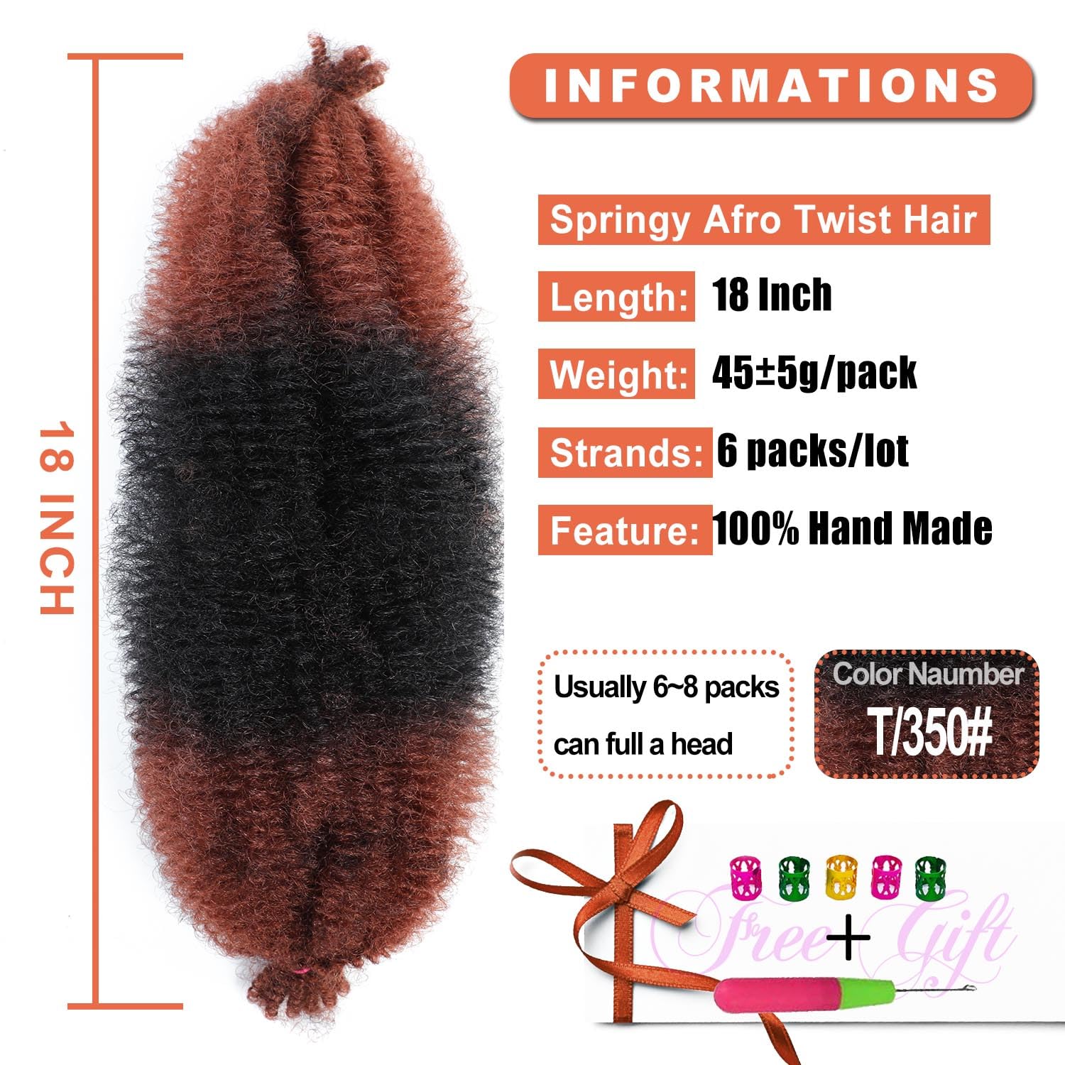 3.Hair Specifications: Springy afro twist hair length 18INCH (40±5g/Packs, 8Strands/Pack ,6Packs/Lot), giveaways in every pack, Usually 6-8 packs can full a head.