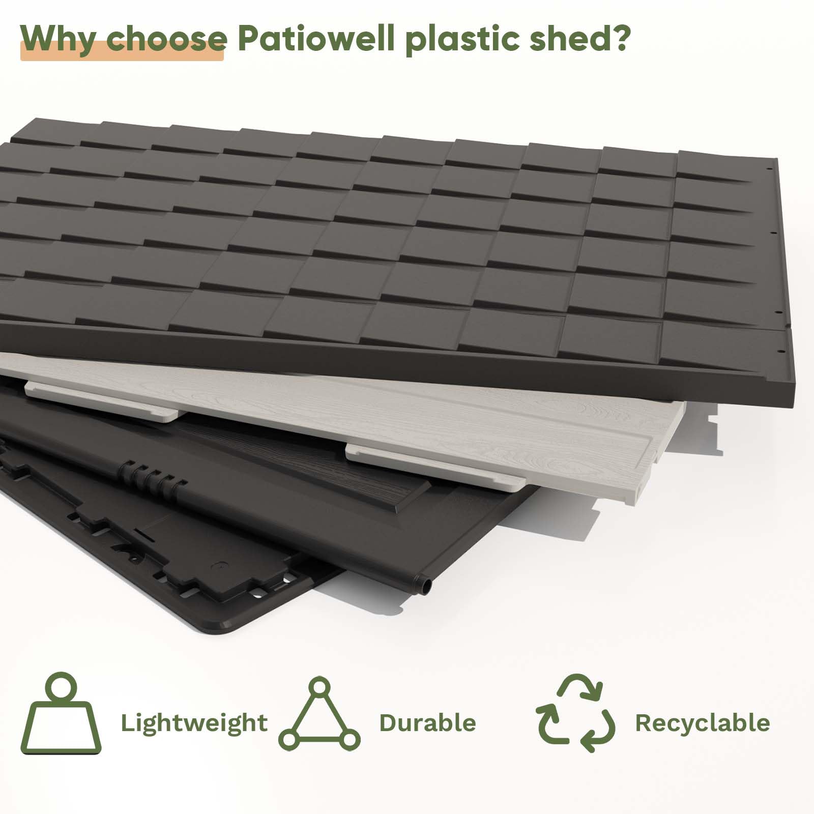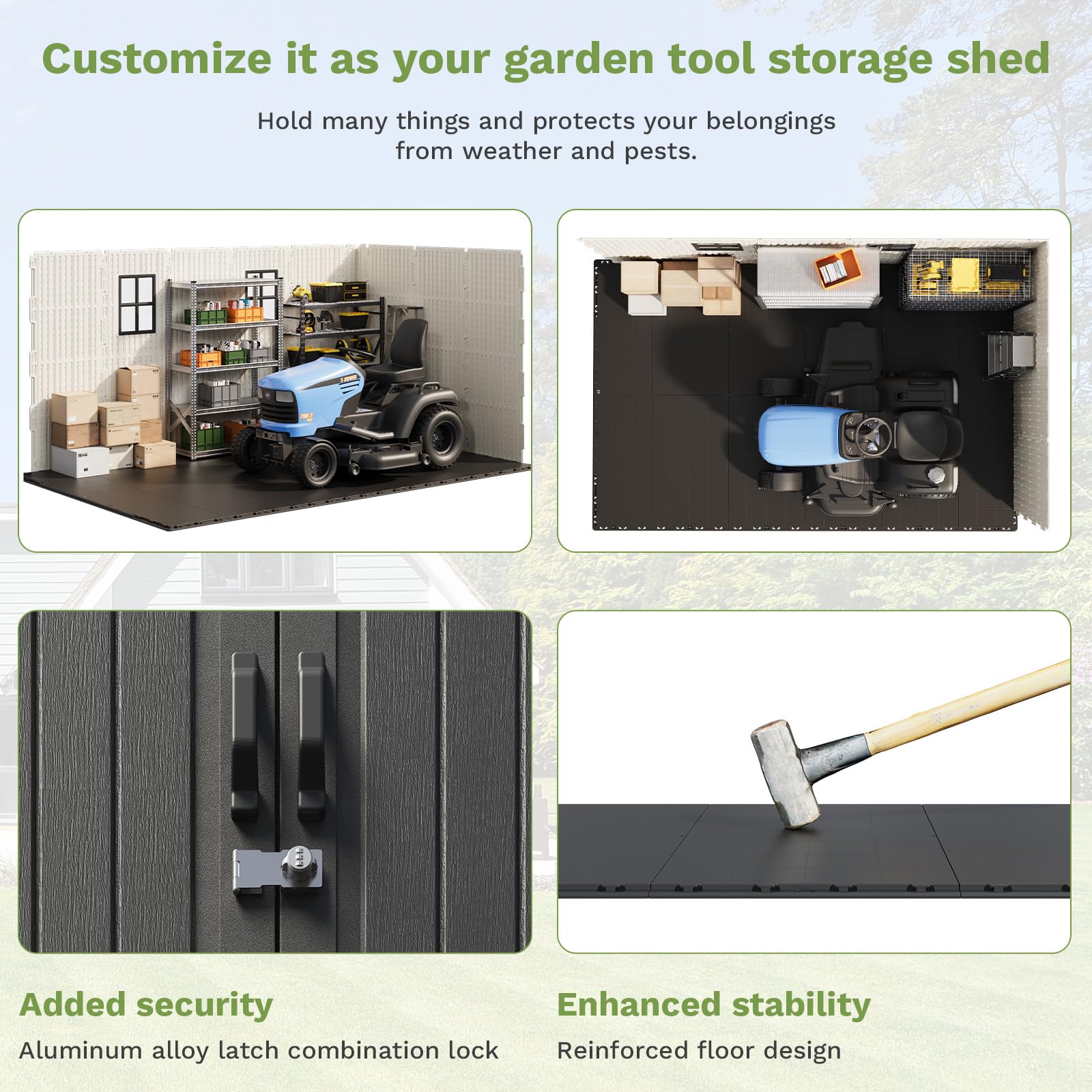 Sturdy Plastic Floor Base for Enhanced Stability: Our shed features a robust plastic floor base, offering a secure foundation for storing your outdoor tools and equipment. It provides added protection against water damage and moisture, keeping your belongings safe and dry.