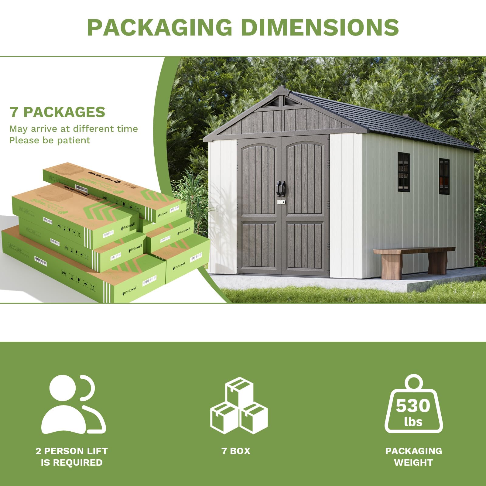 Description: Patiowell 8'x12' plastic shed is a sturdy and durable storage solution for your outdoor space. Made from durable plastic material, it is designed to withstand the elements and provide long-lasting protection for your belongings. The shed features a spacious interior with ample room for storing gardening tools, lawn equipment, bicycles, and more. It has two large, lockable doors that open wide for easy access and ventilation. Our plastic shed design is a game-changer. It's simple and time-saving. It drastically reduces the number of screws needed by 30%, making assembly quicker and easier with minimal tools required. Its neutral color and stylish design make it a great addition to any backyard or garden area. Specifications: Product Dimensions: 91.3”L x 144.3”W x 94.5”H Weight Capacity: 1300LBS Material: Plastic & Resin Color: Gray and White Package Included: 1 x Storage Shed 1 x Tool gloves Product instruction & Hardware set Note: All of our products are in good condition before shipment. Please find us if you have any quality problems, we will help you.