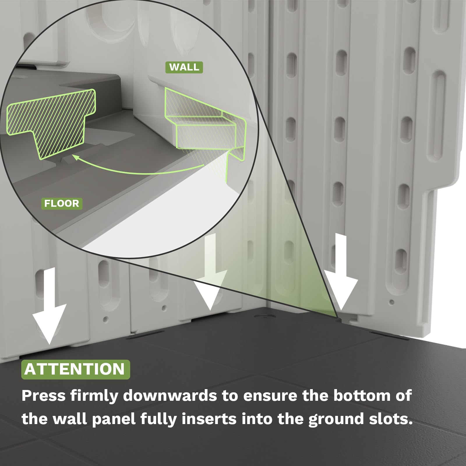 Interesting “Kick-it” Installation Process: This shed reduces the number of screws needed by 30%, making assembly quicker and easier. * When installing wall panels with a kicking action, press firmly downwards to ensure the bottom of the wall panel fully inserts into the ground slots. As shown in the video, once the bottom of the wall panel aligns perfectly with the ground, proceed with the kicking action.