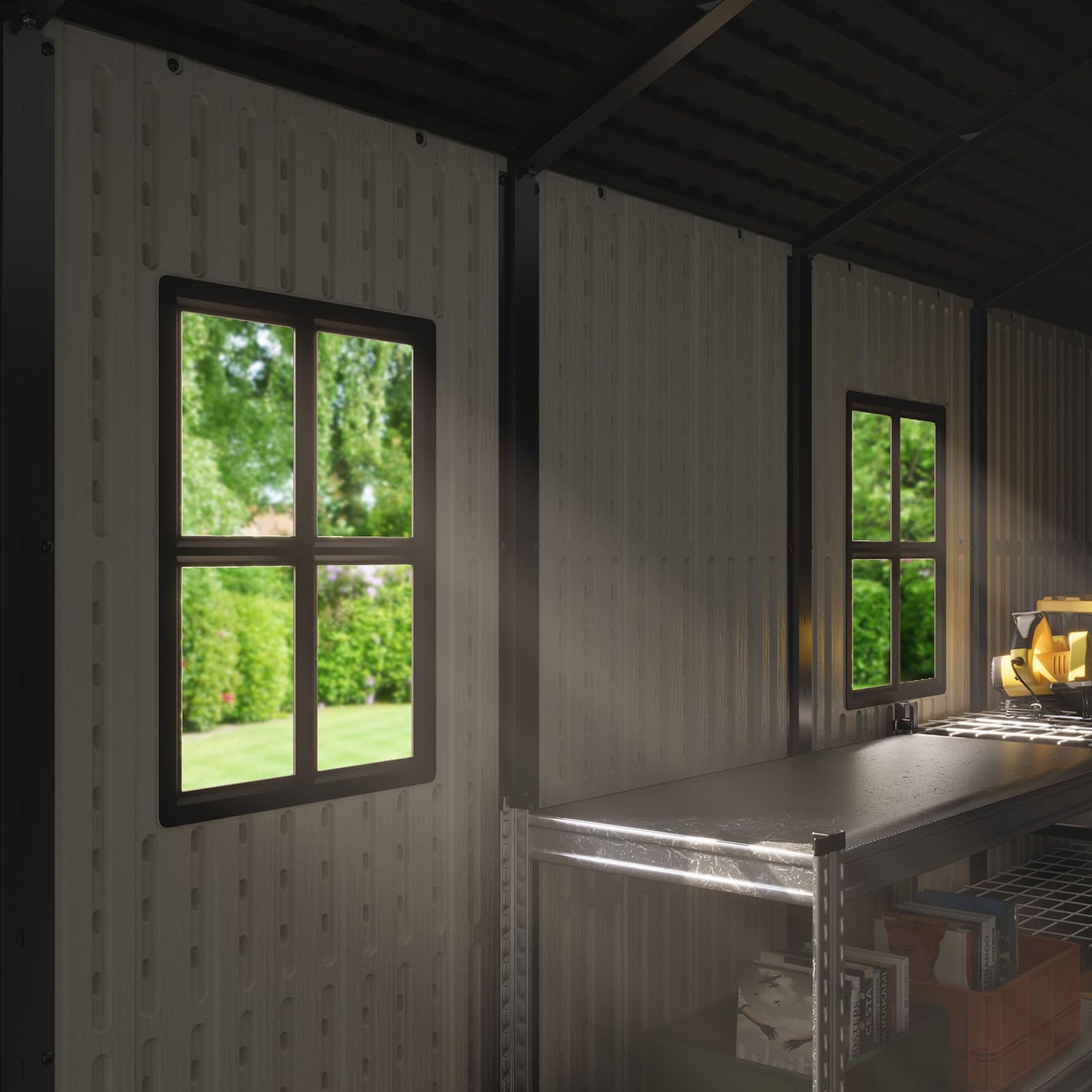 Four Windows Design: Allows natural light to illuminate the interior, reducing the need for additional lighting; Provides a pleasant view of the surroundings; Enhances security by allowing visibility of the shed's contents. And the position of the window can be adjusted according to your needs with the wall panel.