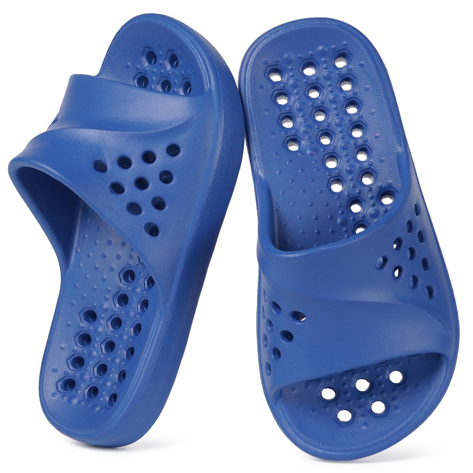 COMFORT & RELAX – The shower slides have soles with a upwarp designed for ergonomic support, relieve the pressure brought by toes when walking, they are comfortable to wear. The upper soles have tiny little bumps that stimulate your feet a little bit which helps to get the blood flowing, help to make your feet feel better and more relaxed.