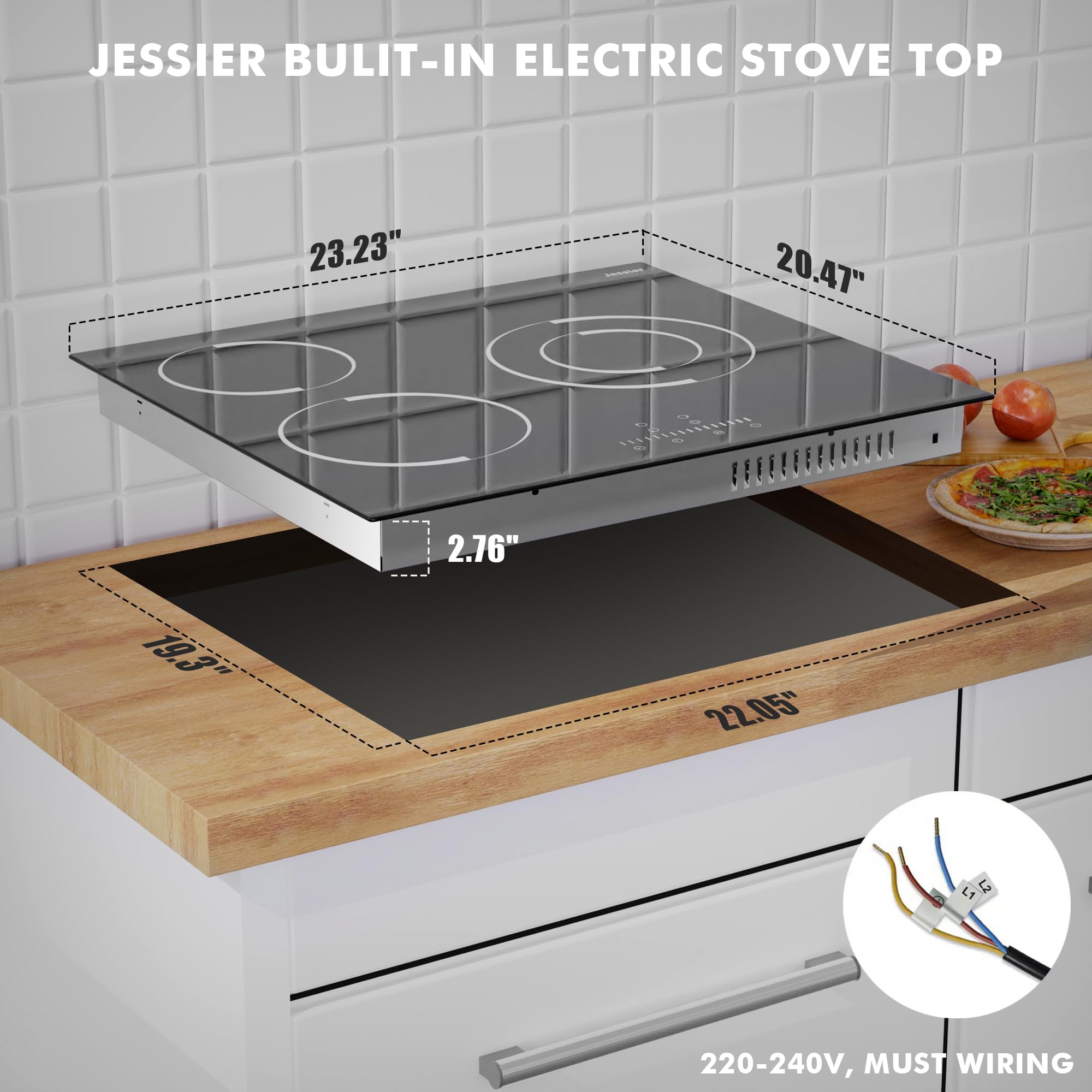 【Drop-in Electric Cooktop 220v-240v】Jessier electric ceramic stove provides a high power add up to 5200W. To achieve such a high power, this 24'' electric stove top needs to be connected to 220-240v. But it comes without a plug, so it would be better you find an electrician for help. The glass electric cooktop is built-in design installation, so please make sure the cut-out size is suitable before purchase: Product Size: 23.23"L × 20.47"W × 2.76"H, Cut-out Size: 22.05"L x 19.3"W.