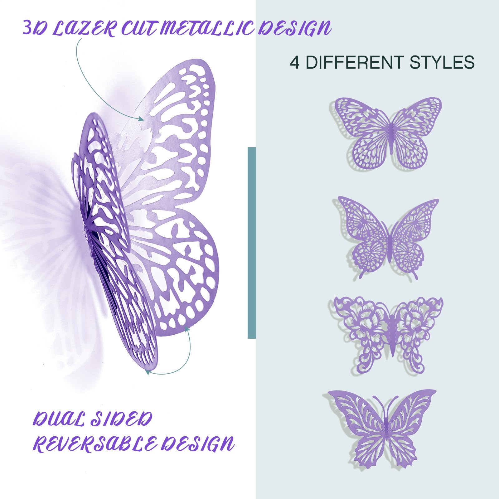 What You Get - 48pcs new design metallic butterfly decors in 4 styles. Each style has 3 sizes in 12cm (4.72) of large, 10cm (3.93”) of medium and 8cm (3.15”) of small, and every size have 4 pieces. The package also contains 48 pieces of removable double-sided adhesive.