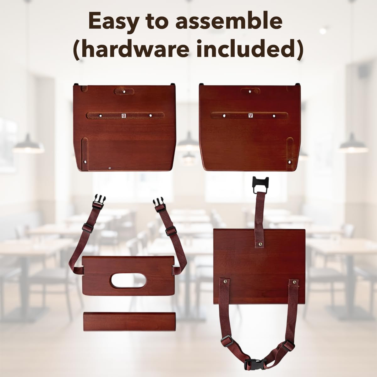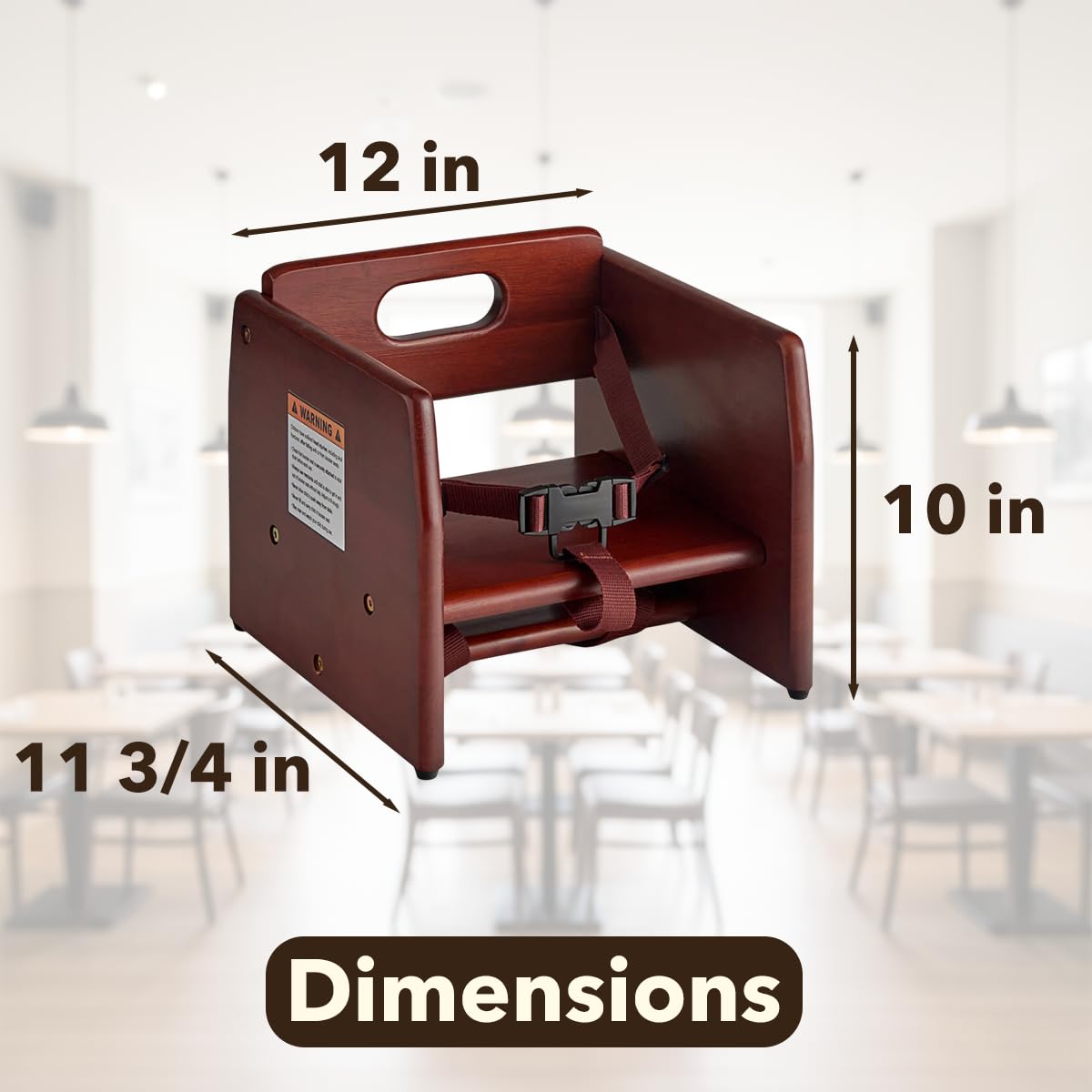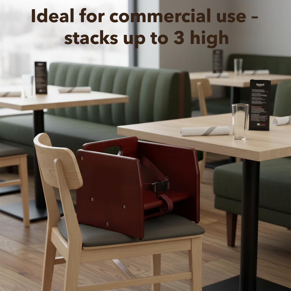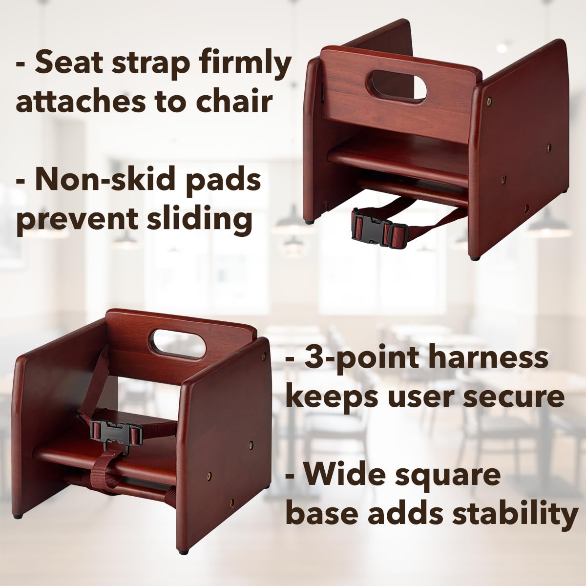 Enhance your dining area with this wooden booster seat, available in multiple finishes to match any restaurant, cafe, or banquet décor. Built from durable rubberwood, it features a 3-point harness, chair strap, and non-slip pads for secure seating and stability. The smooth wood surface is easy to clean, while the rounded edges provide comfort and a polished look. Lightweight with an easy-grip handle, this seat can be stacked up to three high for compact storage. Ships unassembled with hardware and tool included for quick setup. Available finishes: Black, Mahogany, Natural, Dark Brown, Walnut. Q: What material is it made from? A: Solid rubberwood with a protective finish for durability and smooth appearance. Q: How is it secured during use? A: Includes a 3-point harness, chair strap, and non-slip pads for firm placement. Q: Is assembly required? A: Yes, it ships unassembled; all hardware and tool are included. Q: Can it be stacked? A: Yes, up to three units high for convenient, space-saving storage. Q: Where can it be used? A: Ideal for restaurants, cafes, hotels, and banquet halls.