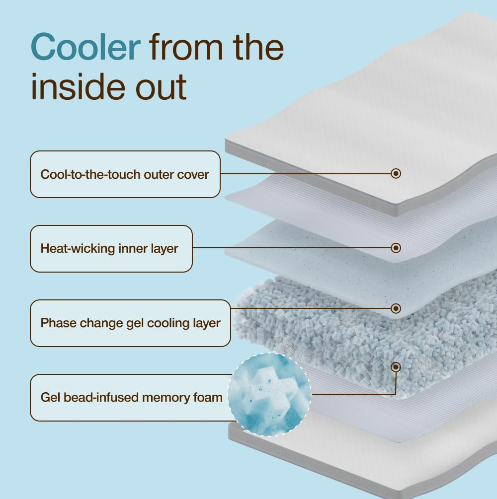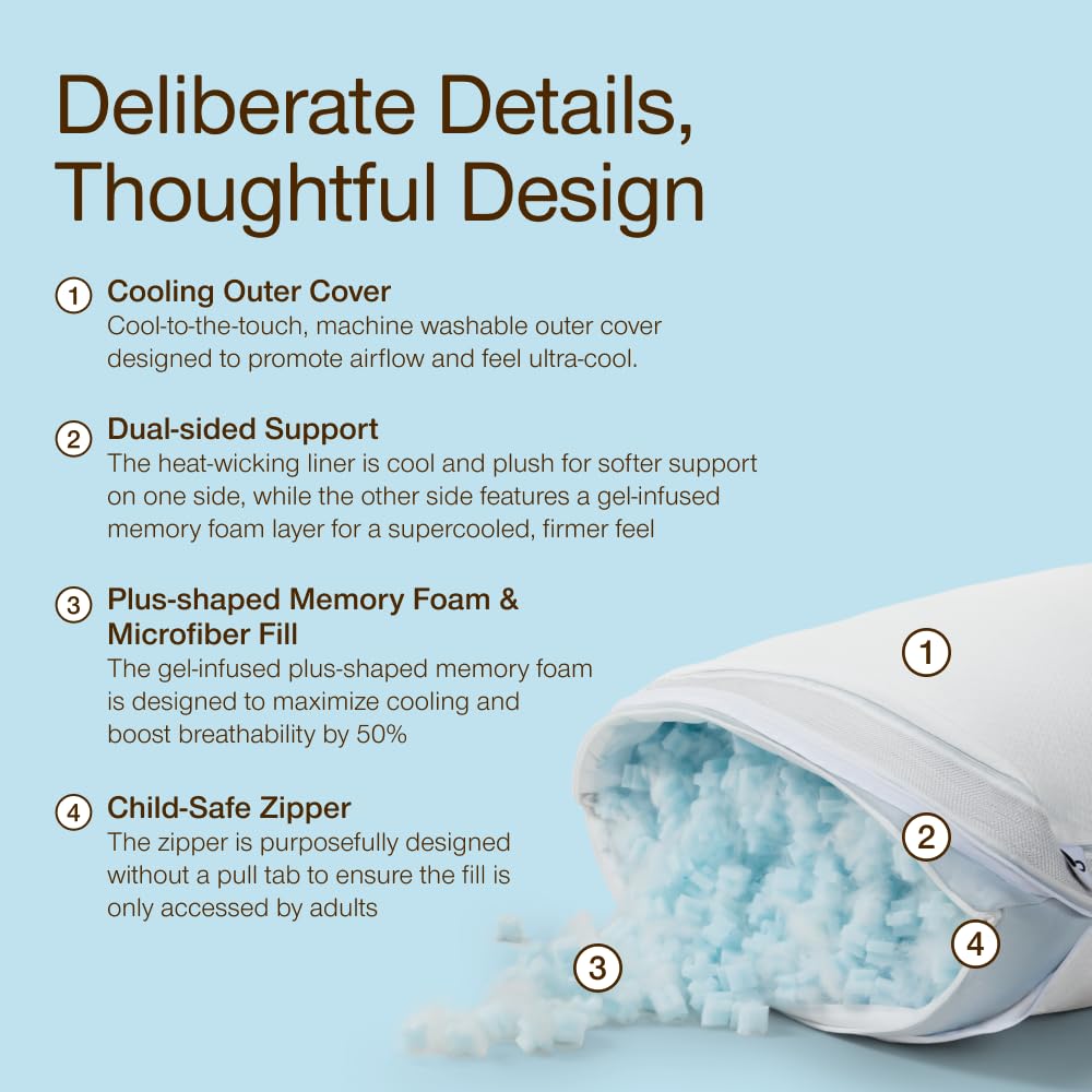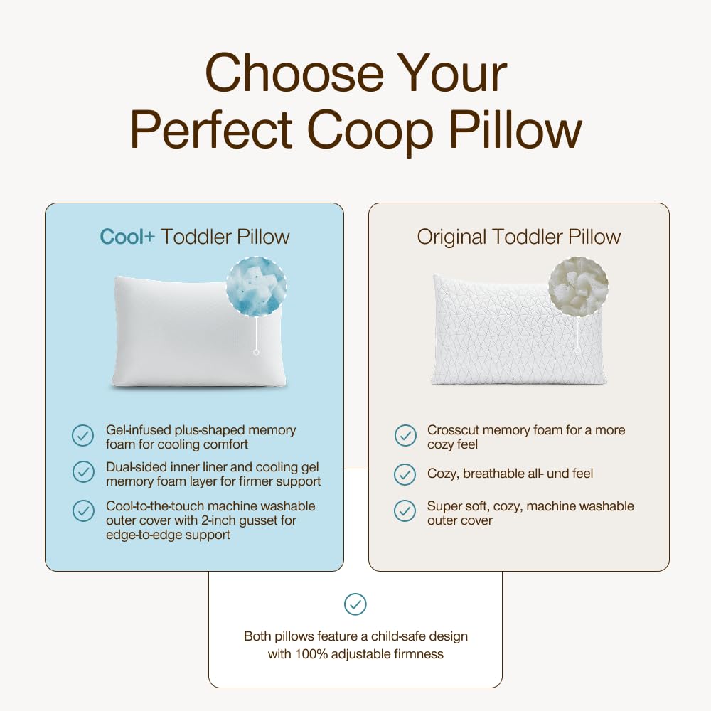 Advanced Cooling for Growing Sleepers: We took everything that makes our best-selling adult-sized cooling pillows great and miniaturized it for little sleepers. The Cool+ Adjustable Cooling Toddler Pillow is designed for kids ages 2 and up who tend to sleep hot and sweaty. Itβs packed with our revolutionary Cool+ gel-infused plus-shaped memory foam and microfiber fill, an ultra-breathable heat-wicking liner, and a dual-sided, cool-to-the-touch cover making it perfect for little ones.