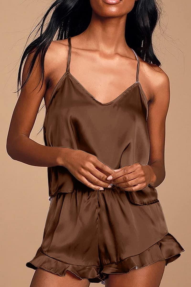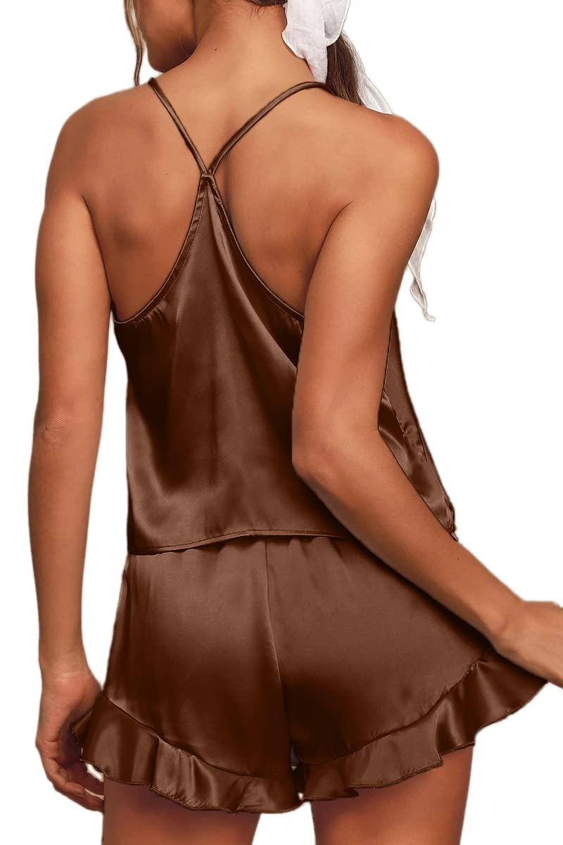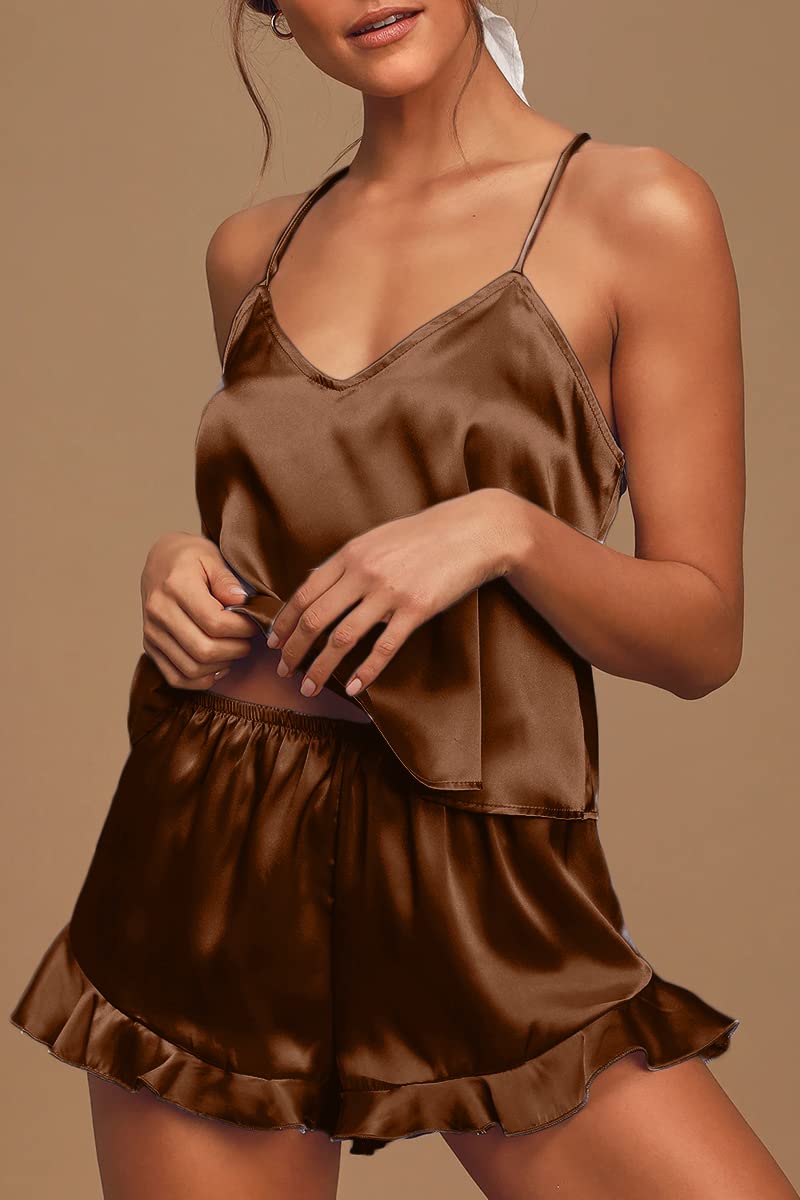 The cute satin silk cami pajamas tops features v neck,low cut,racerback,adjustable straps,the shorts features high waisted,elastic waist,casual loose style.The cute and sexy pajamas sets will make you look more flattering,elegant for your sweet night.