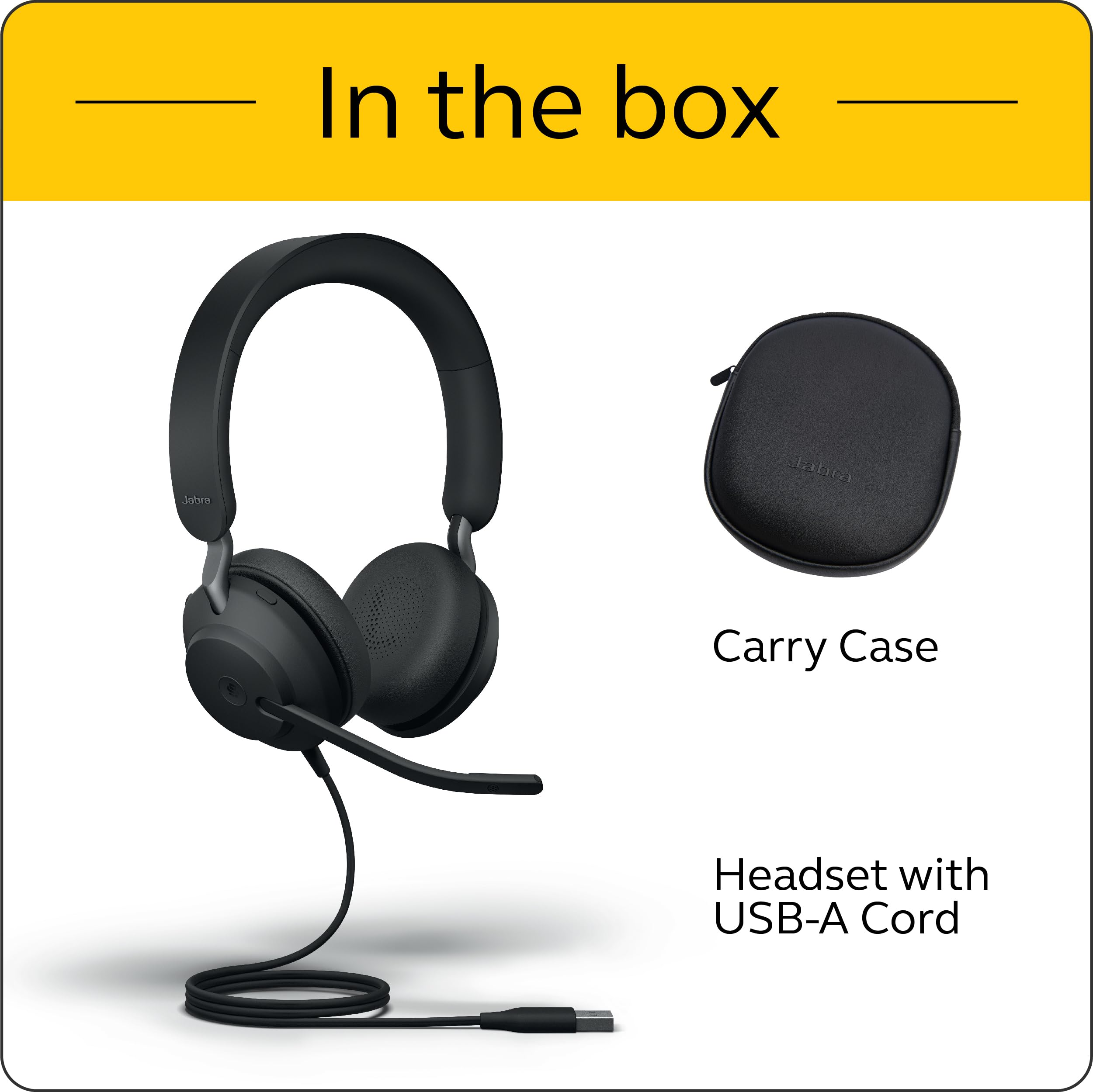 With exceptional audio, outstanding noise isolation, and superior comfort, Jabra Evolve2 40 is engineered to keep you on task. This wired headset features superior passive noise cancellation thanks to the enhanced memory foam padding and new angled design that cancels more than 48% more of the noise around you. Put on your Evolve2 40 and feel the noise around you instantly fade, leaving you with the quiet you need to focus. Plus, this pro headset has powerful leak-tolerate 40mm speakers for rich, high-definition audio for calls and music. With strategically placed and powerful microphones built right in, youβre sure to experience clear and professional sounding calls every time.We set out to make an on-ear headset that would feel so great, youβd forget you were even wearing it. We designed the perfect shape using biometric measurements from hundreds of heads. Then we added soft memory foam cushions that mold to your earsβ natural contours for all-day comfort.Weβve also taken our busylight to the next level, making it visible from every direction. The red light is automatically activated when youβre on a call or in a meeting, or you can activate it yourself at the touch of a button. So, even when youβre right in the middle of everything, the busylight on this call center headset will protect you from all angles, and all interruptions.Jabra Evolve2 40 is a superior office headset thatβs engineered to keep you focused and ready to collaborate. It works with all leading Unified Communications platforms, including Microsoft Teams, Cisco, Mitel, Avaya & more for truly seamless collaboration.