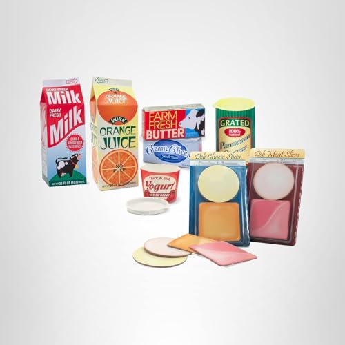 Includes 8 grocery packages (milk, OJ, butter, cream cheese, yogurt, parmesan cheese, deli meat, cheese slices) and 12 slices of play food meat and cheese