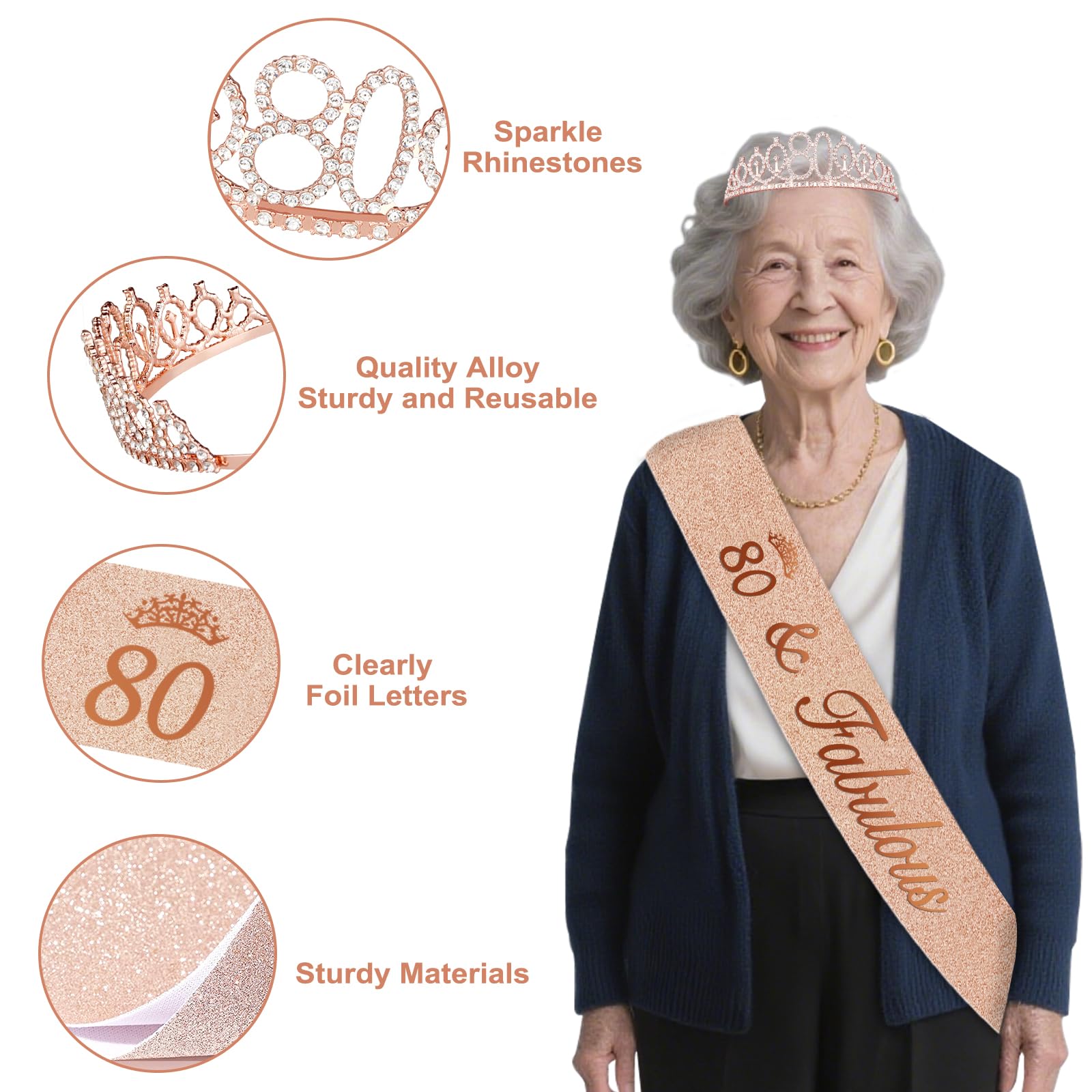 Sparkling 80th Birthday Tiara and Sash: The 80 birthday Crown is made of rose gold alloy and rhinestones. This 80th birthday tiara dimension is 5.0'' on the front side which one size fits all. The glitter rose gold 80th birthday sash for women is in 63 inch length and comes with a safe gold pin that you can easily adjust the length in need. This elegant 80th birthday sash and crown will make the 80 year old women stand out