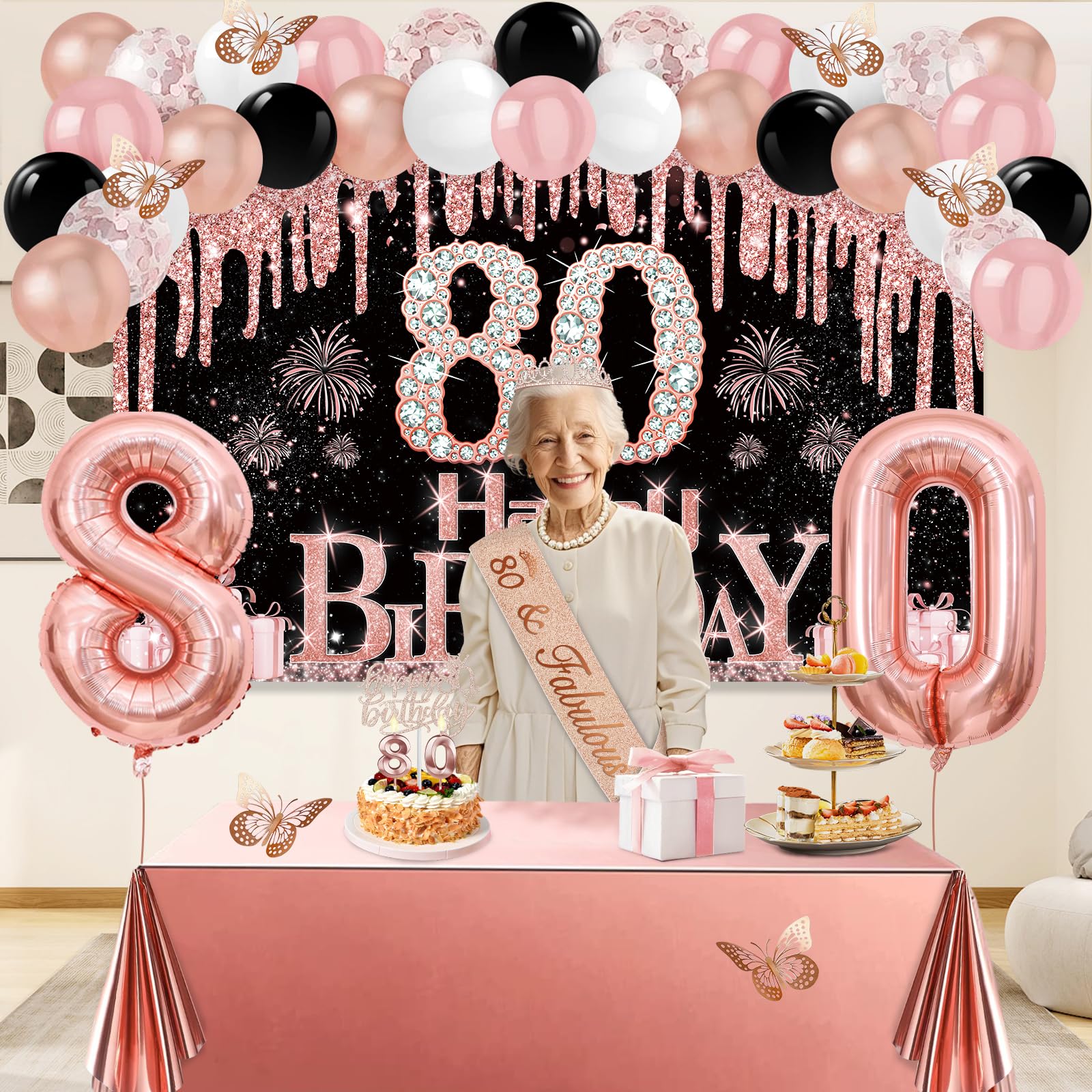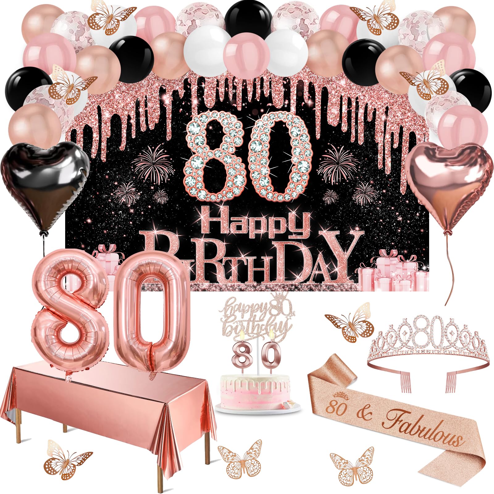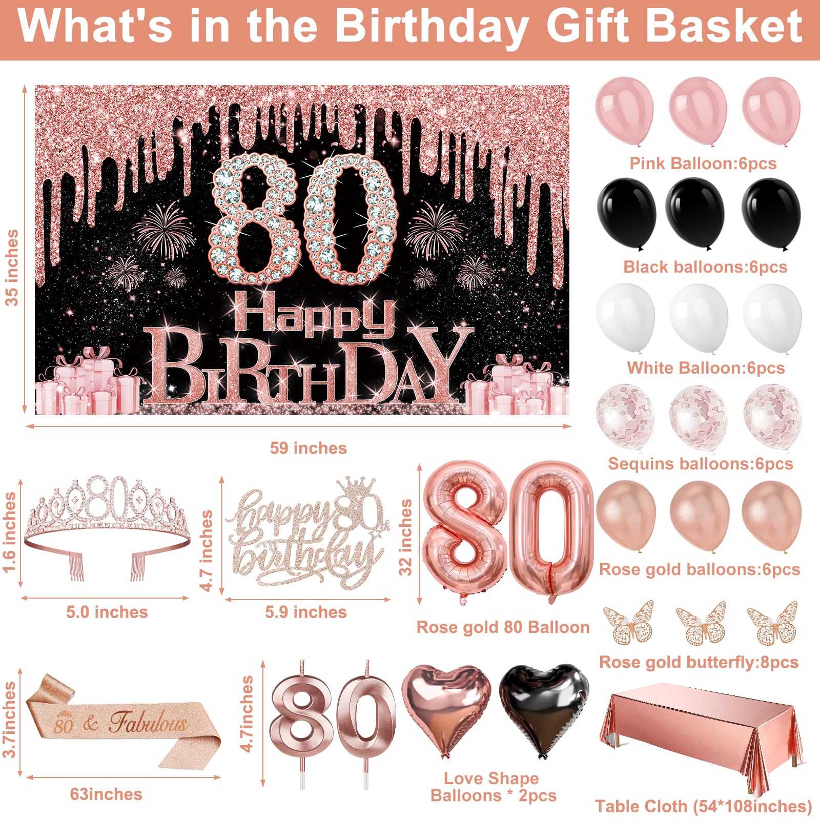 80th Birthday Decorations: Package coming with 80th Birthday Banner *1pc, 80th Birthday Tiara *1pc, 80th Birthday Sash *1pc, 80th Birthday Cake Topper *1pc, 80th Birthday Candles *1set, Rose Gold Butterflies *8pcs, Number 80th Birthday Balloons *1set, Love-Shape Balloons *2pcs, Latex Balloons * 30pcs, and Rose Gold Tablecloth *1pc. This complete 49pcs 80th birthday party decoration pack is the best way to meet different decorating needs